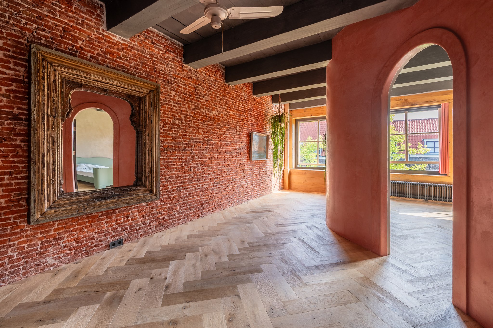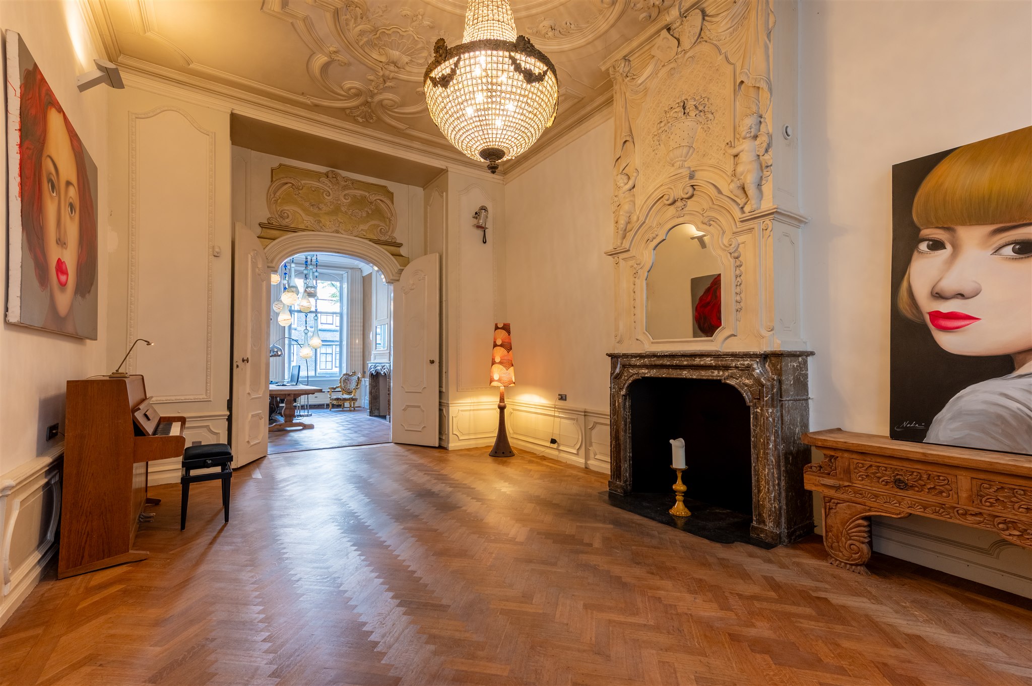 At the front: the grand living room with soaring four-metre ceilings, oak flooring, and a splendid view over the canal and the historic Armamentarium.
