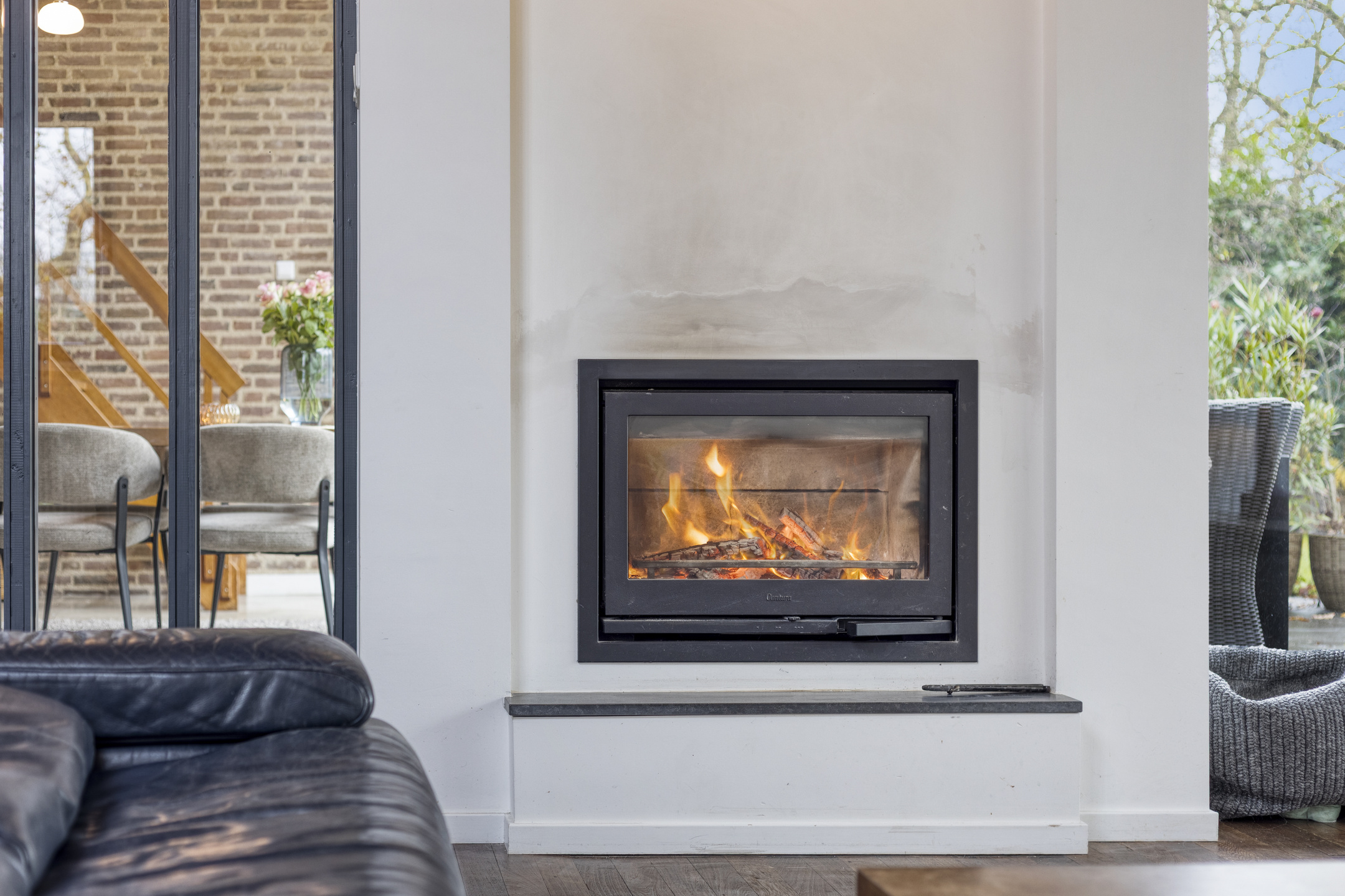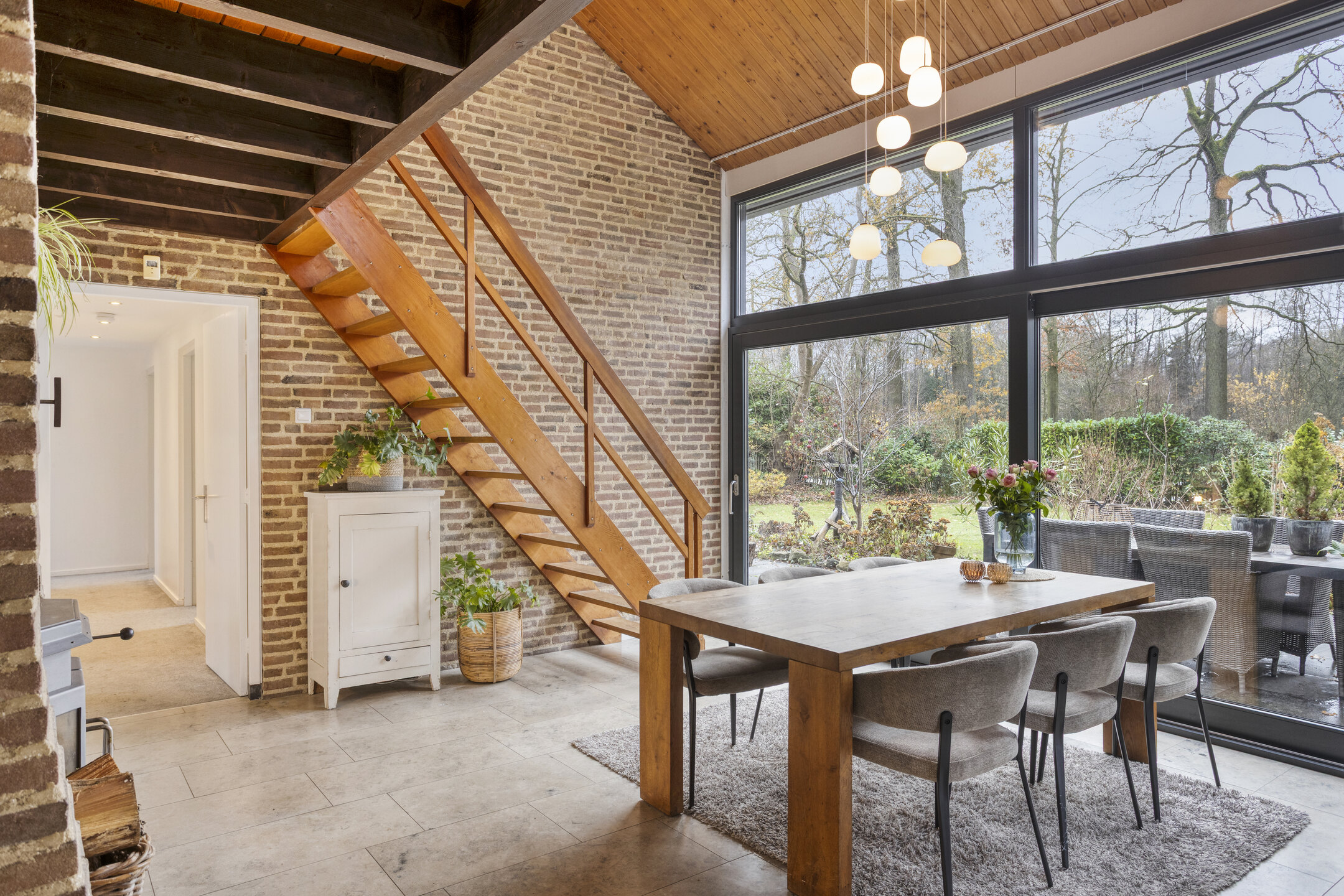 Via de hal kom je in de eetkamer, een lichte en uitnodigende ruimte dankzij de grote schuifpui. De eetkamer is voorzien van een houtkachel. Hier bevindt zich ook de trapopgang naar de eerste verdieping. Vanuit de eetkamer loop je door naar de woonkamer en de keuken. De woonkamer is ook voorzien van een sfeervolle houtkachel. De dichte keuken heeft een speels effect dank zij de bar aan het keukenblad. De keuken is uitgerust met diverse inbouwapparatuur, waaronder een 4-pits inductiekookplaat met afzuigkap, oven, koelkast, vaatwasser, stoomoven, warmhoudlade en een keukenboiler.