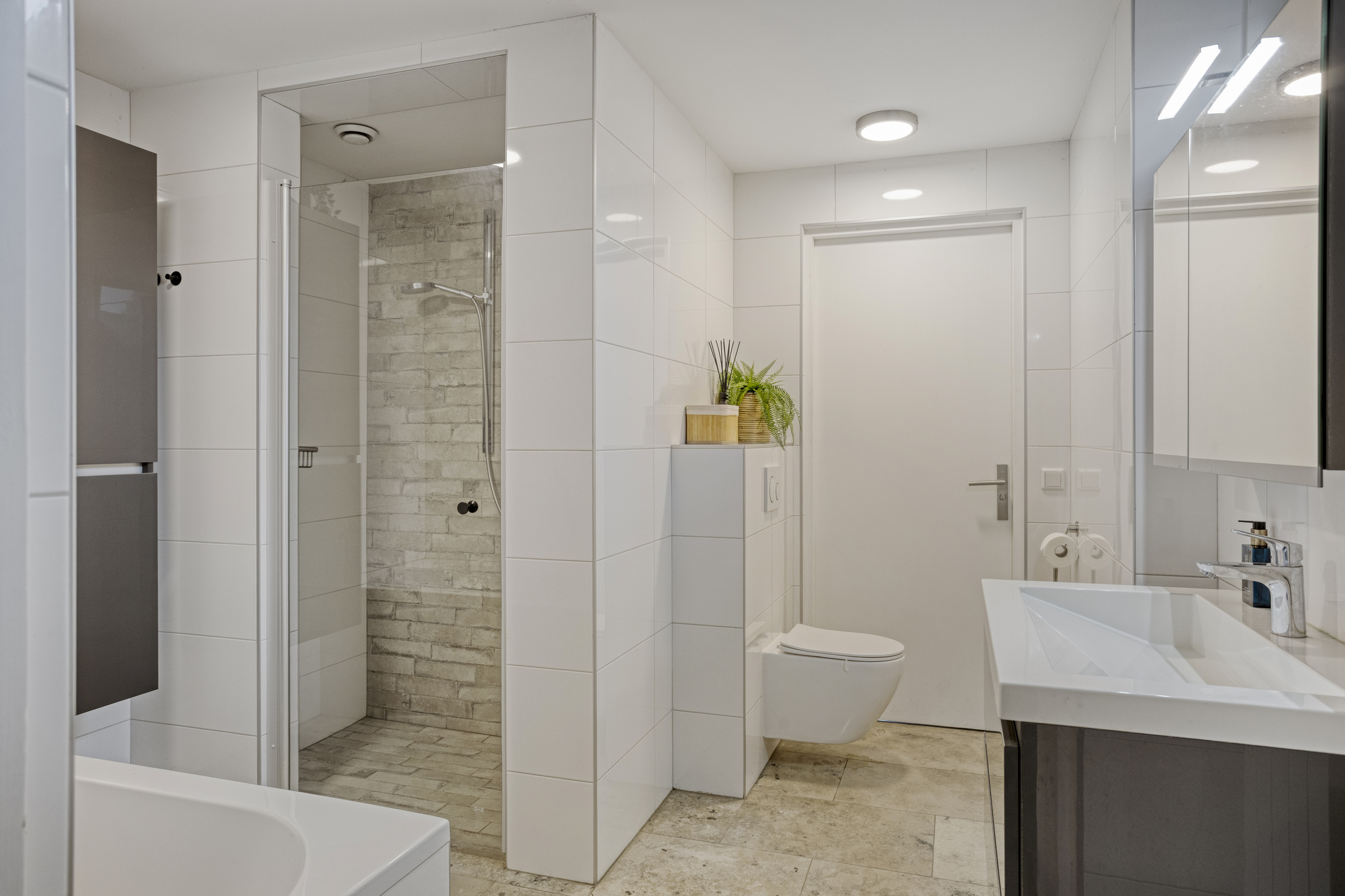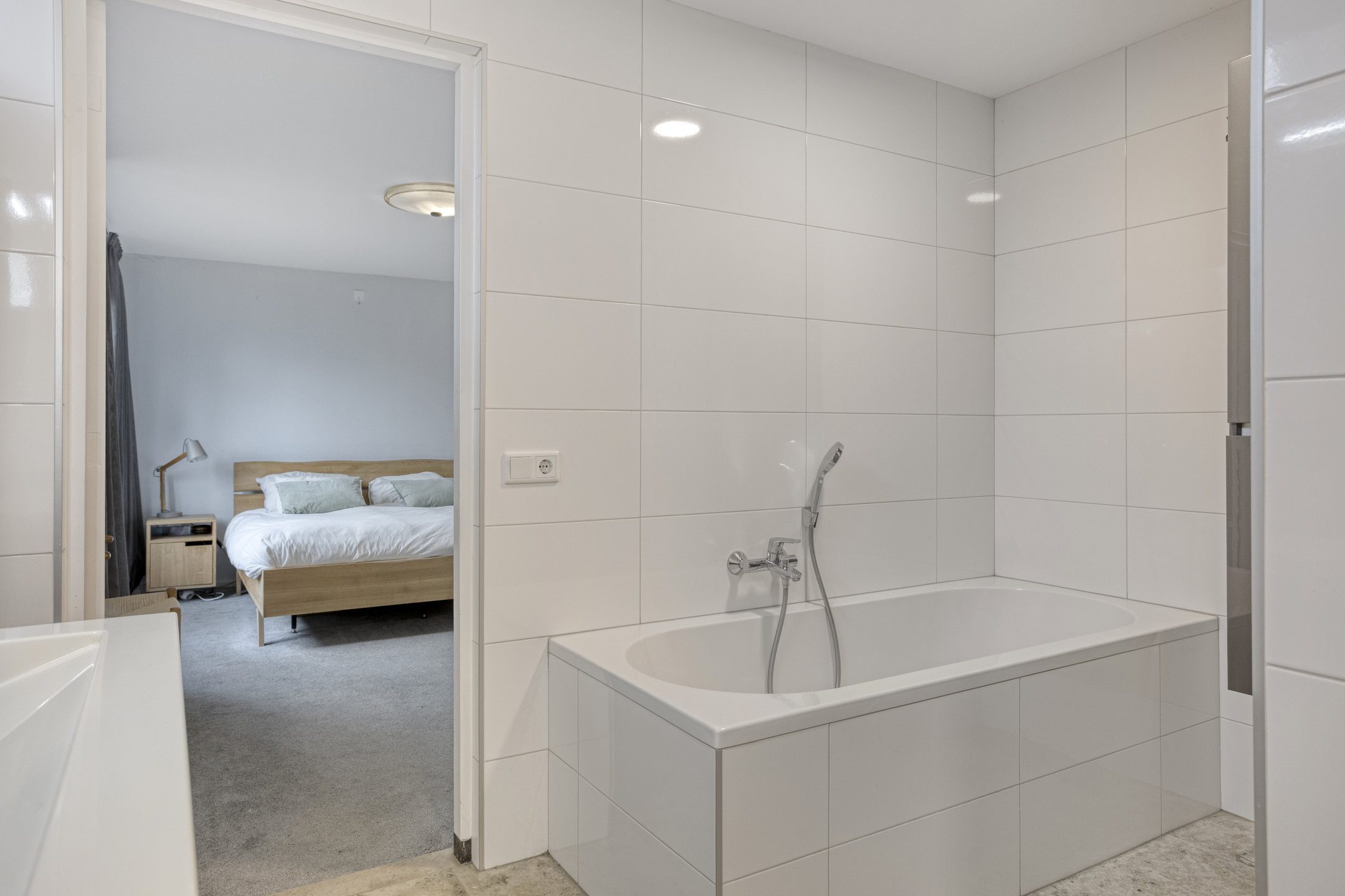 Aansluitend aan de eetkamer ligt een lange gang waaraan vier ruime slaapkamers grenzen. Twee slaapkamers zijn voorzien van een eigen wastafel, de derde slaapkamer heeft wel de aansluiting voor een wastafel. De master bedroom bevindt zich direct naast de badkamer. Deze badkamer is uitgerust met een ligbad, douchecabine, toilet, wastafel met meubel en een designradiator.
