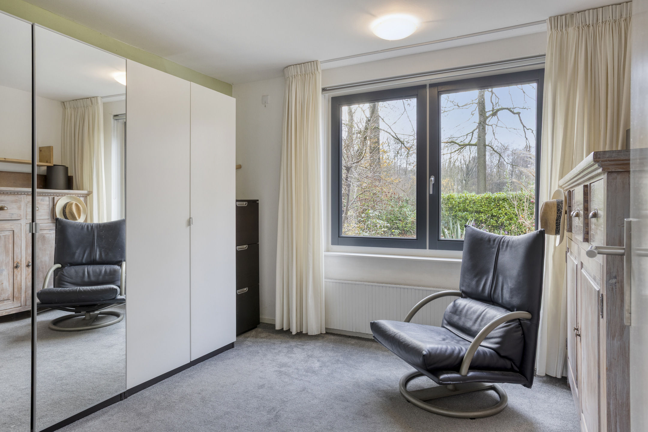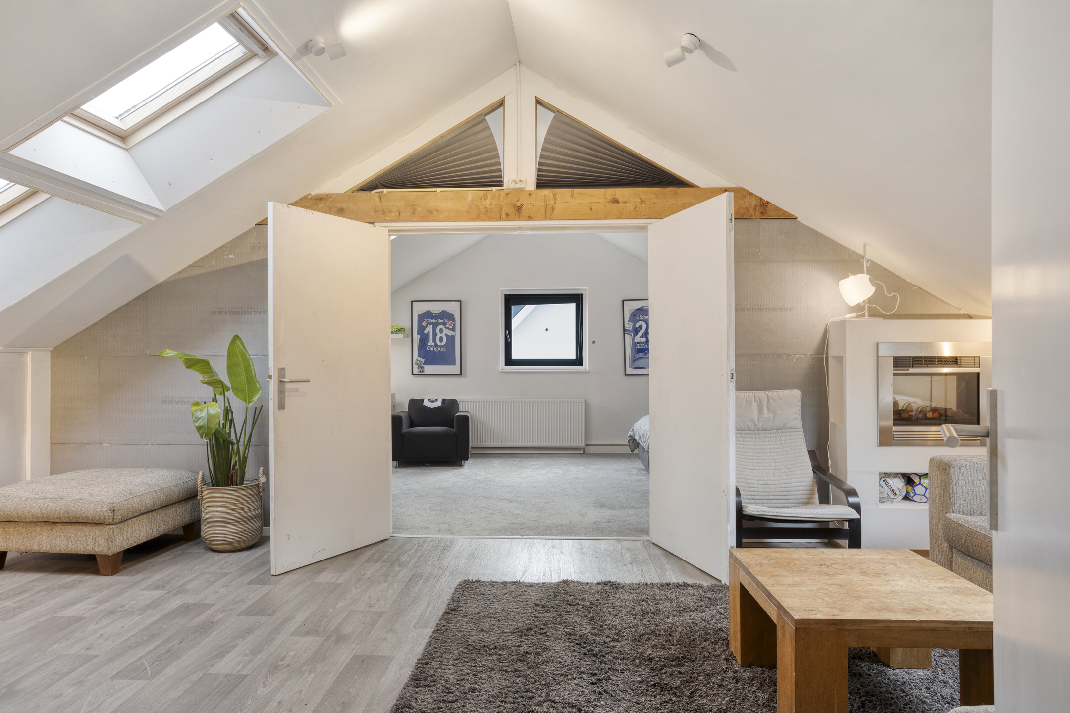 Eerste verdieping: bordes met toegang tot de vide die nu wordt gebruikt als atelier, de berging en de twee hele ruime kamers (30 m²). De berging is voorzien van een wastafel en daar zit tevens de CV-ketel. De ene kamer wordt nu gebruikt als slaapkamer en de ander als extra living. Dit kan uiteraard ook prima gebruikt worden als slaapkamer.
