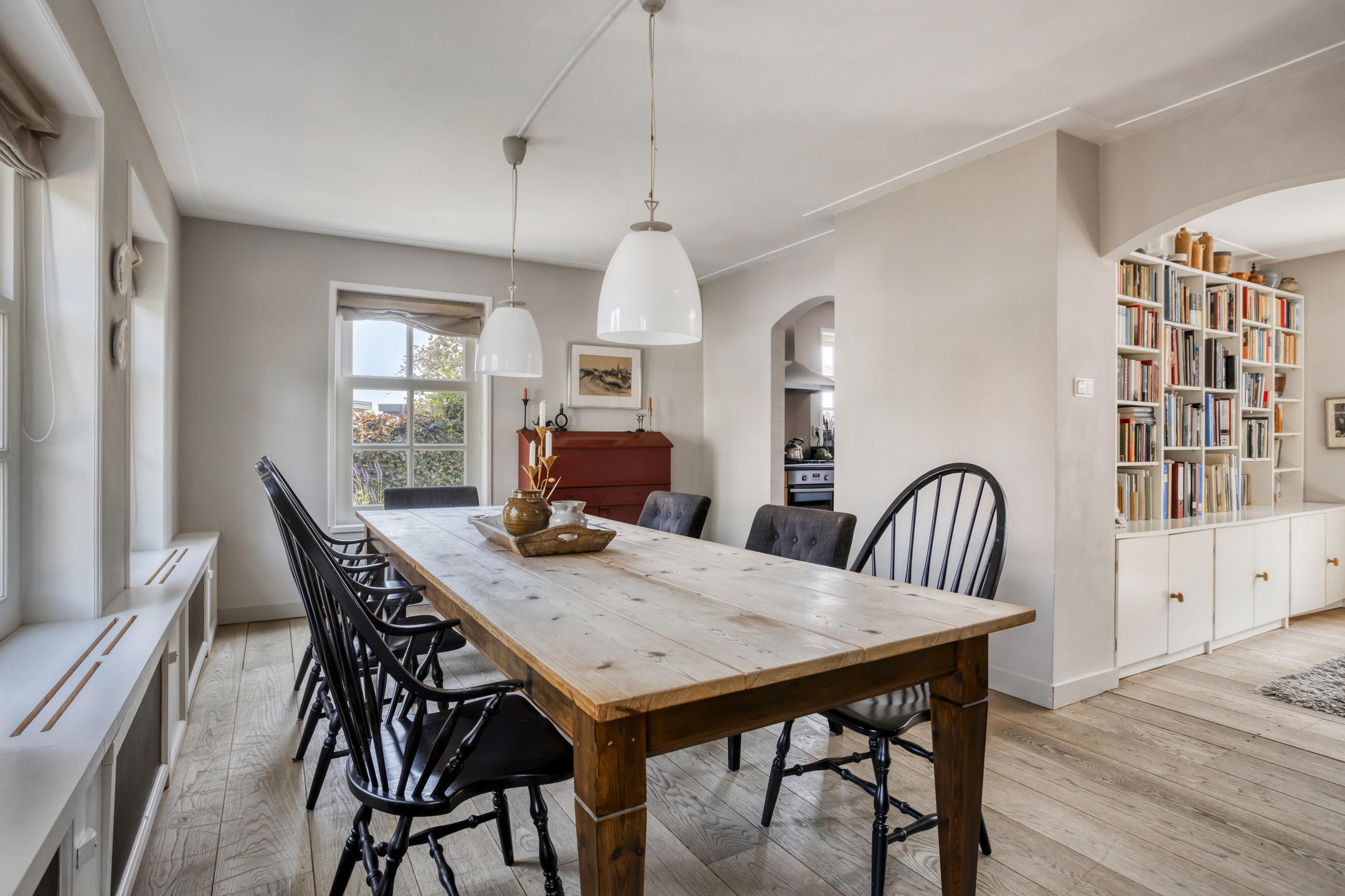 Through the front door, you enter a hallway that leads to the front house. At the front is the semi-open kitchen, equipped with a 5-burner gas hob, oven, dishwasher, and a freestanding fridge-freezer. Adjacent to the kitchen is the cozy dining room with beautiful light from the large windows, forming the warm heart of the home. Next to the dining room is a comfortable living room, which can easily switch functions with the dining room if desired. From the dining room, a staircase also leads to the first floor of the front part of the house.