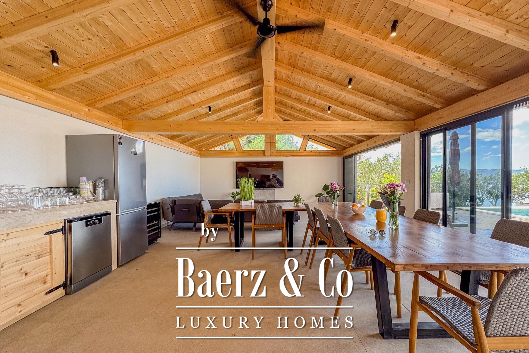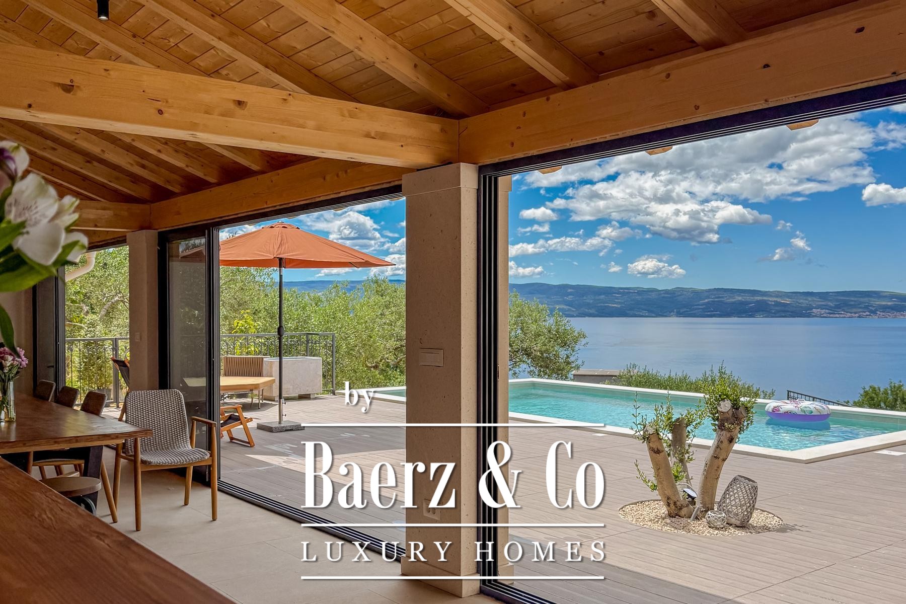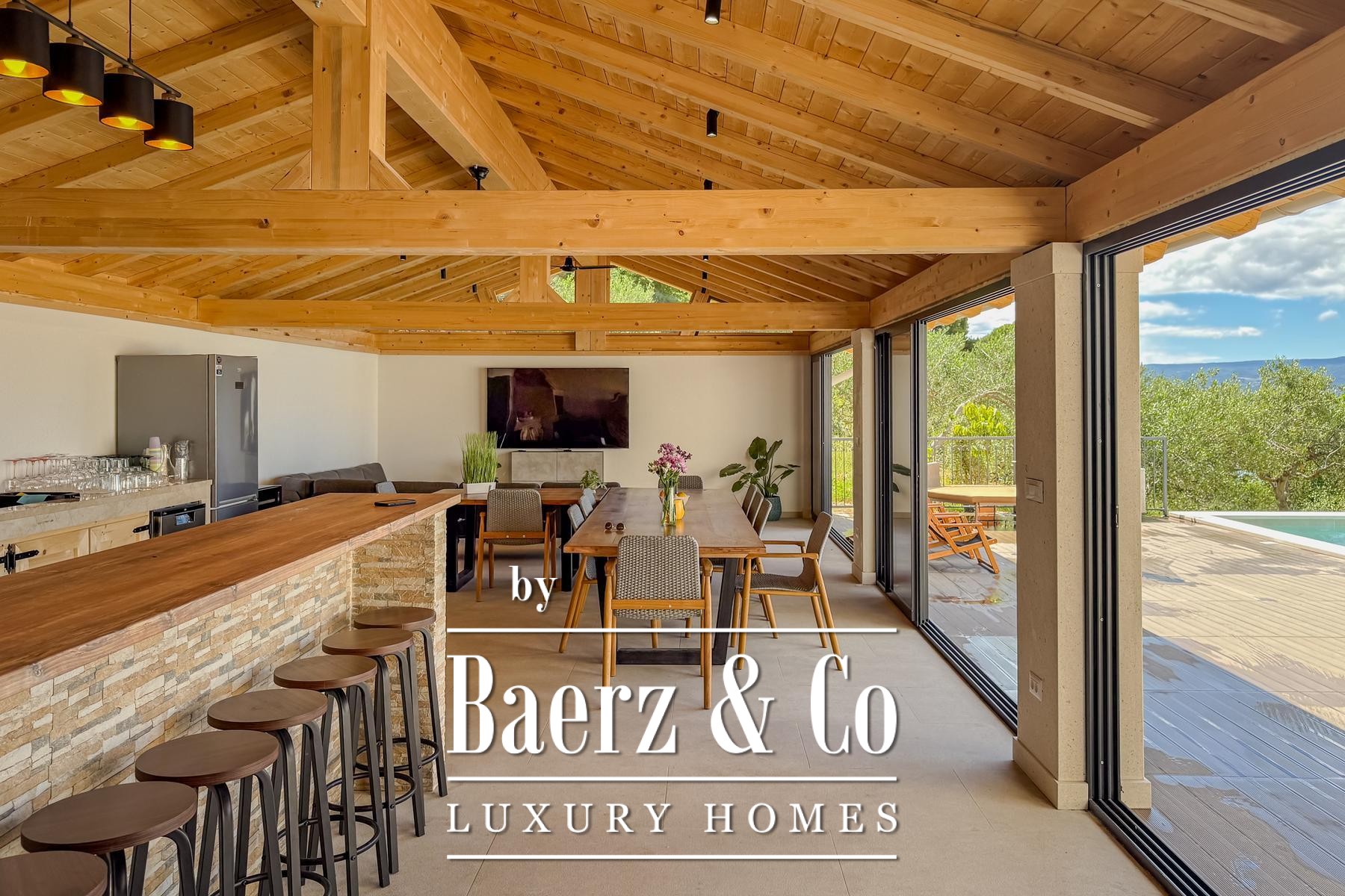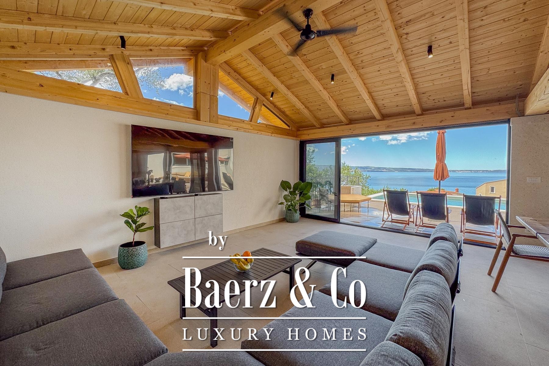 Inside, Villa Jesenice is elegantly arranged across two floors and a gallery, drawing generous natural light into its spaces. The home features five spacious bedrooms and five modern bathrooms, alongside a cohesive living, kitchen, and dining area tailored for comfort and sociable gatherings.