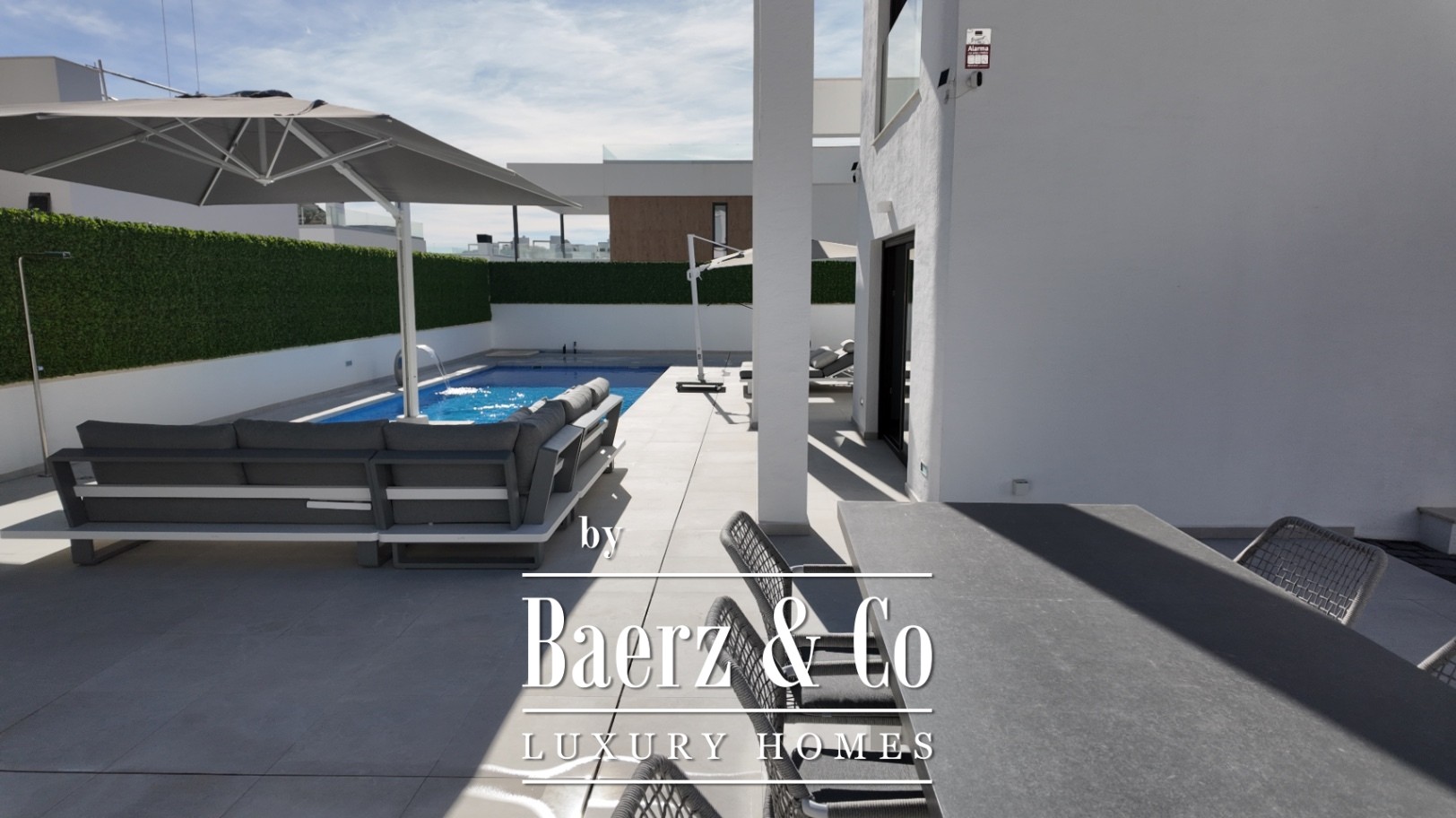 Descending to the semi-basement, a spacious lounge encourages use as a cinema room or personal gym, accompanied by laundry facilities, two further bedrooms, and a bathroom with shower. Outside, the landscaped garden envelopes a private pool and terraces for outdoor relaxation while a fenced parking area offers security and convenience. Two solariums, each with independent access, reveal broad sea and cove views, one equipped with an outdoor shower. This Finestrat villa balances clean lines, double glazing, and intelligent security within a calm residential setting.