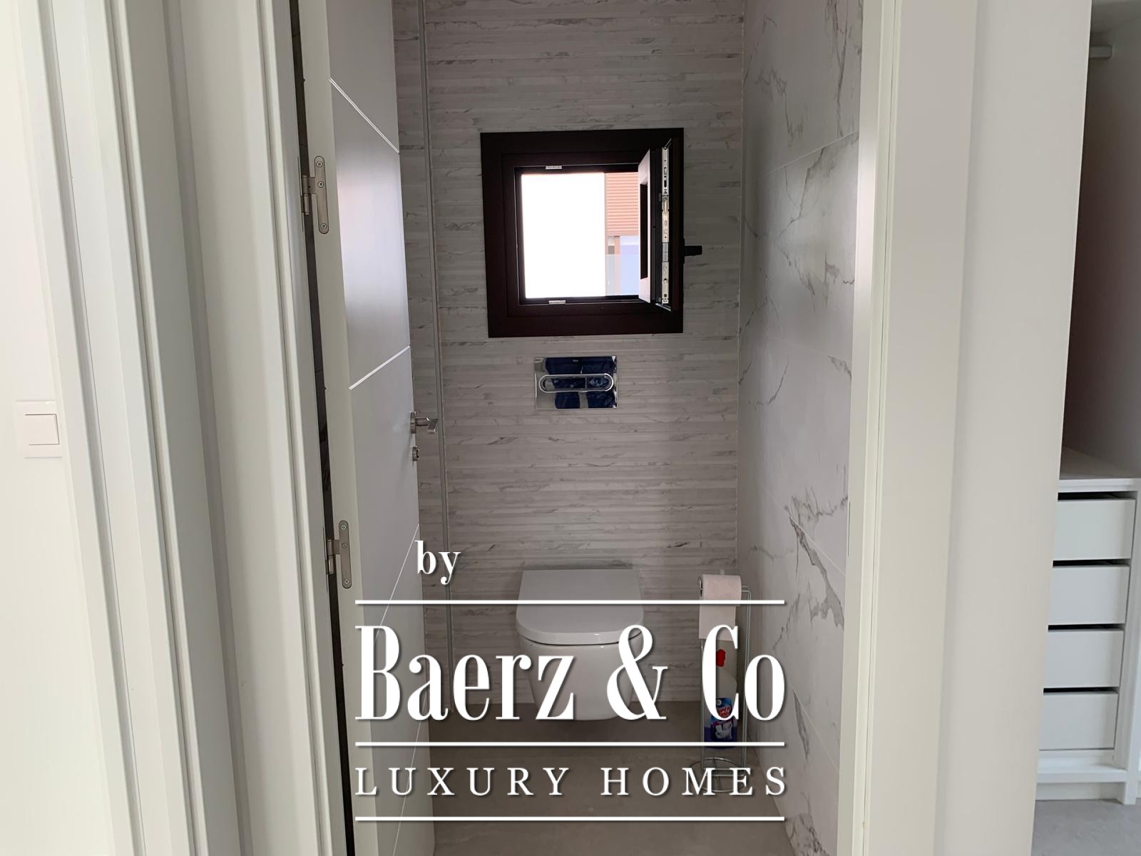 The first floor is anchored by a serene master suite featuring an en-suite bathroom with walk-in shower and a dedicated dressing area, paired with an independent toilet. On the ground floor, a fully furnished open kitchen frames the entrance, leading into an airy living-dining room. Two bedrooms, including one with an en-suite bathroom, complement a discreet guest toilet on this level.
