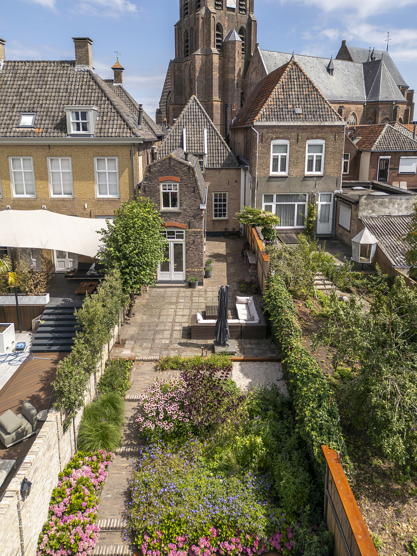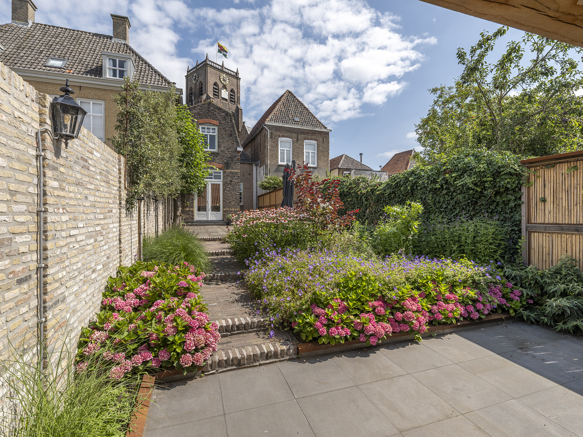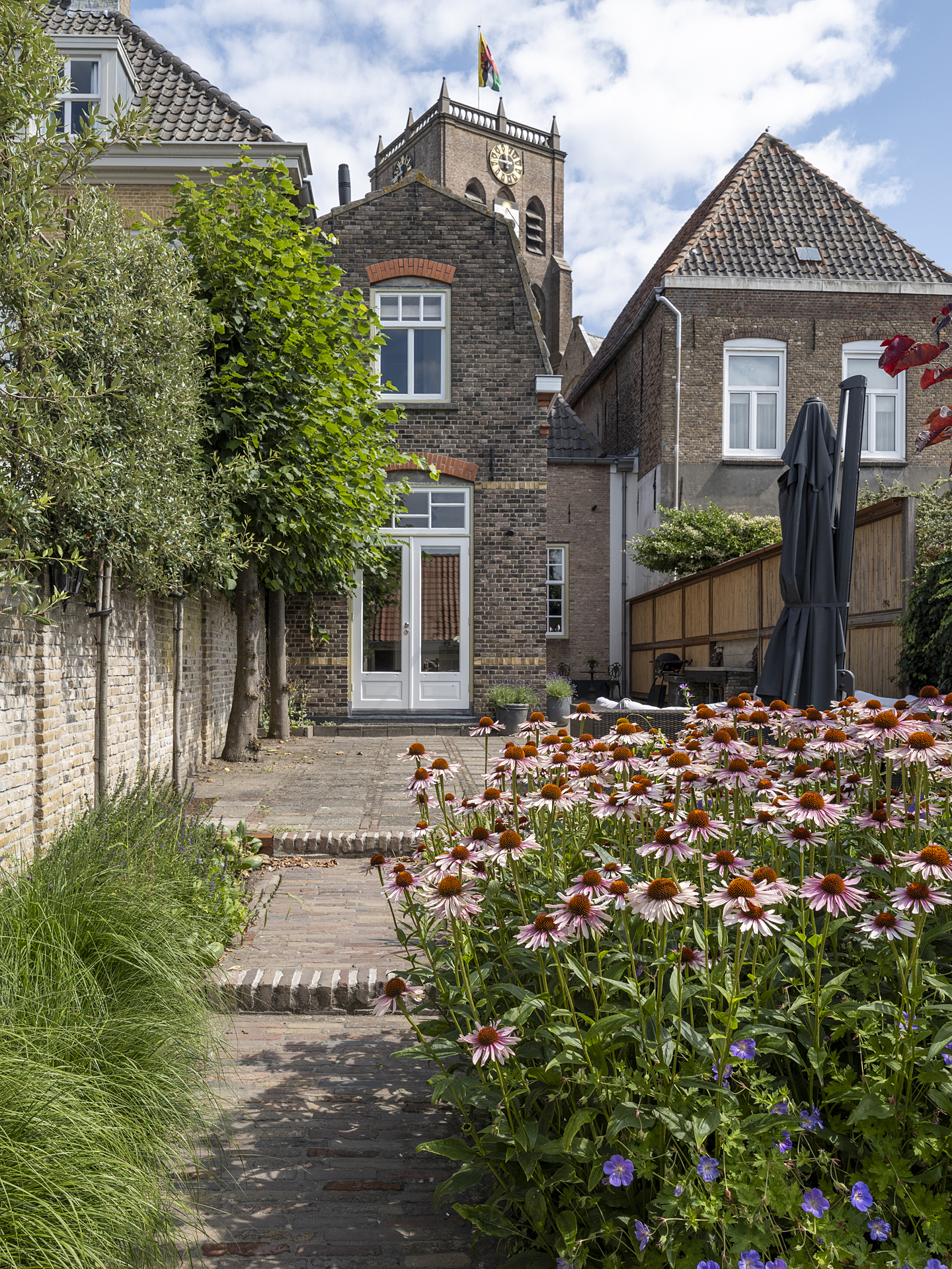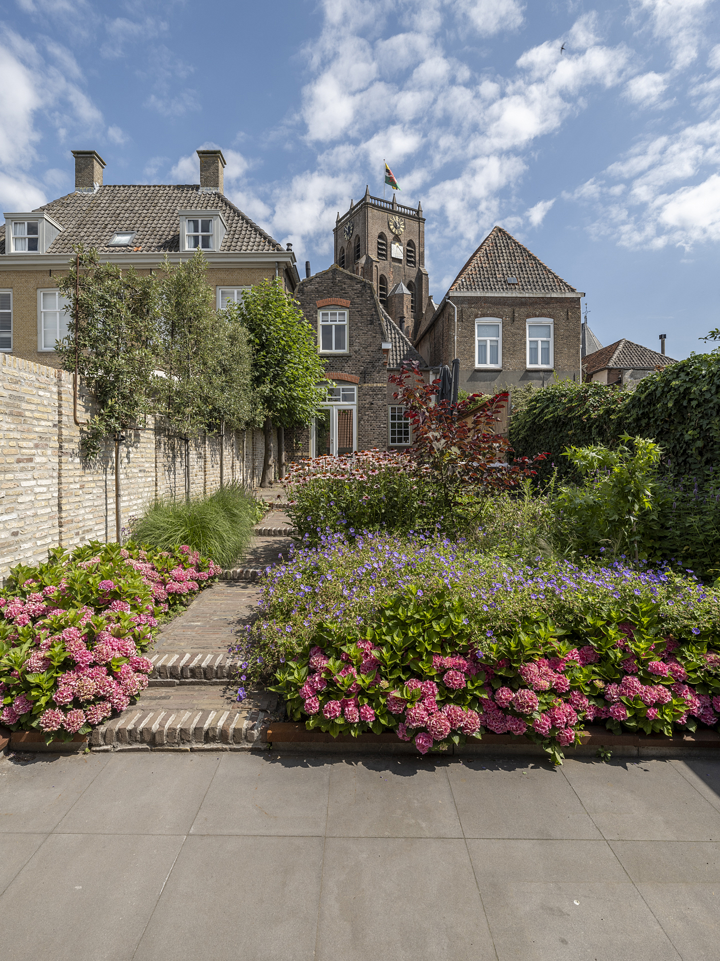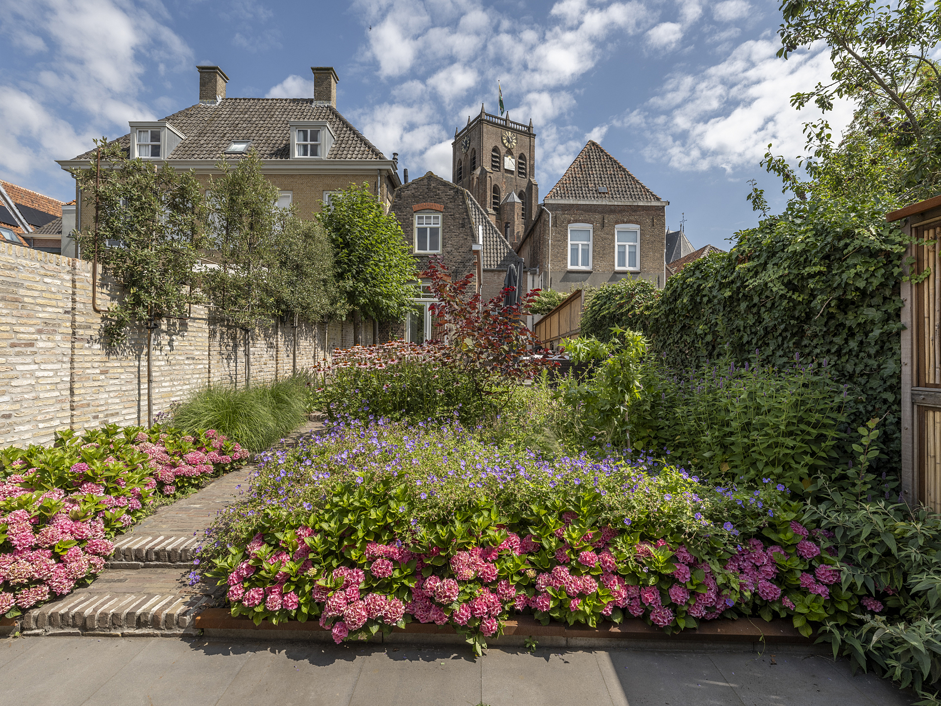 This is a truly atmospheric garden with a nearly Provençal feel, enhanced by views of the house and the monumental church tower.