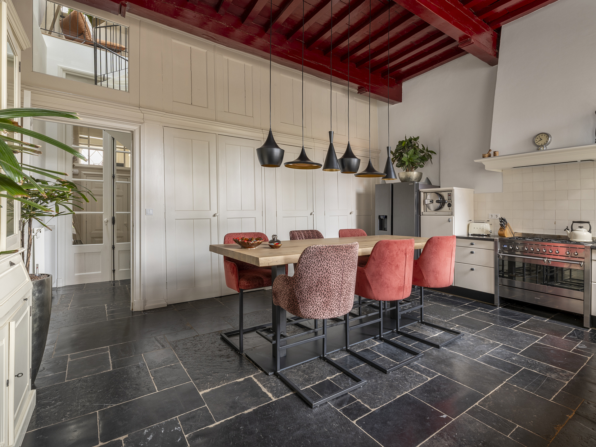 Charming living/dining kitchen with stylish design, including a Belgian bluestone worktop with double porcelain sink, Quooker with sparkling water, 90cm-wide gas stove, double oven, extractor hood, steam oven, and refrigerator.