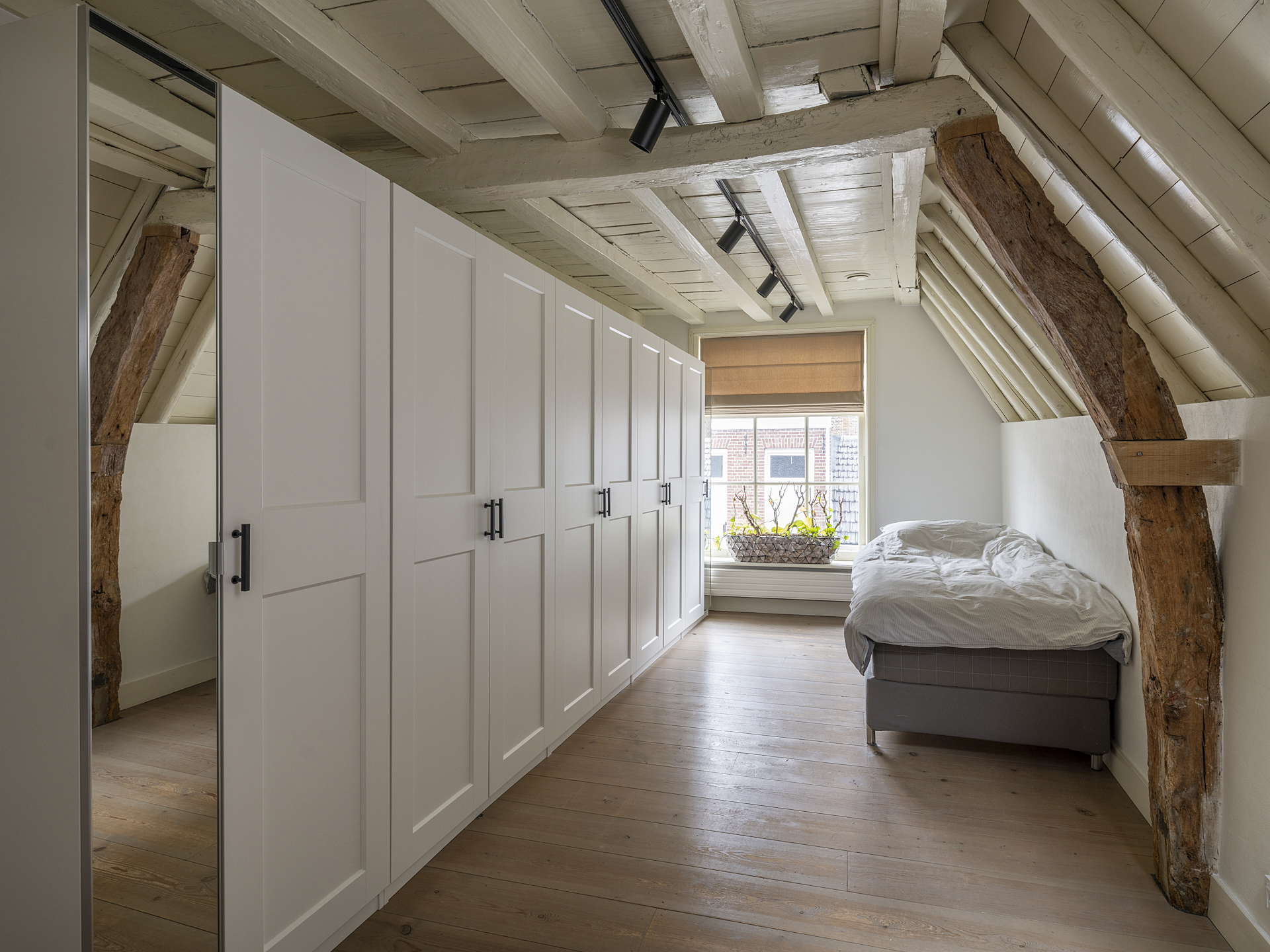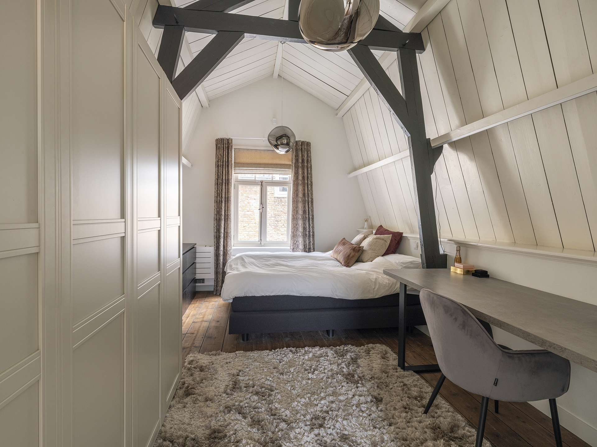 Front bedroom with visible original roof structure and custom-built wardrobe.