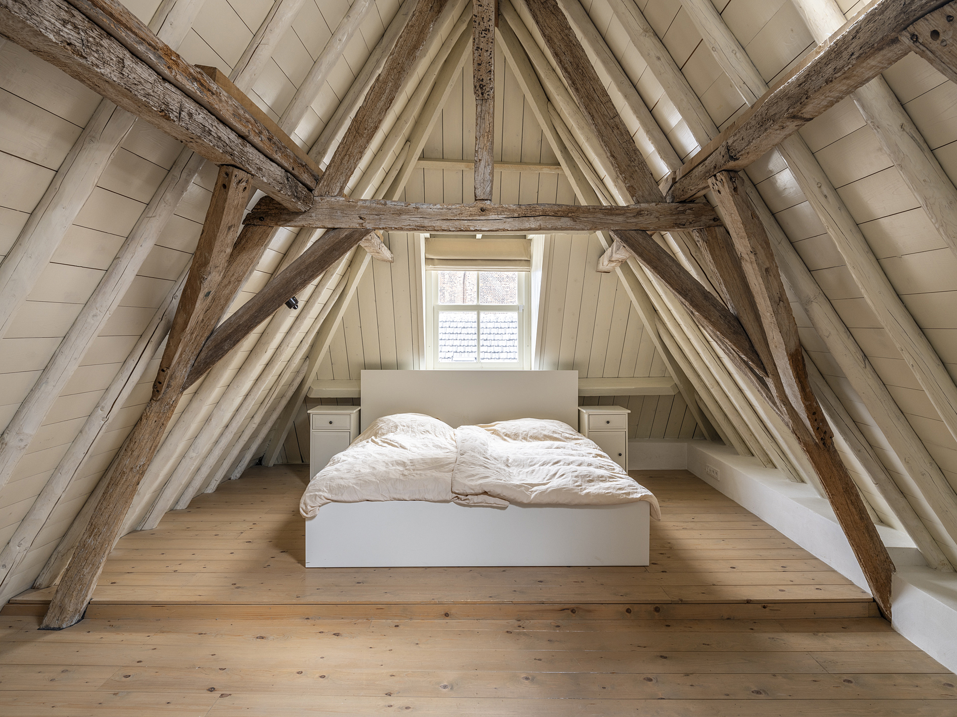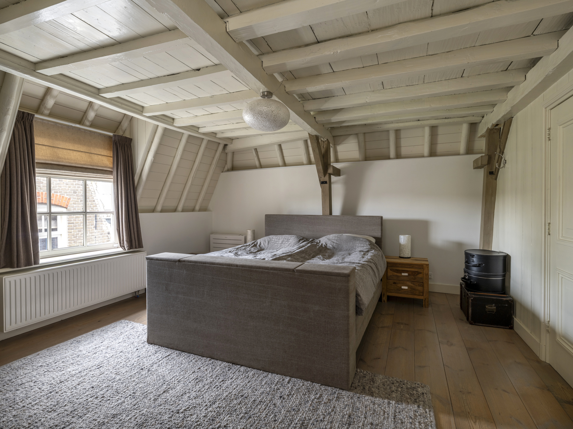 Bedroom with pine flooring and smooth plastered walls. The beautiful original roof structure is fully visible in this room as well.