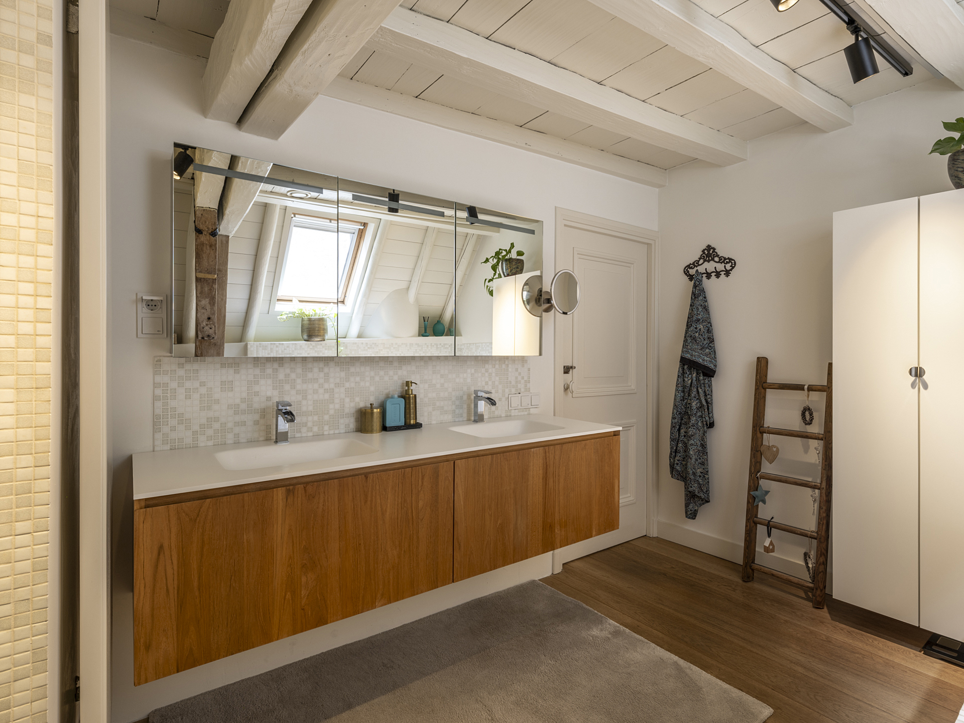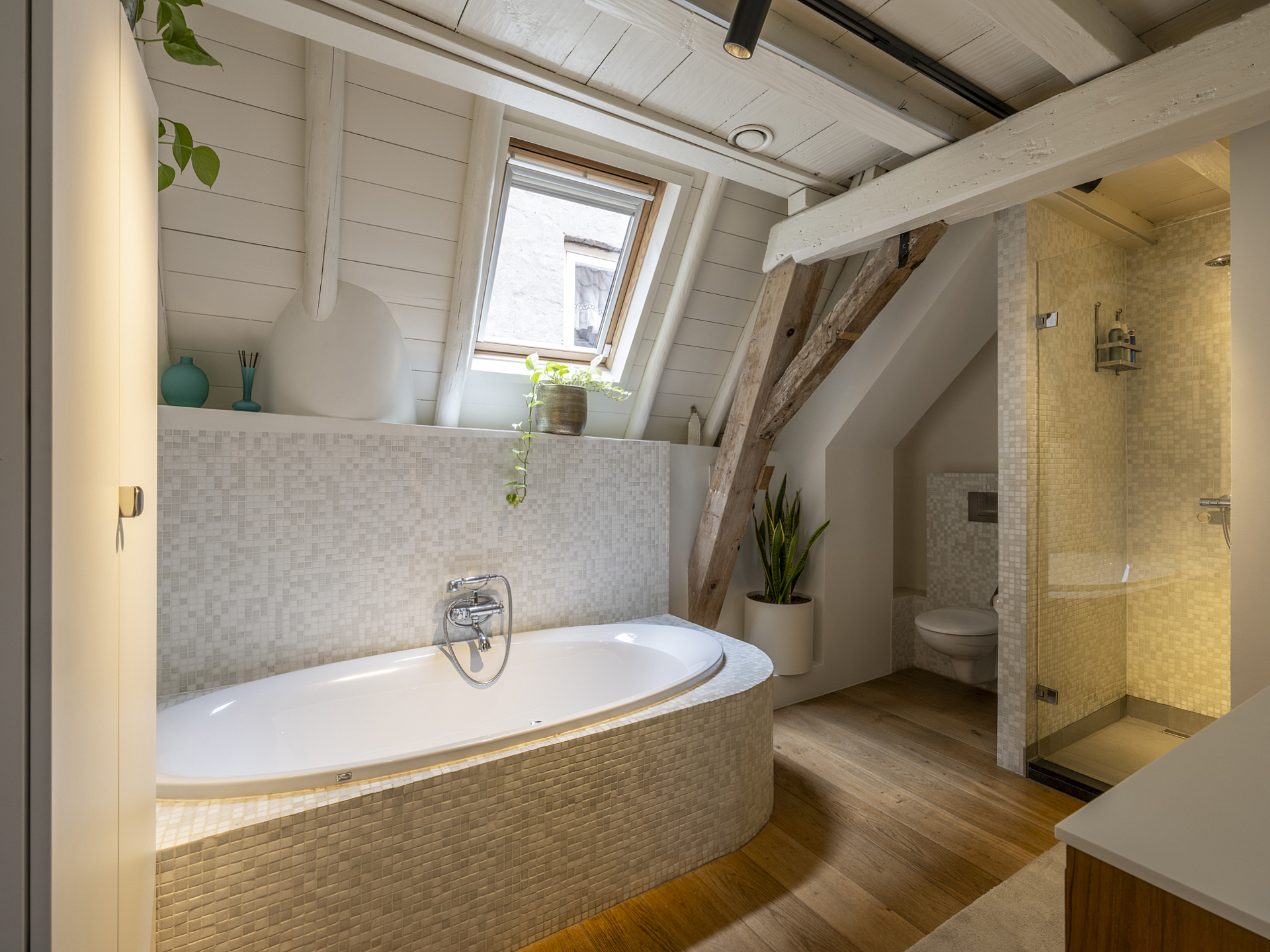 Luxurious bathroom featuring a bathtub, walk-in shower with two thermostatic mixers and shower heads, double sink in vanity unit, and wall-mounted toilet with concealed cistern. A large Velux skylight allows abundant natural light.