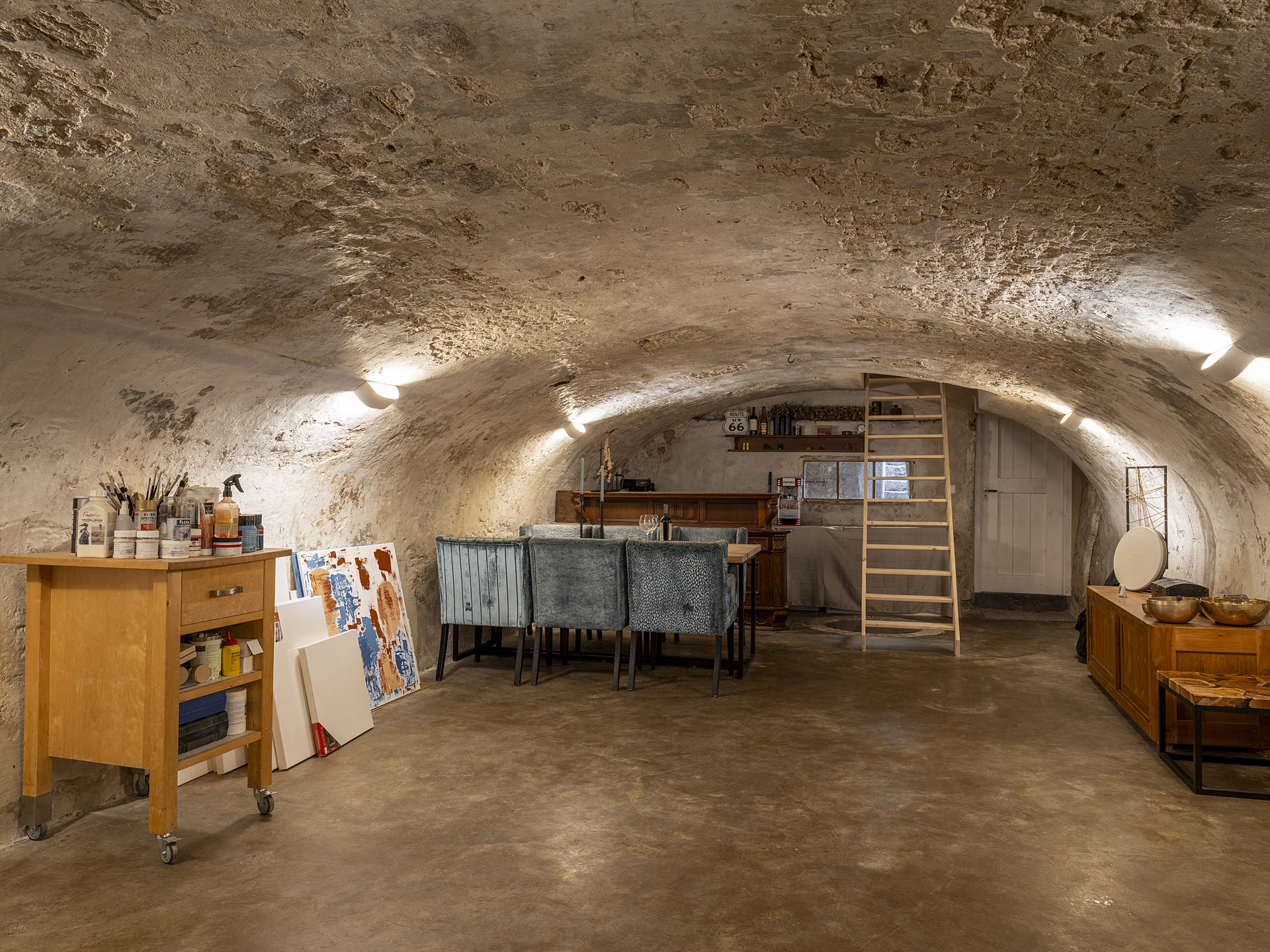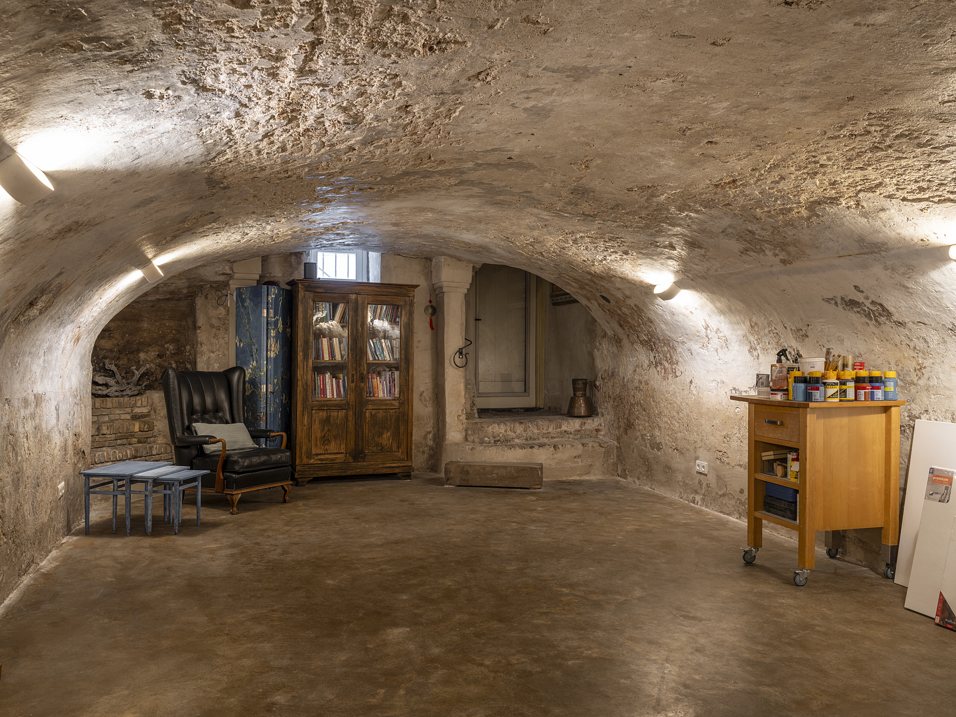 Stunning vaulted cellar with hallway (separate entrance!), a separate storage cellar, toilet room, kitchenette with tap, and a cosy bar area.