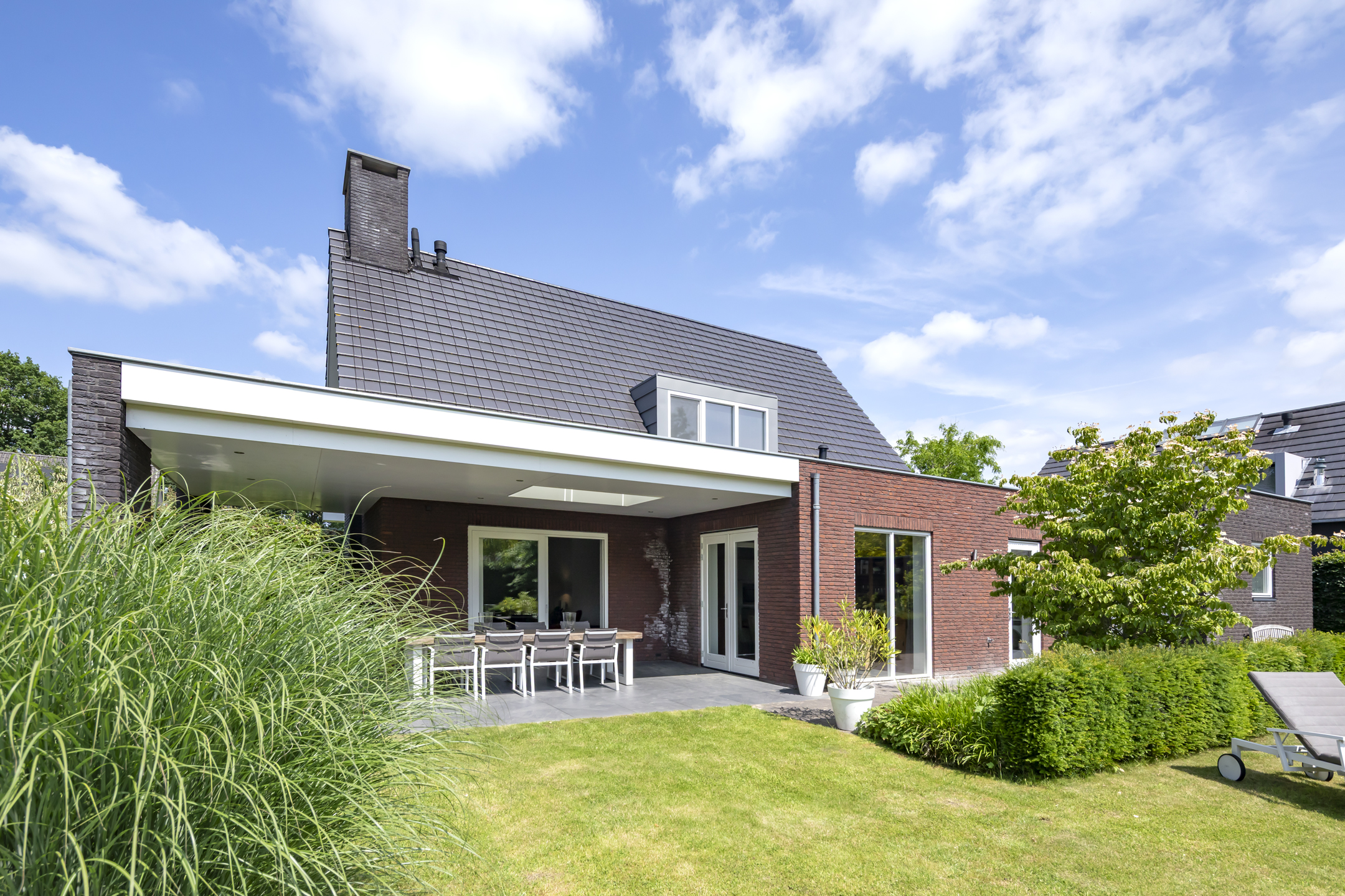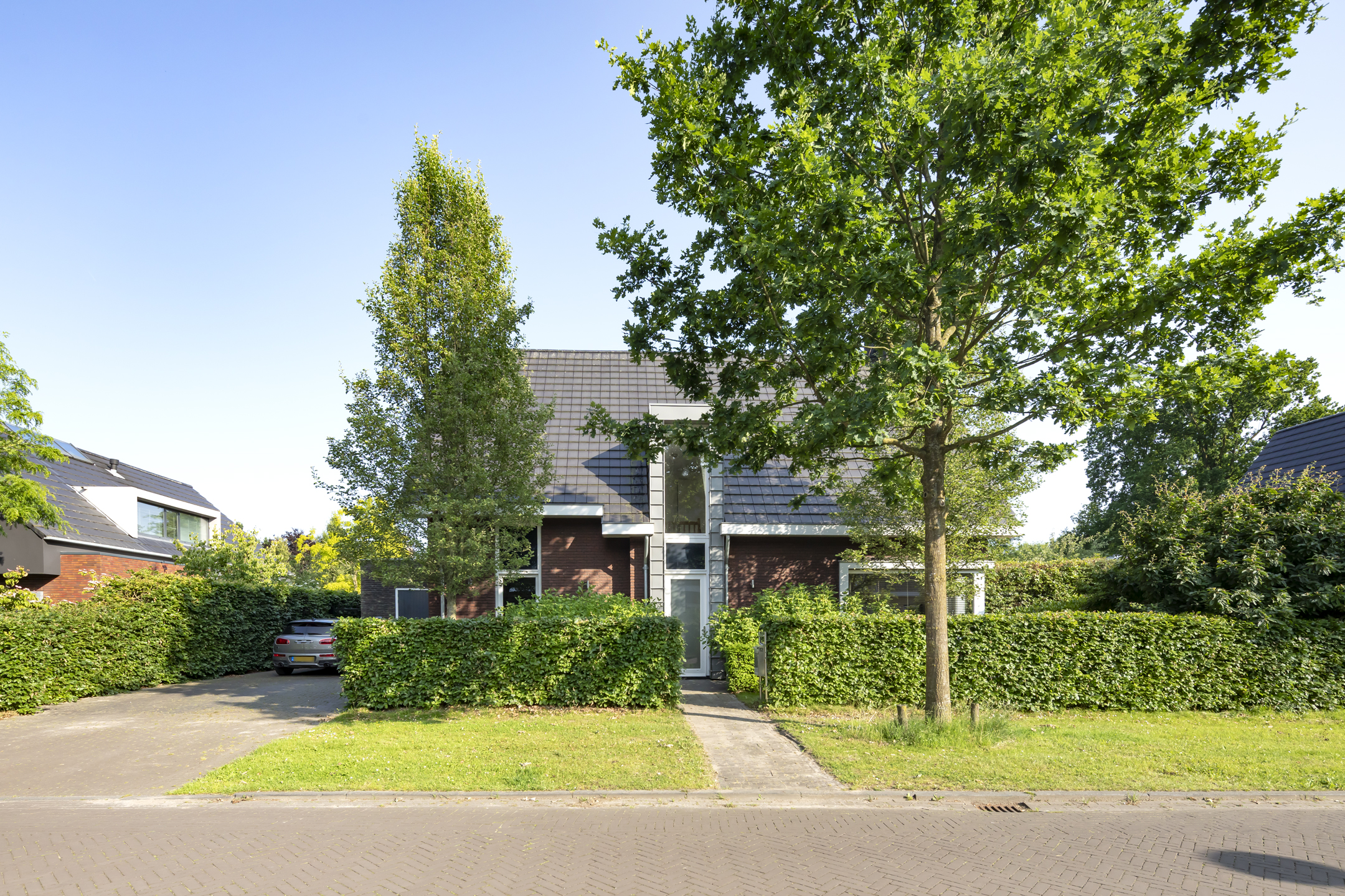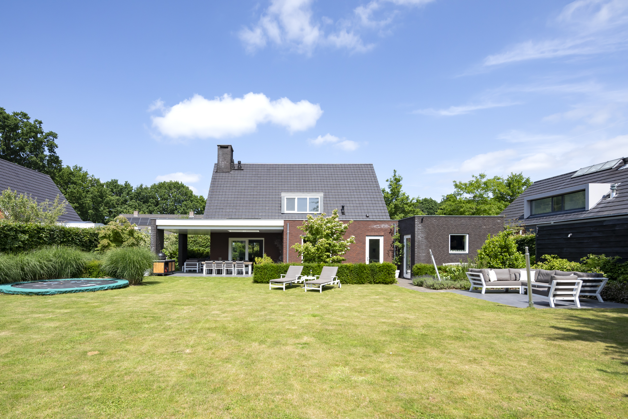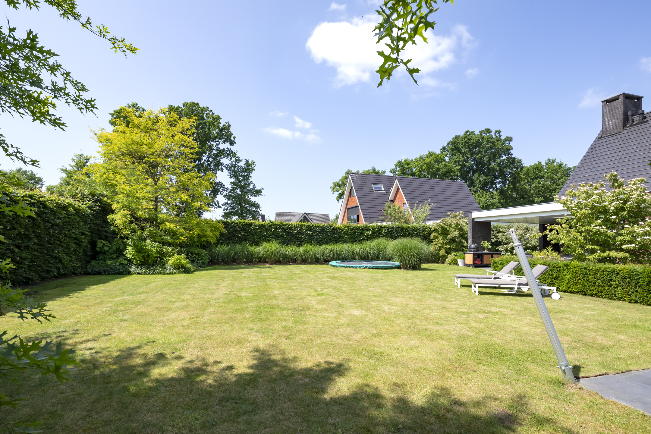 The garden is fantastic, offering wonderful privacy. The beautiful garden is bordered by green hedges, ensuring minimal views. A lovely lawn with a spacious sun terrace provides ample space for playing. In addition to the sun terrace, there is also a beautiful, spacious covered terrace adjacent to the rear of the house. The covered area has a large skylight, ensuring optimal daylight penetration into the living room. And then there's the unique sauna in the garden, where you can relax after a hard day's work. The front garden is also neatly landscaped and has a spacious driveway with space for 4 to 6 cars.