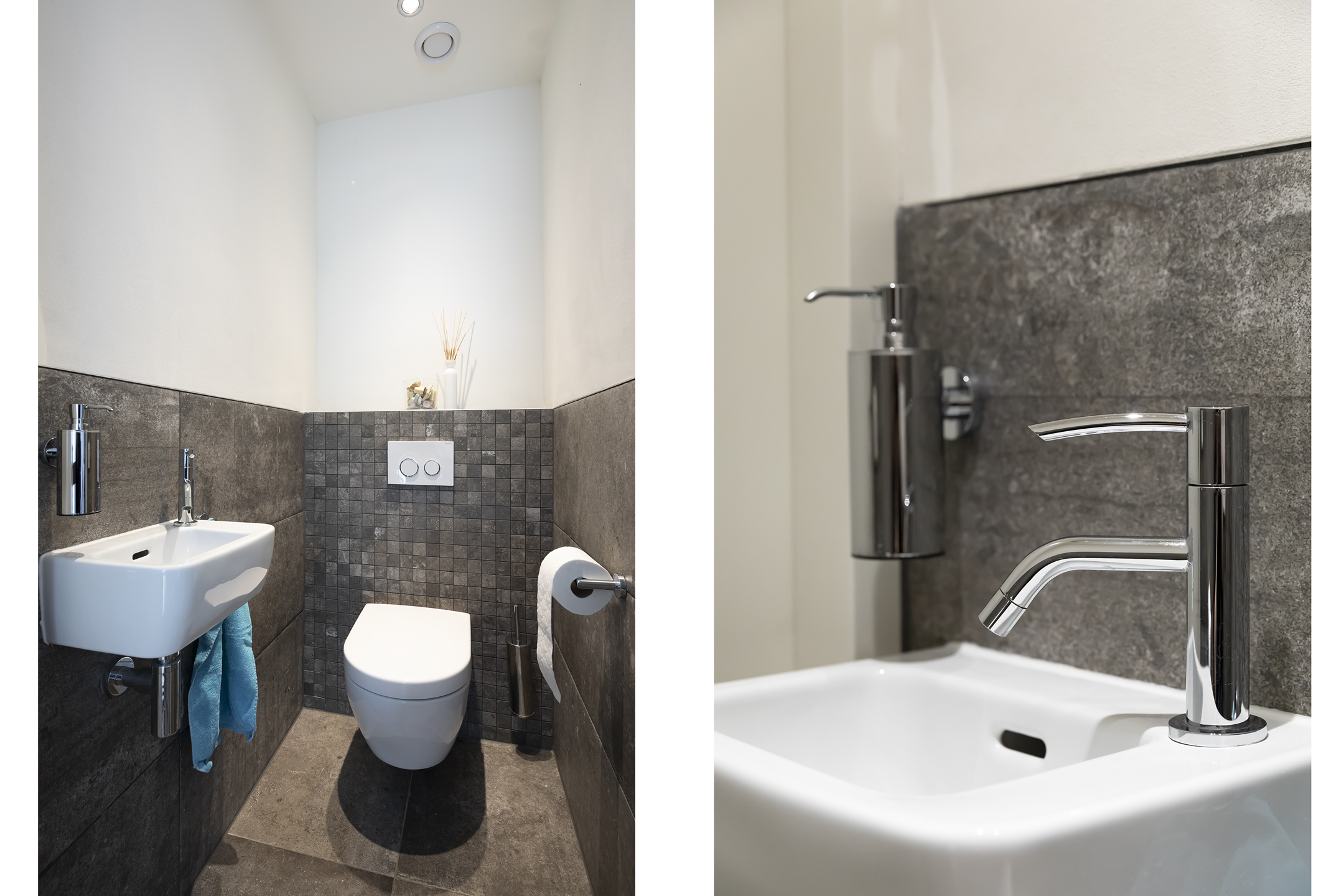 You enter the hall, where you'll find the meter cupboard, the toilet with a small sink, the staircase to the upper floor, and the entrance to the living room.