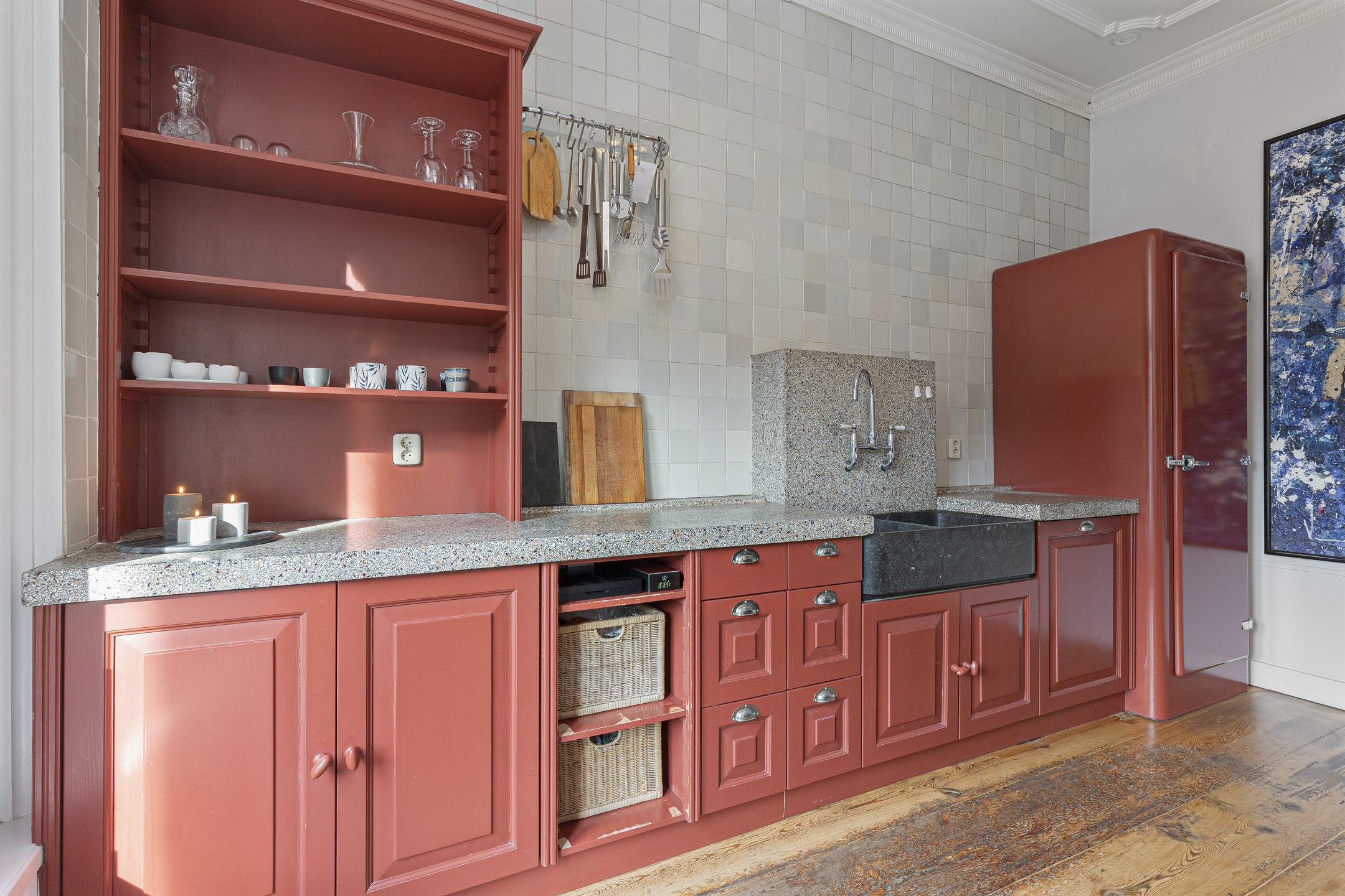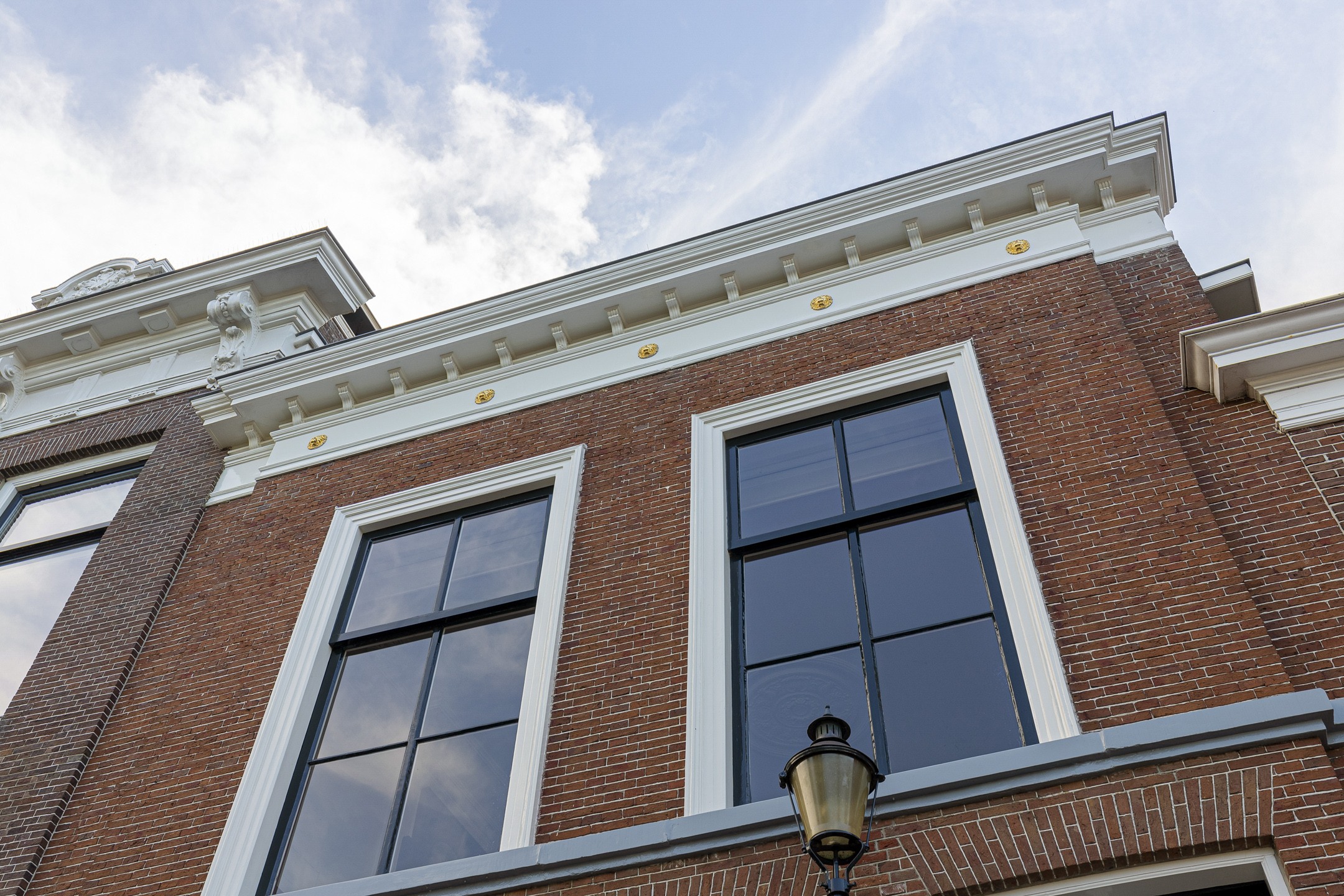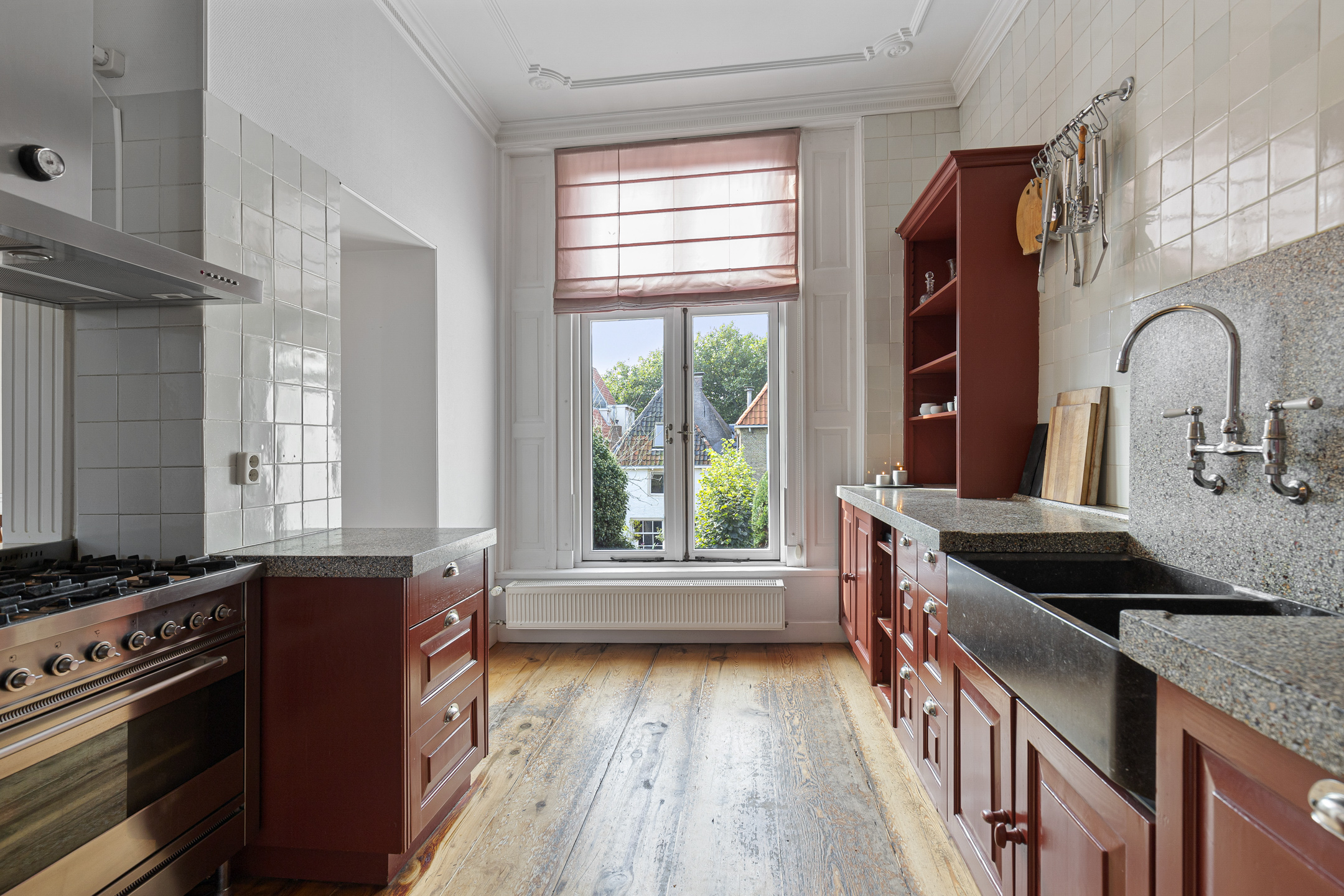 The first floor features an impressive living room with floor-to-ceiling windows, original sliding mechanisms, and sweeping views of the harbour, the historic town hall, and the Leeuwenbrug. With the ebb and flow of the tides and passing yachts and sailboats, the scene is ever-changing – like a living painting. At the rear, a charming dining room and authentic kitchen await, complete with traditional Frisian tiles and granite countertops.
