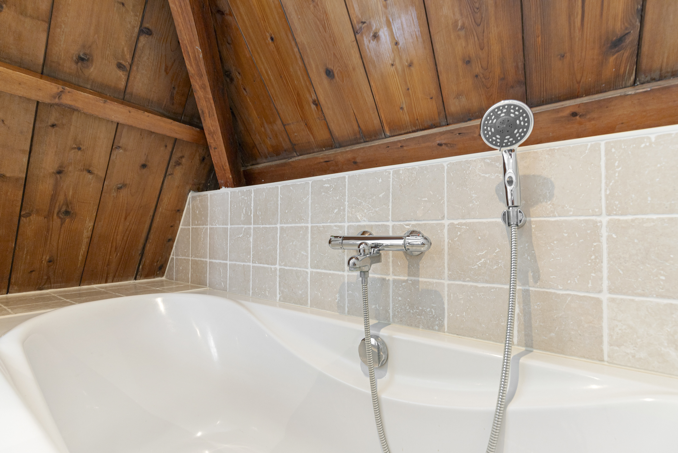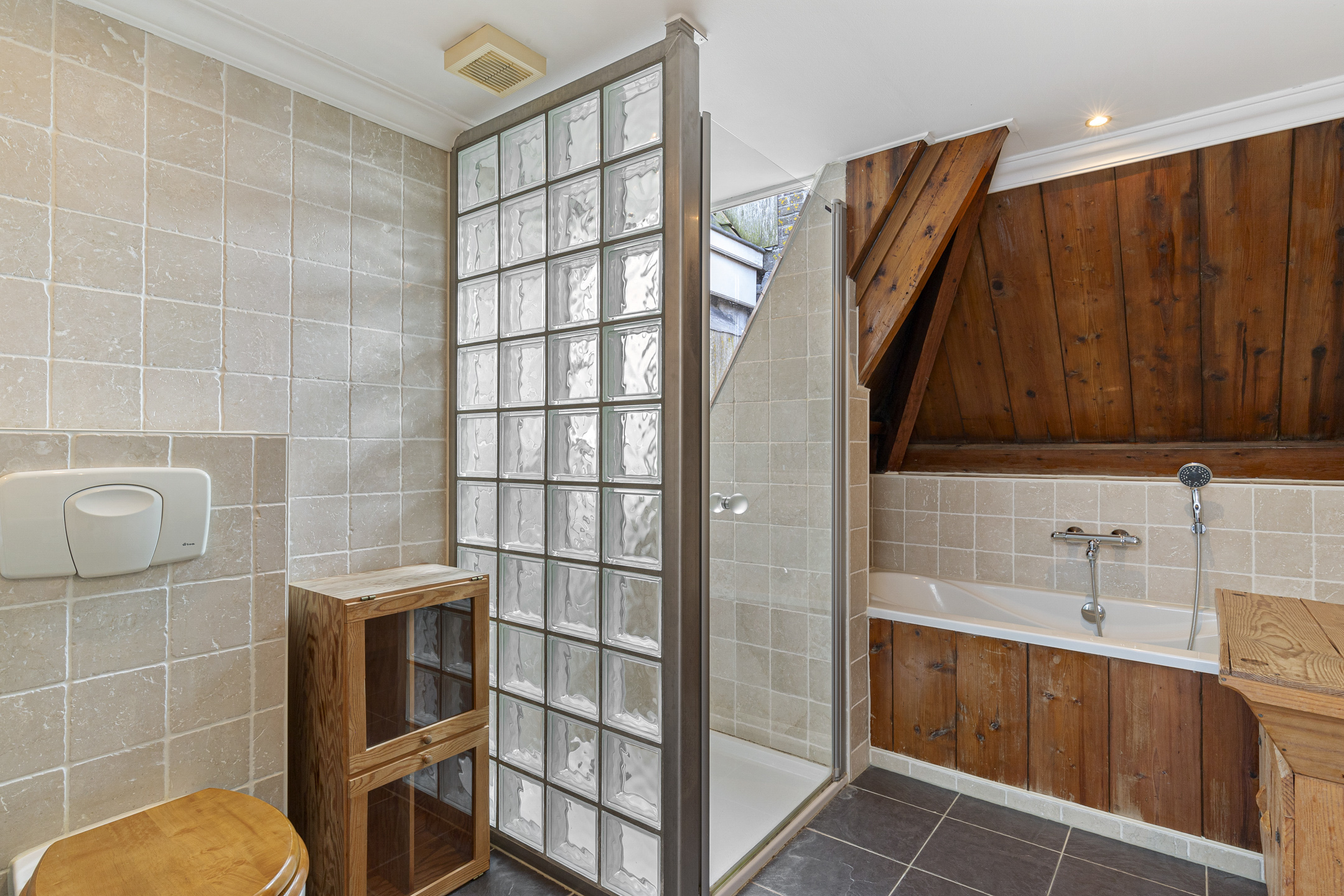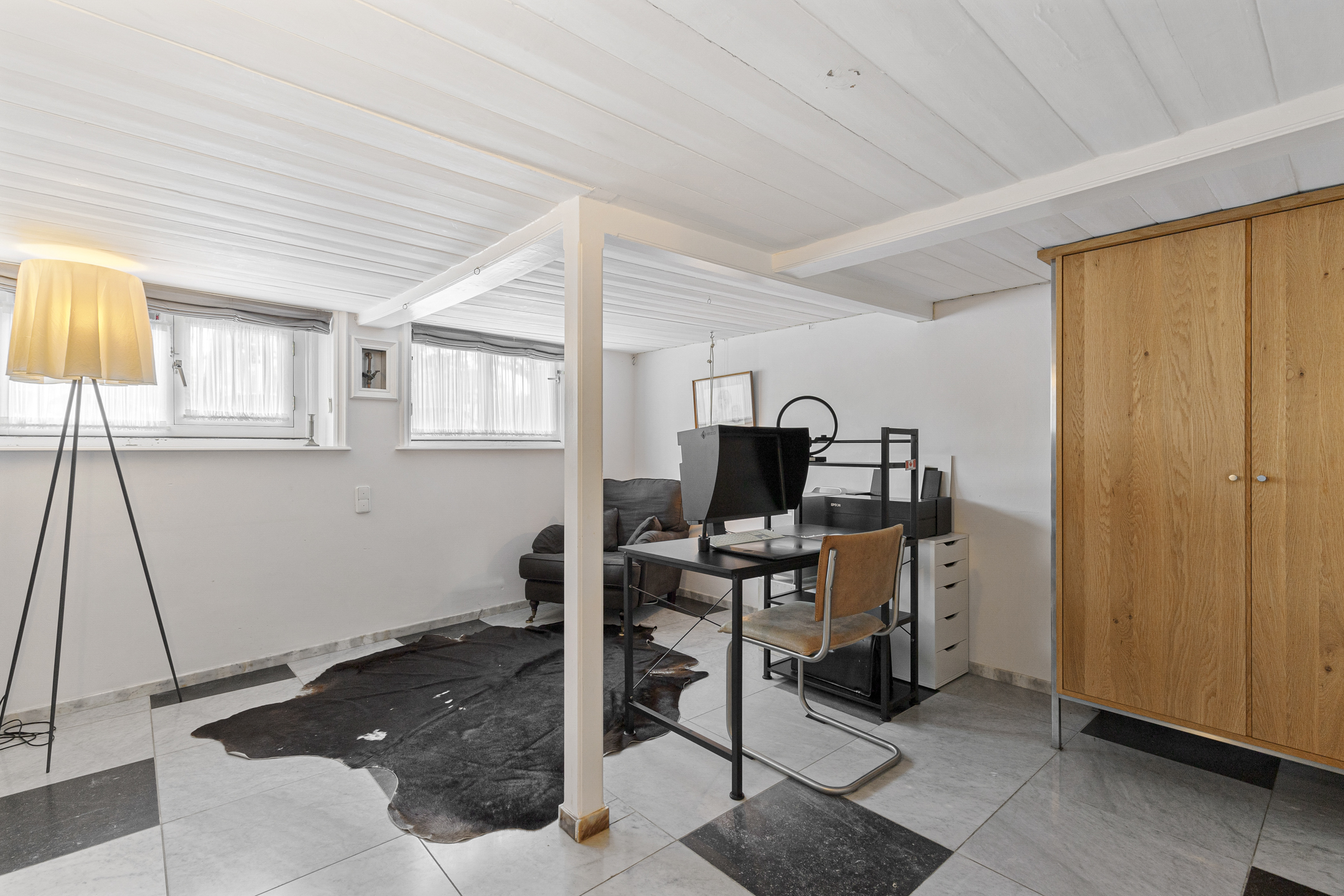In addition to the en-suite on the bel étage, the third floor offers two large bedrooms and a luxurious bathroom. The newly finished roof with exposed beams adds both character and warmth. The souterrain provides extra living space with a cosy guest bedroom, an en-suite bathroom, and a walk-in closet – ideal for guests or an au pair.
