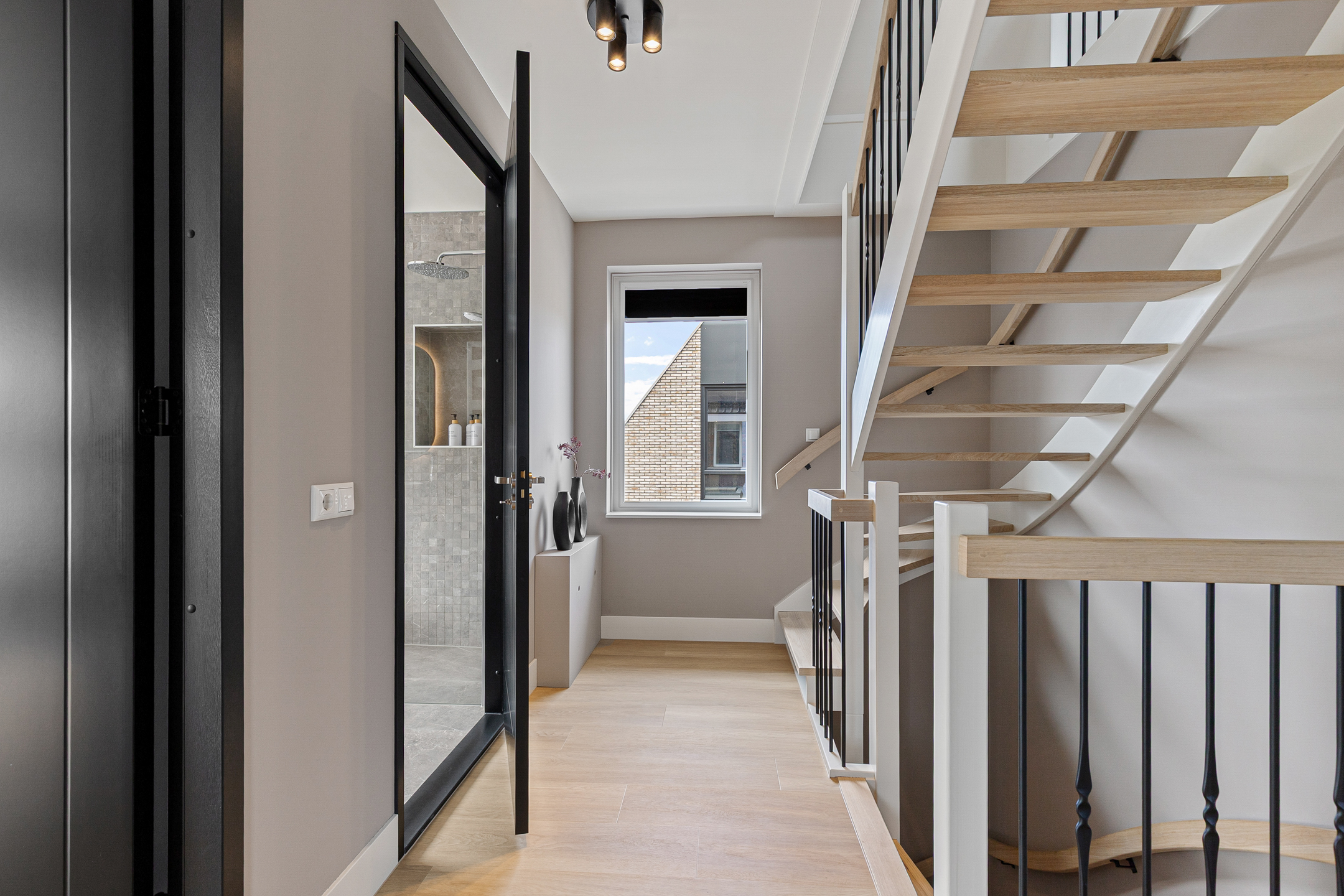 The entrance leads into a spacious hallway featuring a staircase finished with Fraké wood treads and handrails, combined with elegant black balusters, a stylish guest toilet, and the utility meter cupboard. From the hallway, an extra-wide glass door provides access to the generous living area.