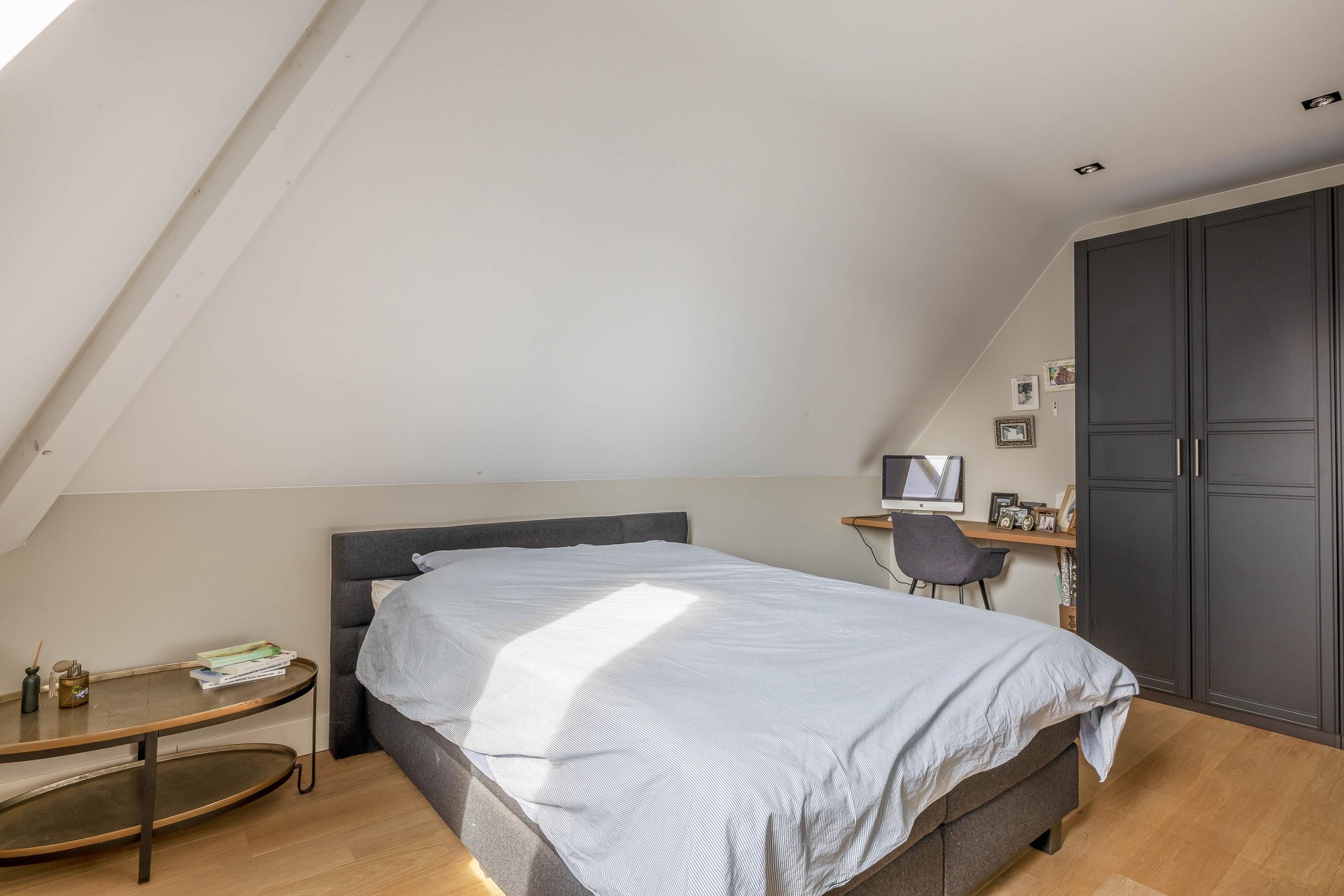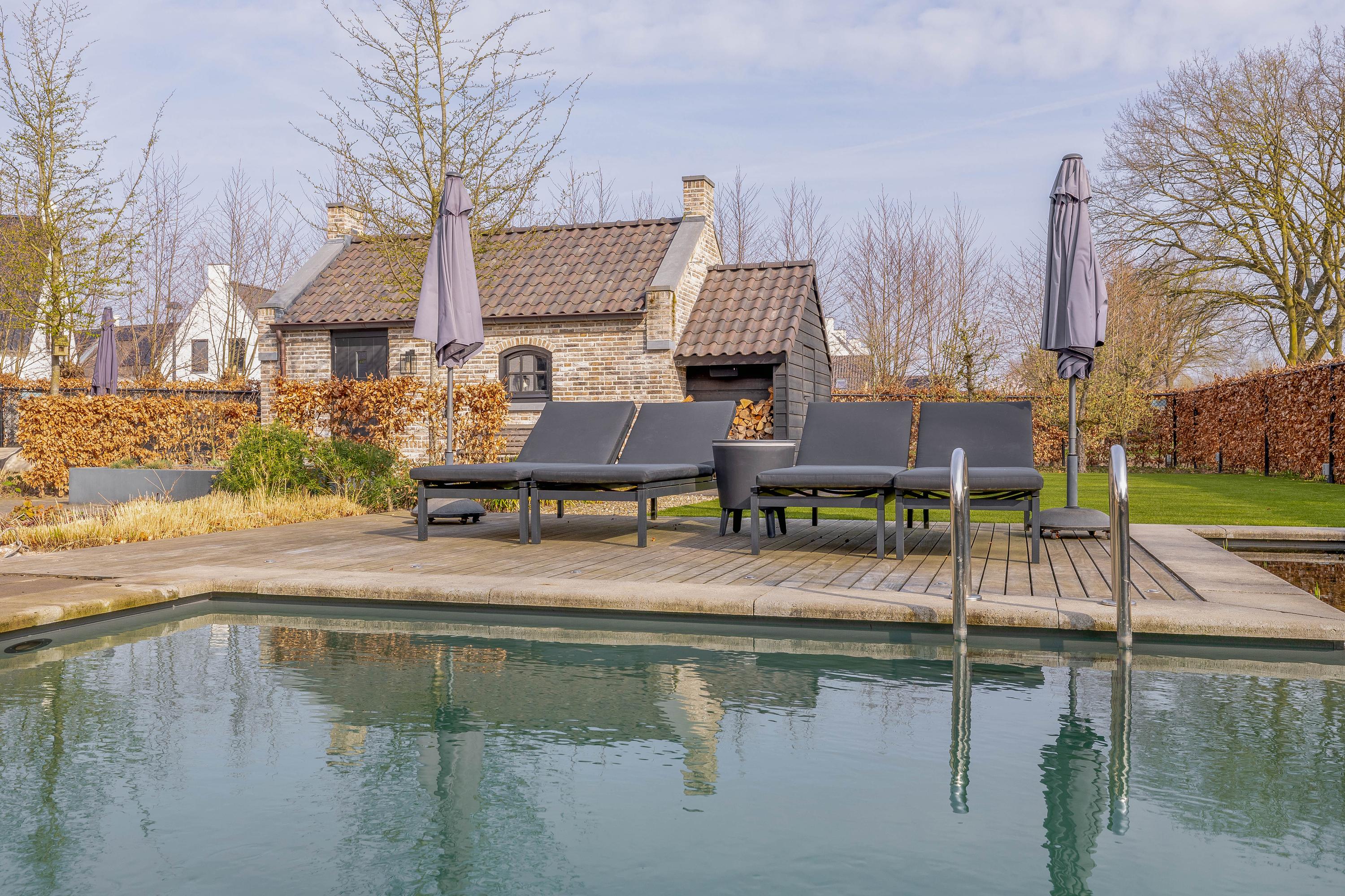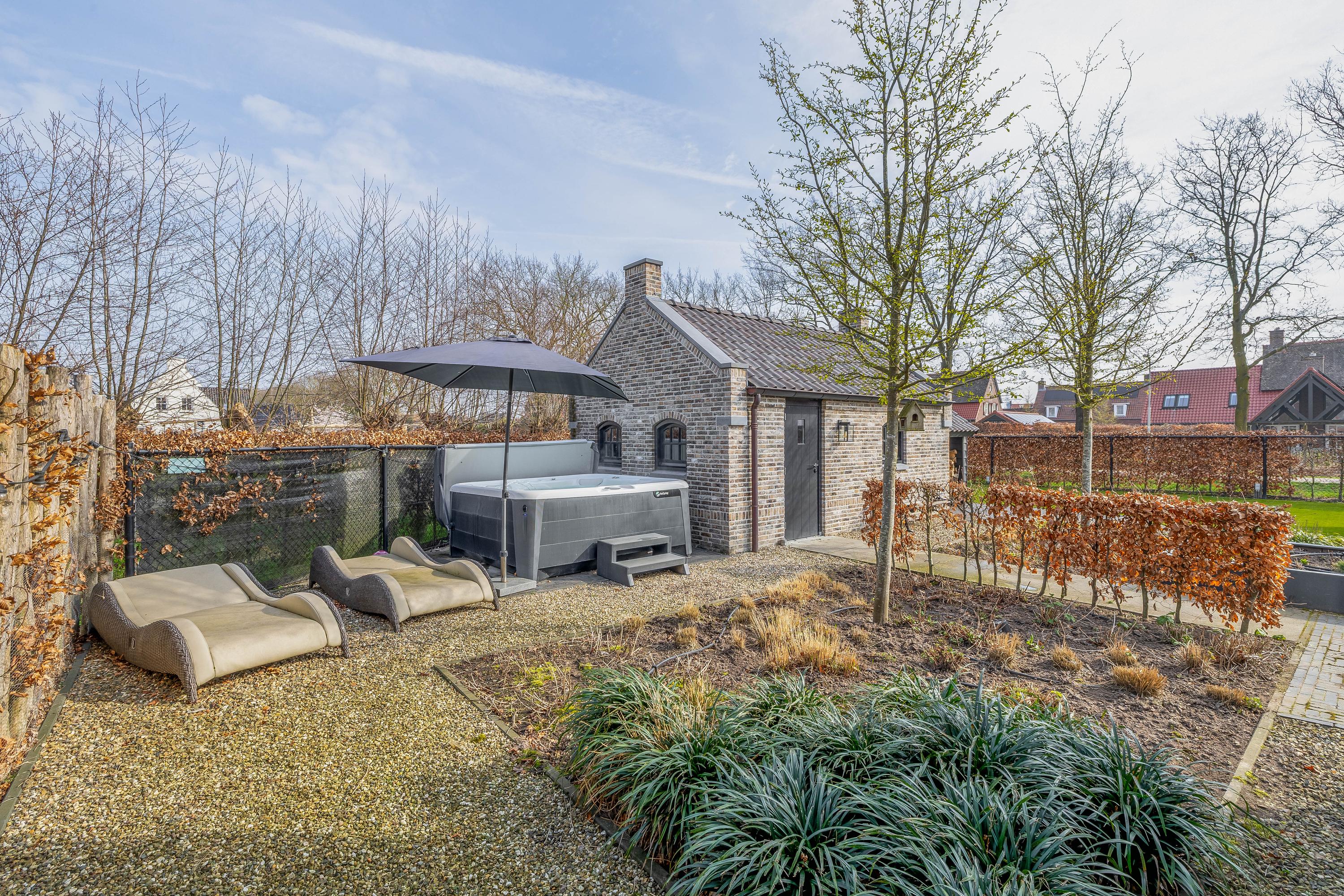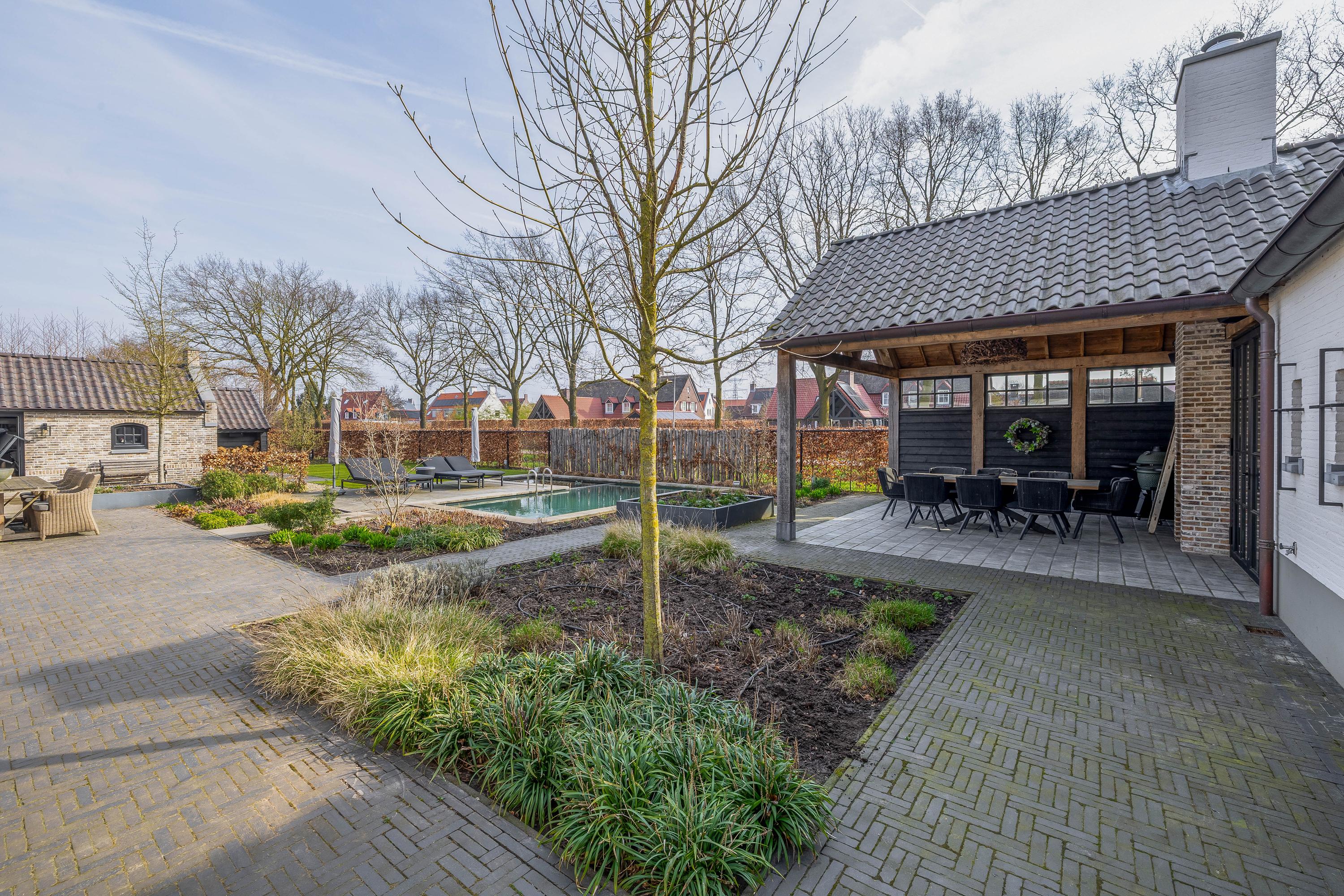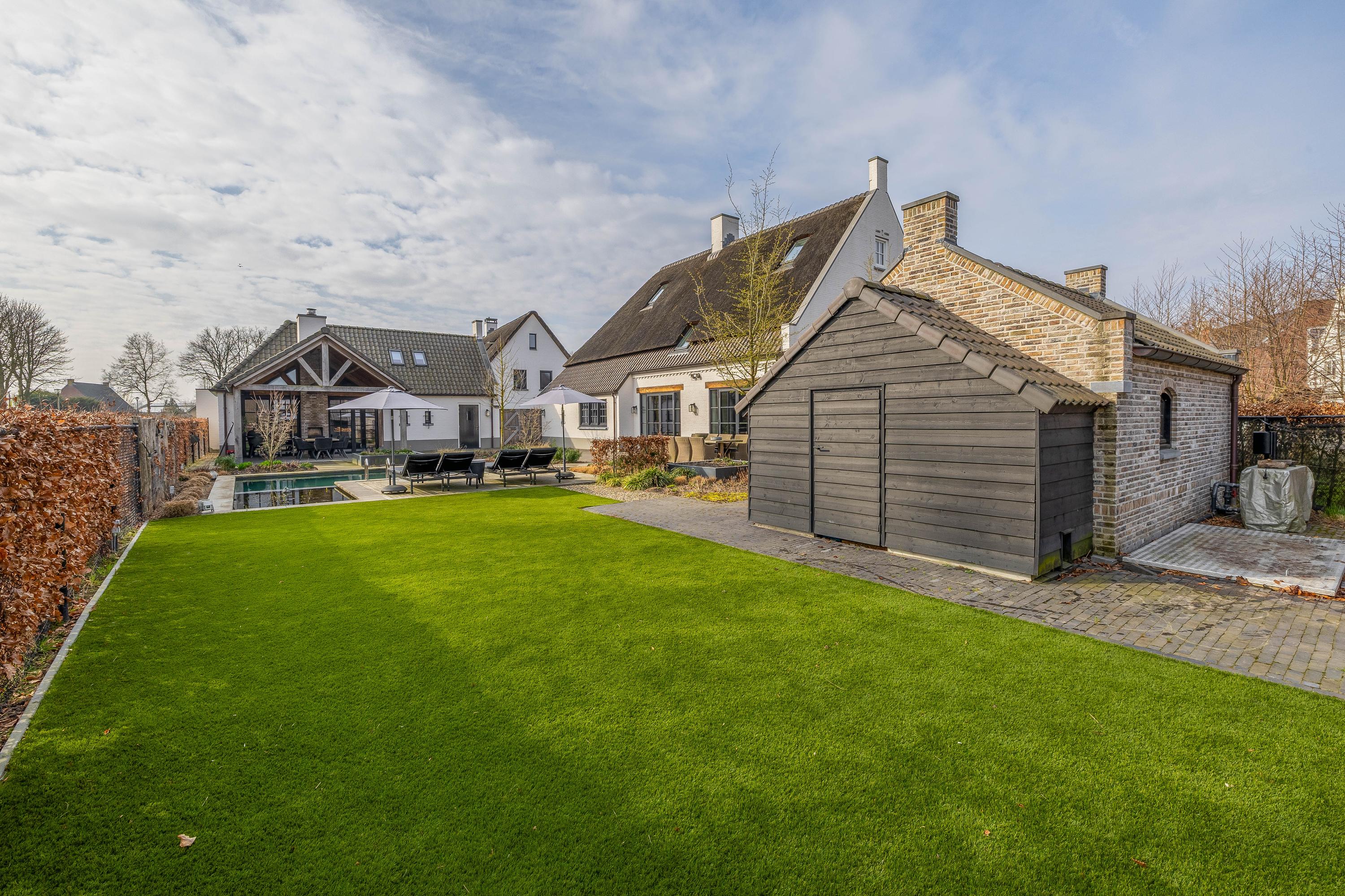 The adjacent (fully insulated) garden shed, with a high continuous ceiling, is perfect for use as a chill-out space, studio, or extra office. The garden shed is styled in harmony with the house. The garden, landscaped by an architect, is a true work of art with rich borders, elegant hedges, atmospheric pathways, and lush lawns. The carefully chosen boundary walls and playful materials create a dynamic and inviting outdoor experience. Not to mention the water paradise, which flows into a rustic pond area, creating a perfect balance between luxury and nature.