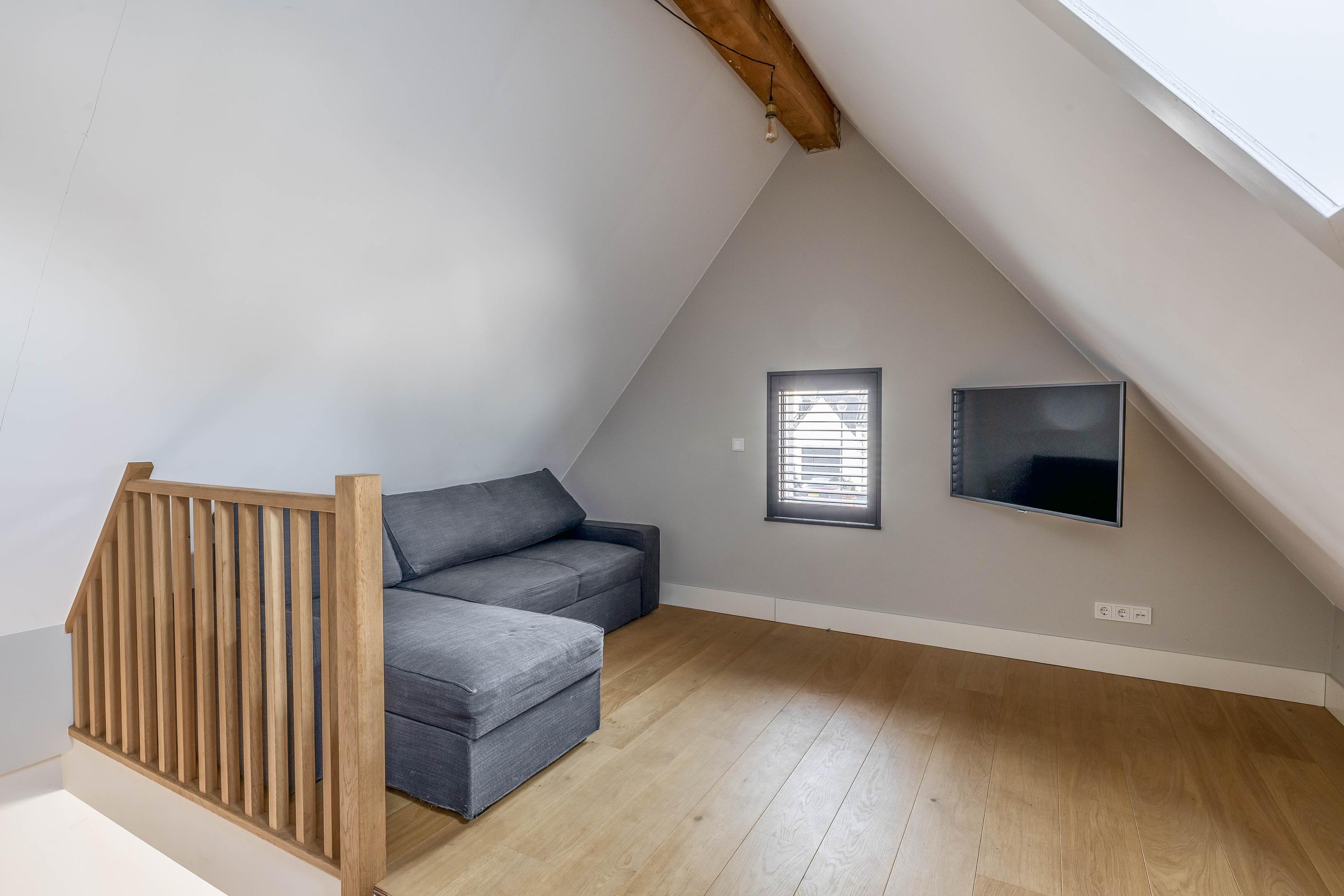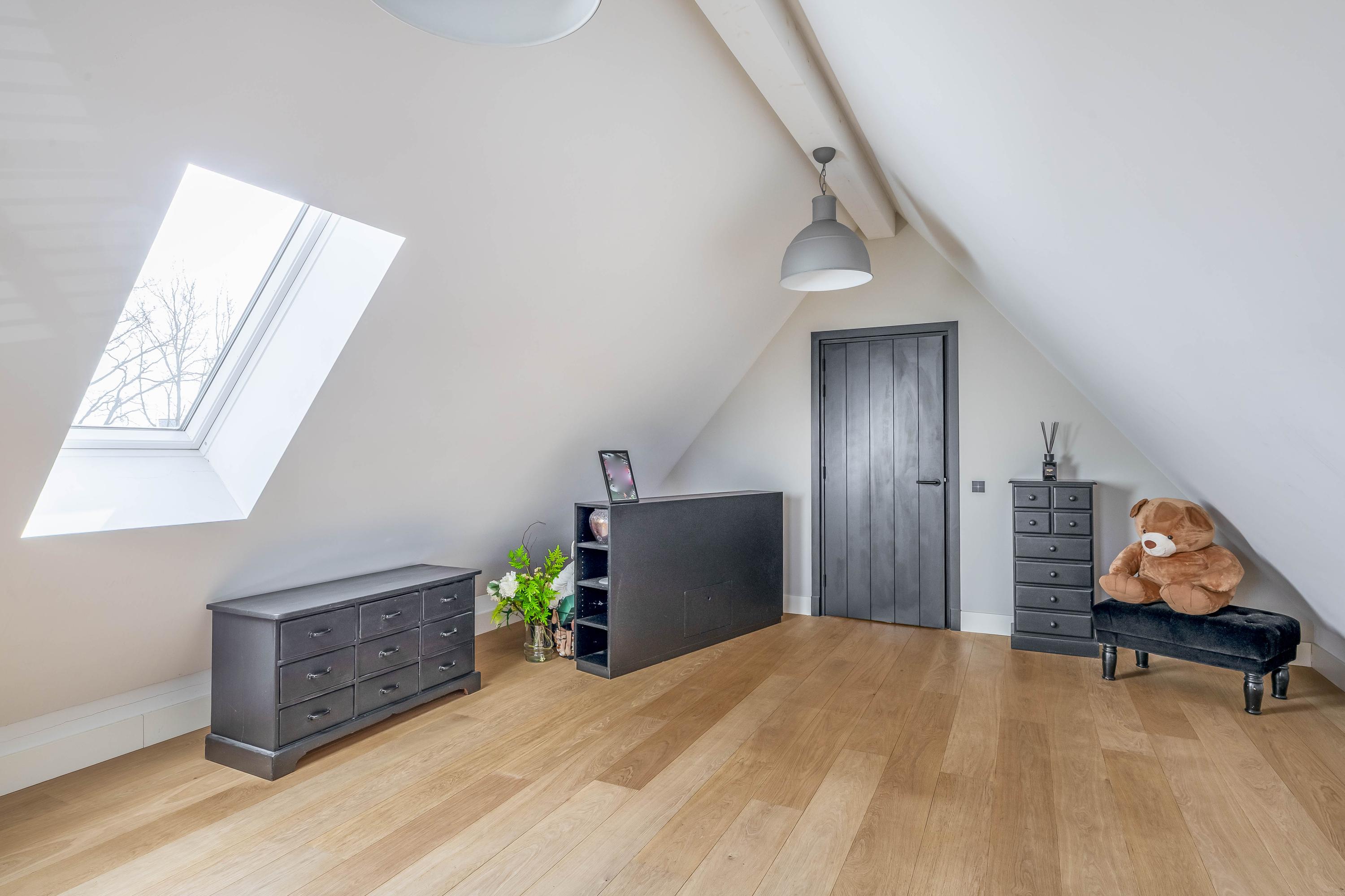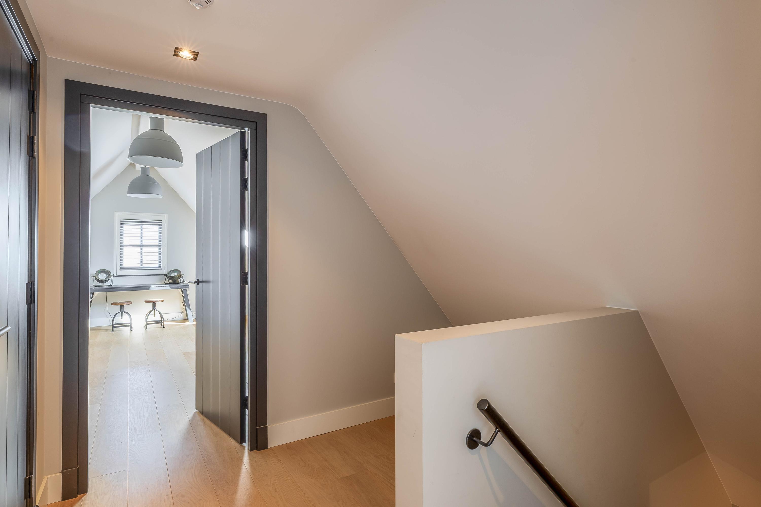 Via a fixed staircase, you reach the second floor, where the landing provides access to various multifunctional spaces. A practical laundry room with appliance setups, an additional workroom or bedroom, and extra storage space make this floor especially adaptable to your needs.