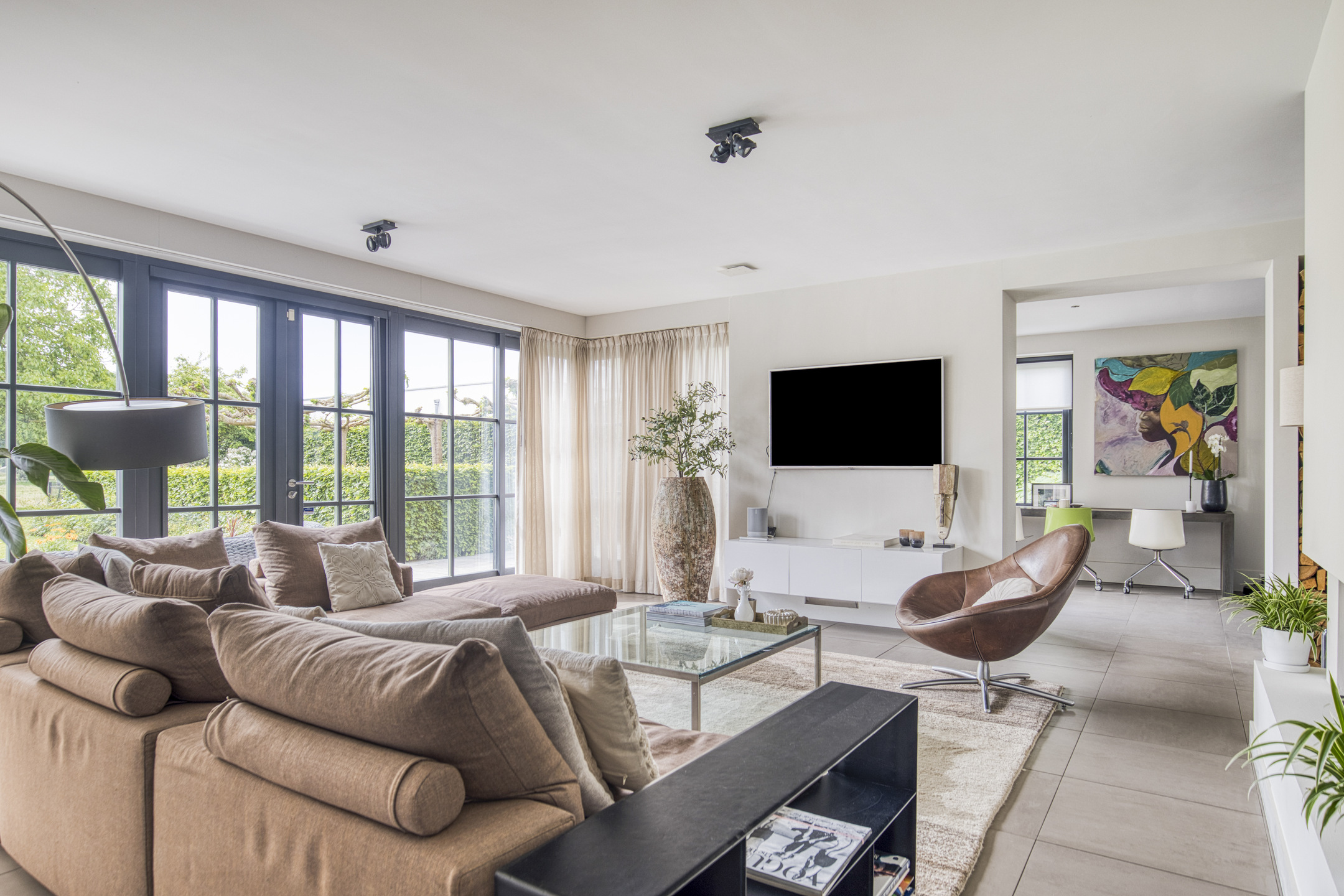 Bij binnenkomst valt direct de imposante entree op: licht en ruimte komen u tegemoet, een voorbode van wat deze villa te bieden heeft. De halfopen living vormt het hart van het huis, met prachtig zicht op de tuin en openslaande deuren naar het terras.