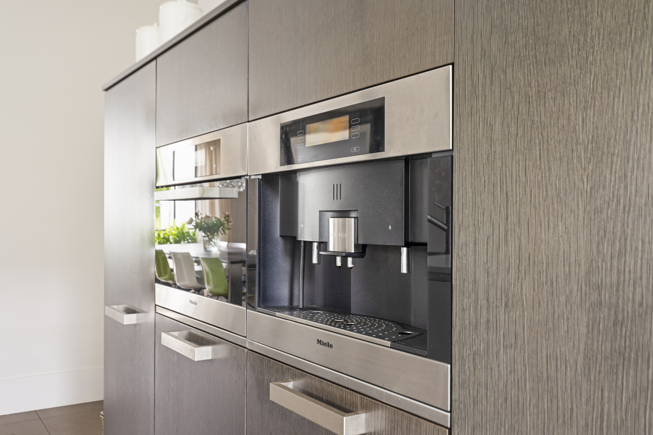 woonkeuken, waarin geplaatst een in de lengte opgestelde Boffi inbouwkeuken, voorzien van een Corian aanrechtblad met een spoelbak, inbouw 5-pits keramische kookplaat, -koeler, -vriezer, -combi oven/magnetron, -vaatwasser, -afzuigkap en een koffieautomaat, wandafwerking stucwerk, tegelvloer (60x60), plafond afgewerkt met stucwerk vv. inbouwspots, tuindeuren naar tuin/terras;