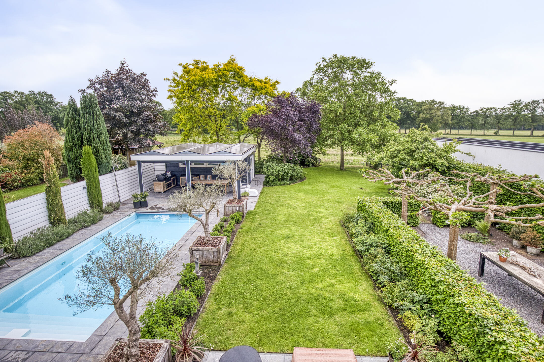 Aangelegde tuin rondom, zonnige gesitueerd op het zuiden, terras bestraat met natuurstenen sierbestrating en voorzien van borders, gazon, grindterras, elektra, tuinverlichting, buitenkraan, zwembad met elektrisch dek, buitendouche, een zonnescherm t.p.v. woonkamer en een poolhouse (vv. vloerverwarming) met aansluitend een veranda vv. buitenkeuken, lichtspots en zonne-screens;