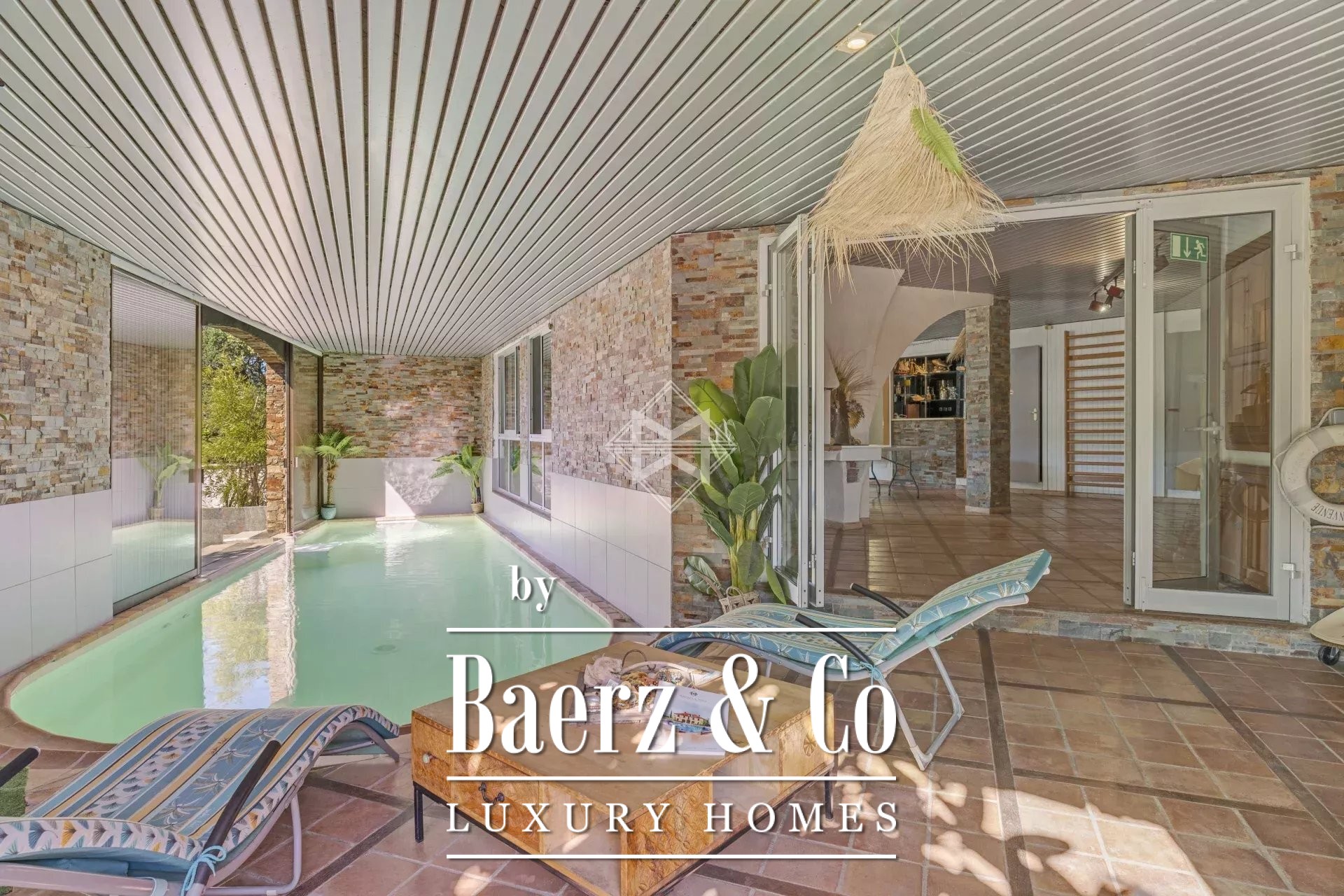 The lower level houses a spacious reception hall of nearly 100 m², with direct access to the indoor and outdoor pools, as well as ample storage space.