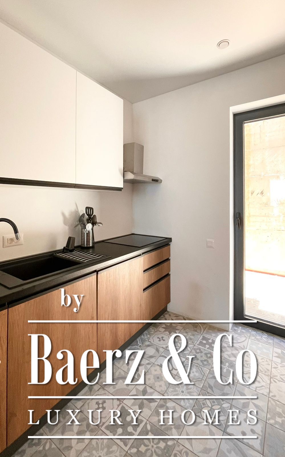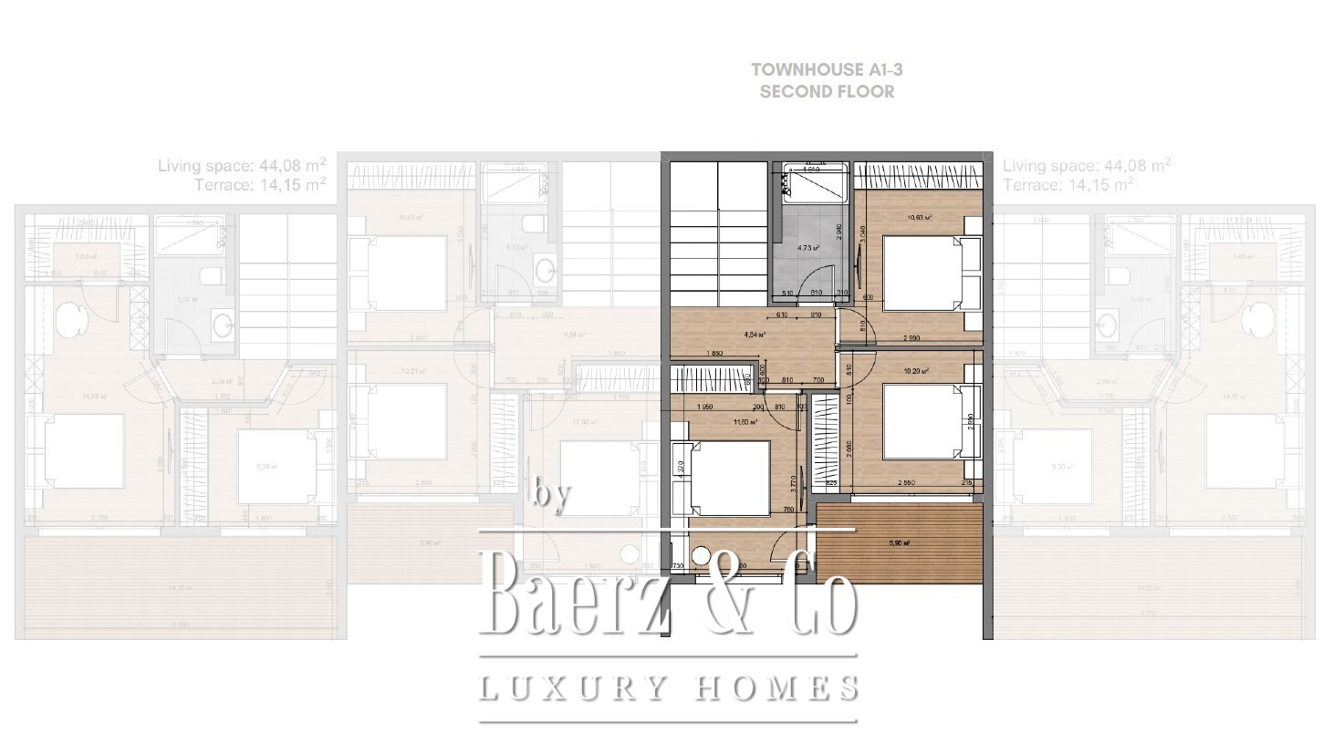Townhouse with an area of 110 m2 and own plot of 200 sq.m. It consists of living room-kitchen, 2 or 3 bedrooms, 2 bathrooms, 2 terraces and a parking. There are 4 units in one townhouse. Kitchen equipment is included within the price.