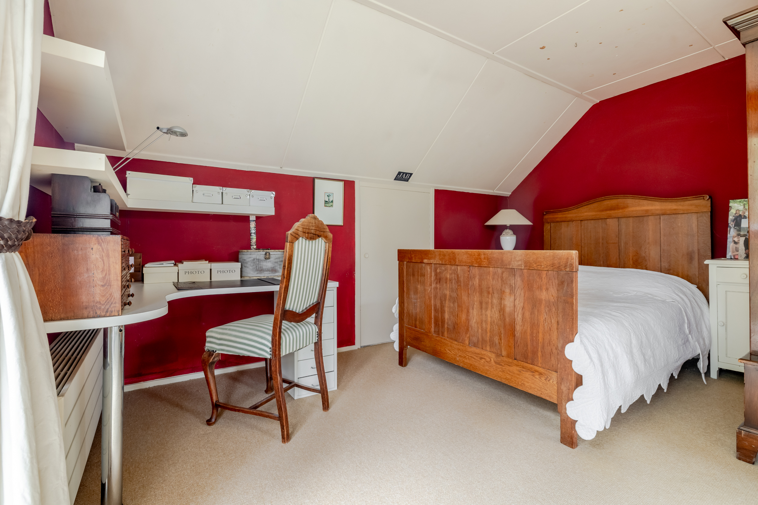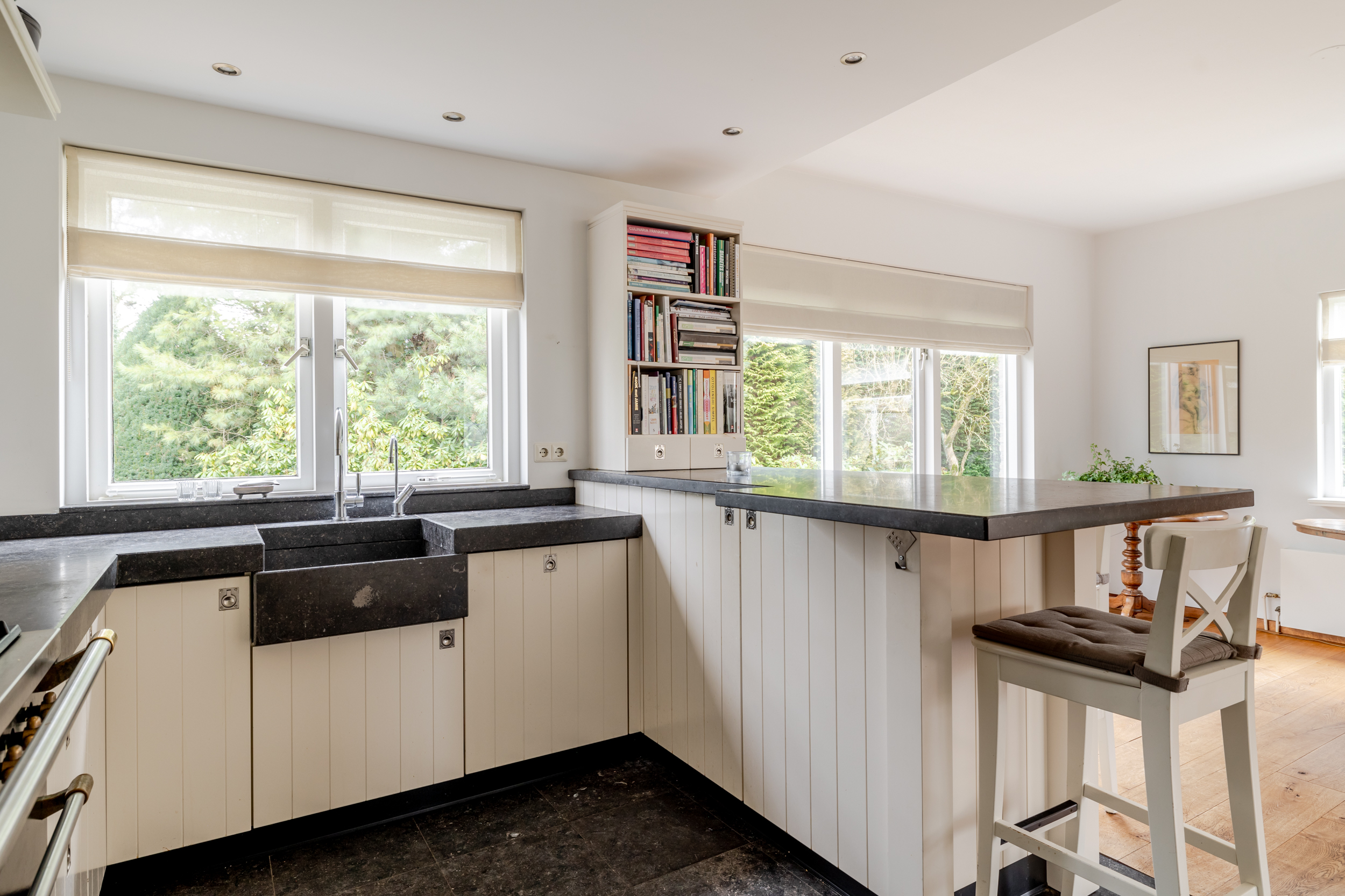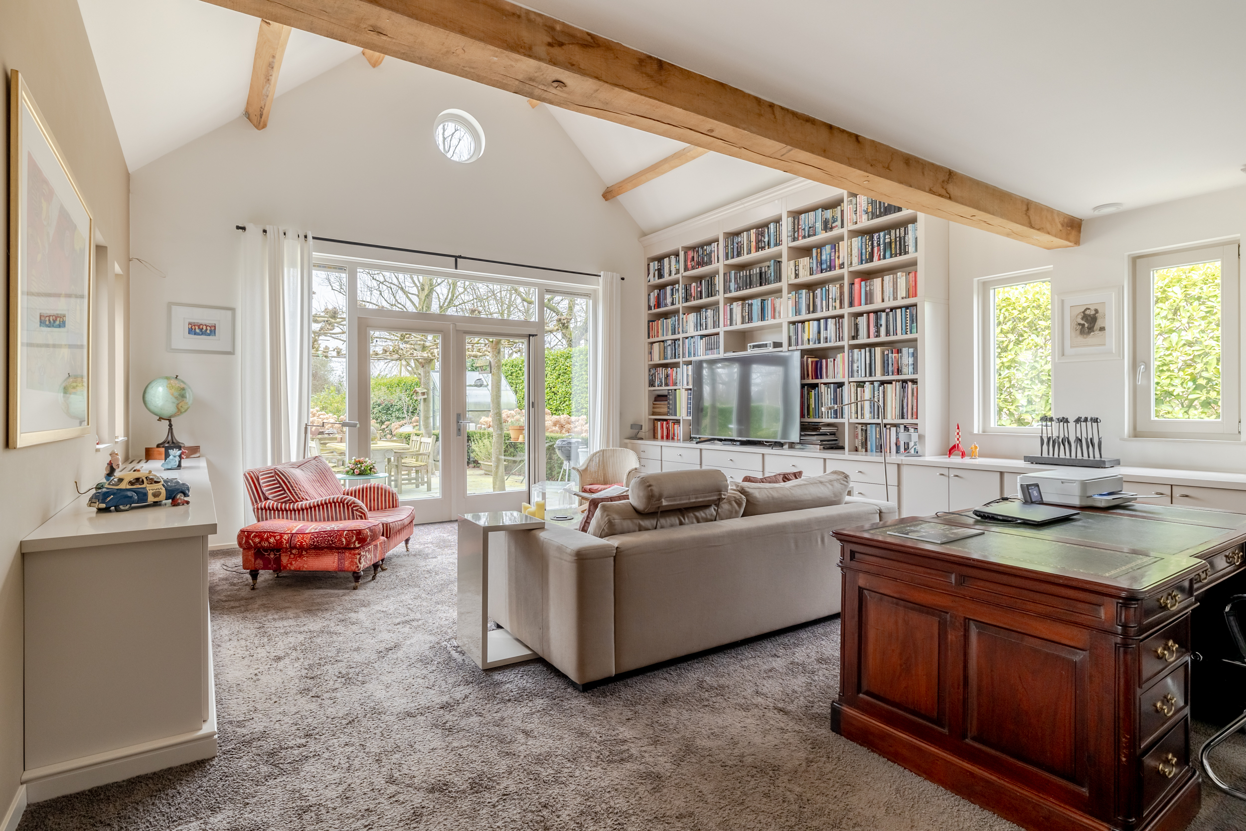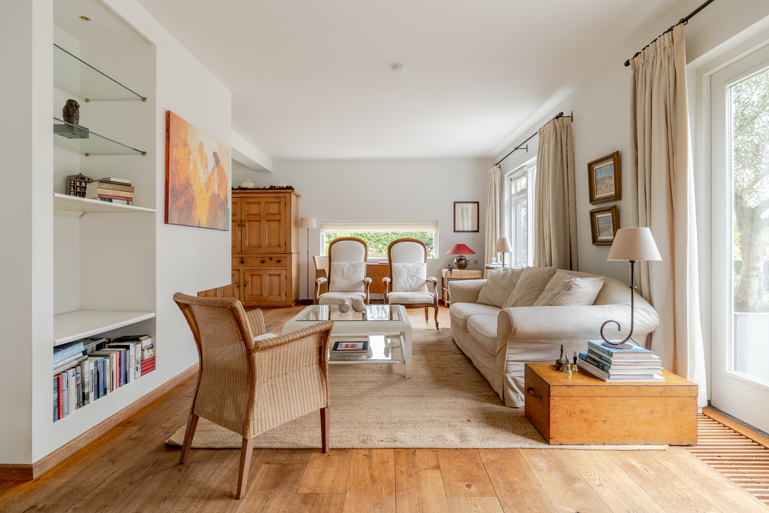 The garden-facing living room anchors daily life, its wide French doors and large windows immersing the interior in natural light and seamlessly connecting to the landscaped garden and water beyond. The spacious office or practice space, measuring approximately 42 m² and nestled in the 2008 addition, features custom cabinetry, a soaring 5.4 m ceiling, and direct access to a tranquil garden terrace. This wing, with its private entrance, lends itself equally to work, guest accommodation, or care-related requirements.