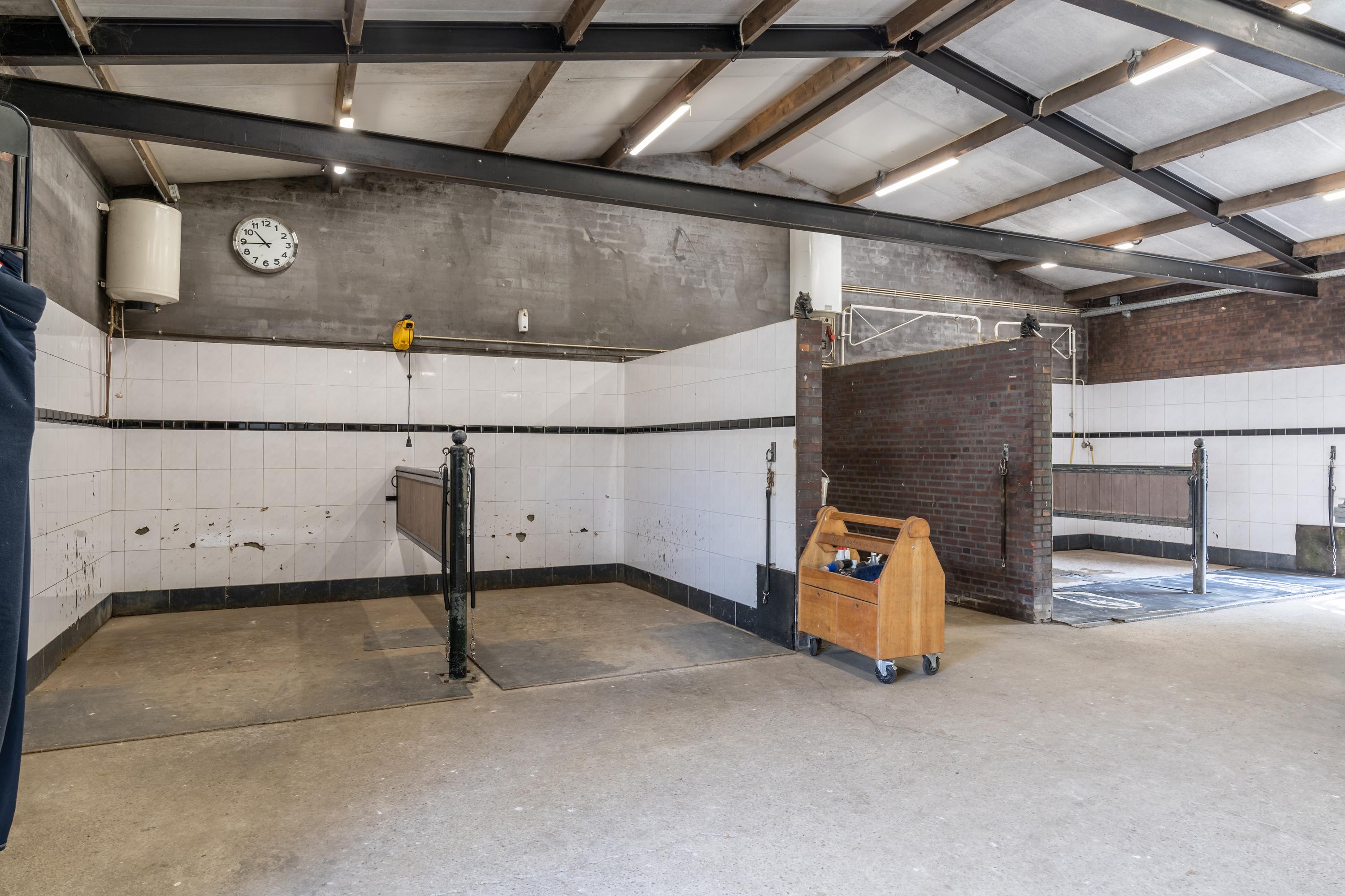 The very spacious shed is currently used as storage space and is partly furnished with five horse stalls and two walk-in stalls. Of course, the shed is suitable for multiple purposes. The brick facades of the fully insulated shed are largely clapboard on the outside. The roof is covered with tiles.