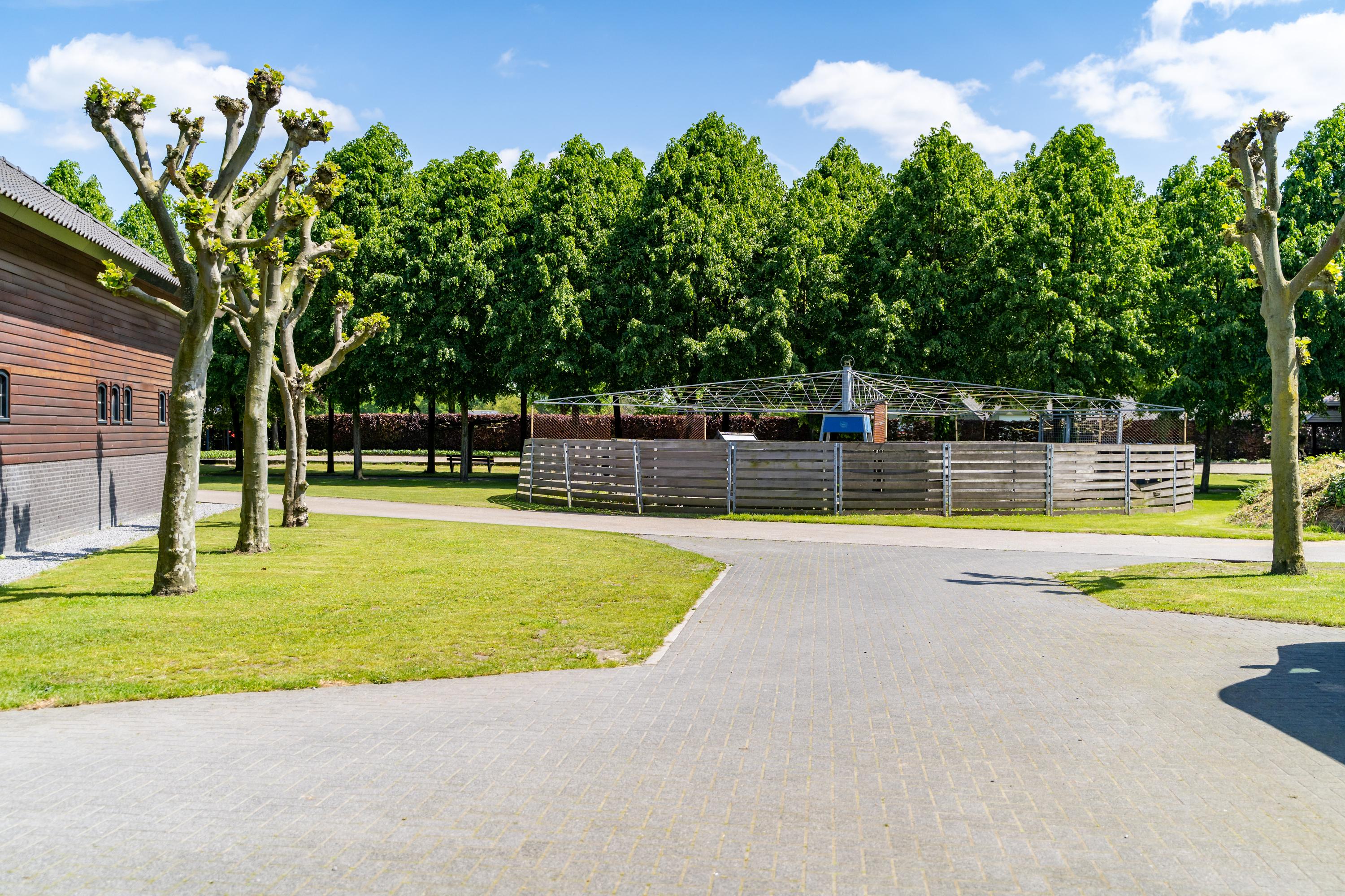 The Liberty horse walker next to the stable is suitable for five horses. The horse walker has a clinker floor and a wooden fence.