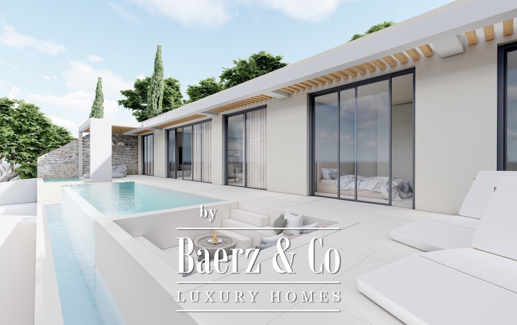 Occupying a 1,000 m² plot, the villa offers a total living area of 180 m². Each of its three bedrooms features an en-suite bathroom and walk-in closet, balancing privacy and comfort. Expansive glass surfaces invite sea light into the open-plan living space, complemented by a smartly equipped kitchen and dedicated wine cellar. Outdoor living unfolds beside an infinity seawater pool, Jacuzzi, and a stone terrace with an outdoor fireplace, all oriented toward the Ionian horizon. Mediterranean landscaping and ambient lighting shape tranquil evenings, while an outdoor shower enhances summer ease.