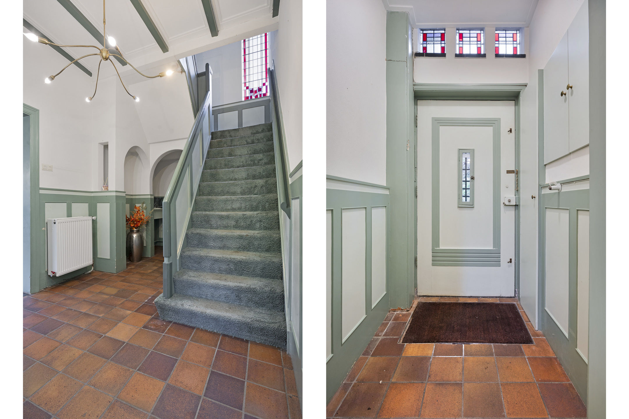 Na binnenkomst via de entree kom je in de centrale hal. De bordestrap, het glas-in-lood en de panelen vormen het statige hart van de woning en verbinden alle vertrekken en verdiepingen met elkaar. Aan de voorzijde ligt de L-vormige woonkamer met aan de ene zijde een zitgedeelte met haard en openslaande deuren naar de tuin en aan andere zijde plaats voor bureau, tv-hoek of formal dining.