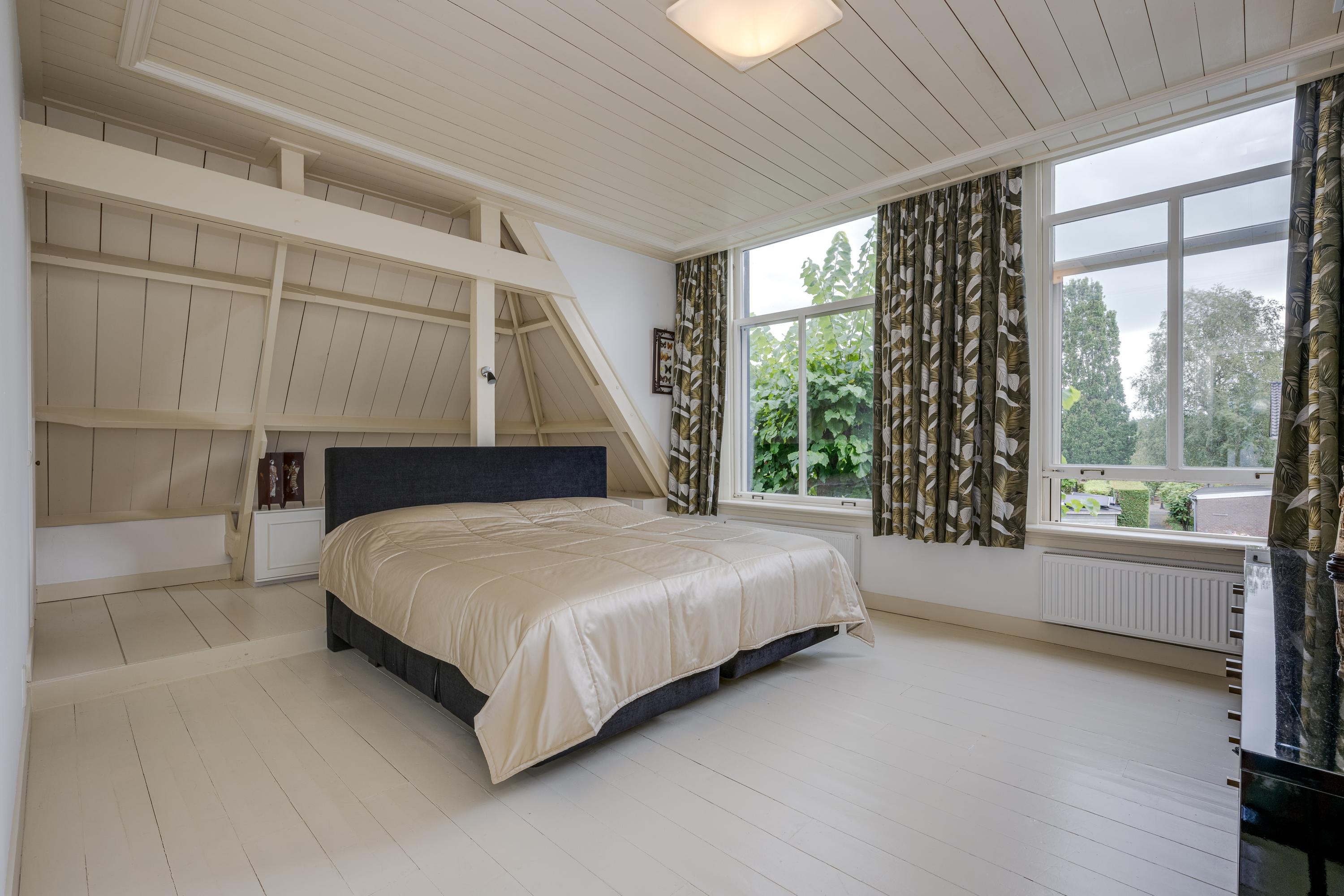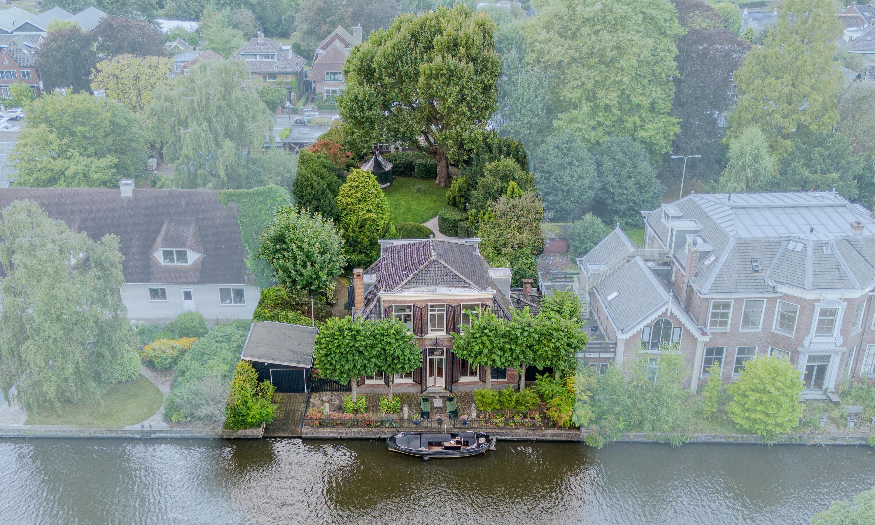 Upstairs, four serene bedrooms offer leafy, water-facing perspectives; the master suite includes a walk-in wardrobe and a refined bathroom featuring granite floors, underfloor heating, a sunken bath, sauna, and Turkish bath. Three bathrooms in total assure comfort and privacy. The estate’s boathouse allows effortless river access, opening leisure to the waterways of De Kaag and the Groene Hart.