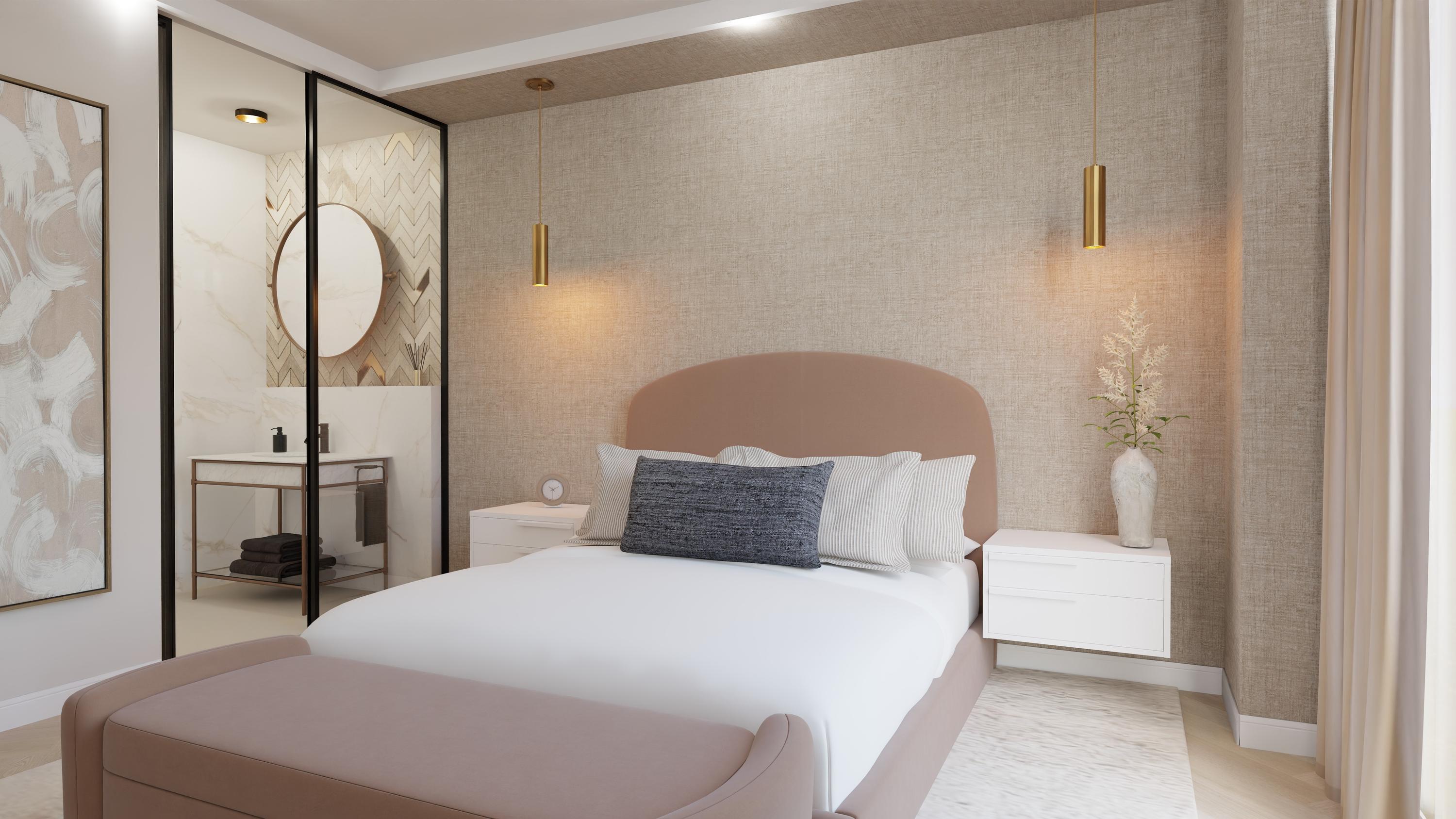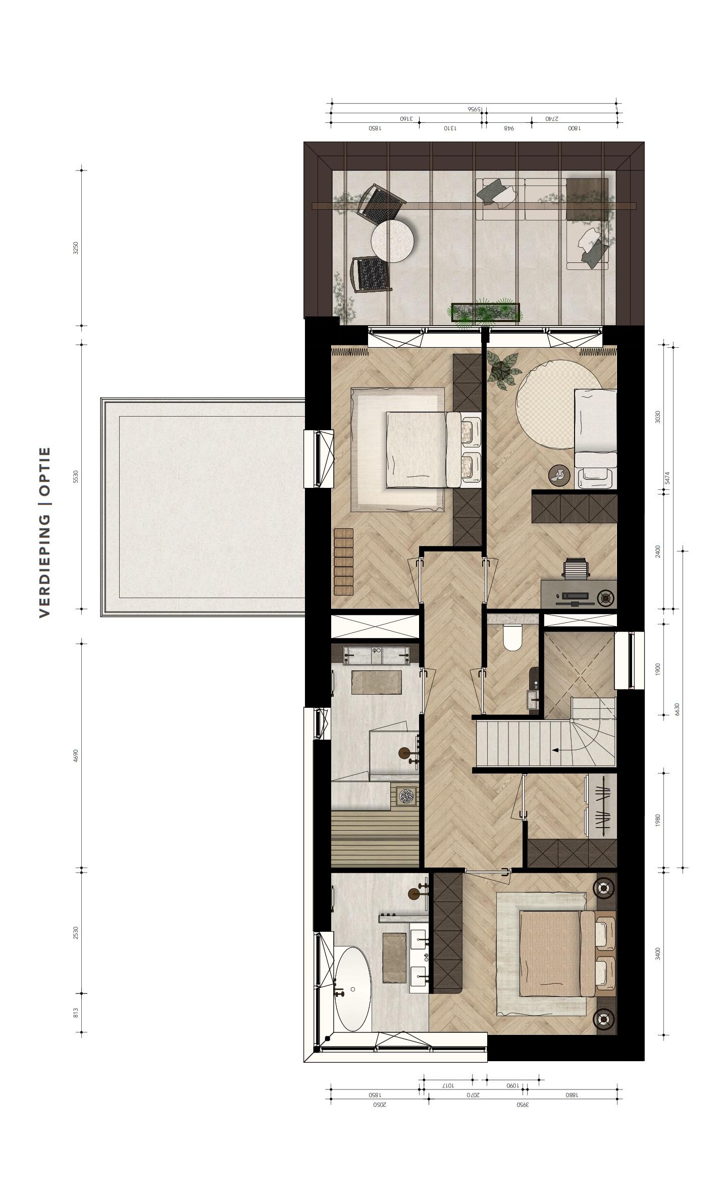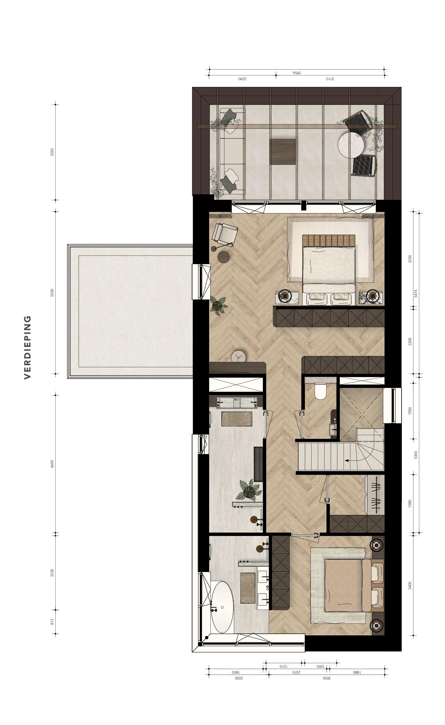 The cubist architecture provides plenty of space. The wonderfully large bedroom has access to a large 20m² roof terrace with a pergola, where you can enjoy a cup of coffee or a good book. The second spacious bedroom has its own en-suite bathroom. There is also a second bathroom, a separate toilet, and a storage cupboard.