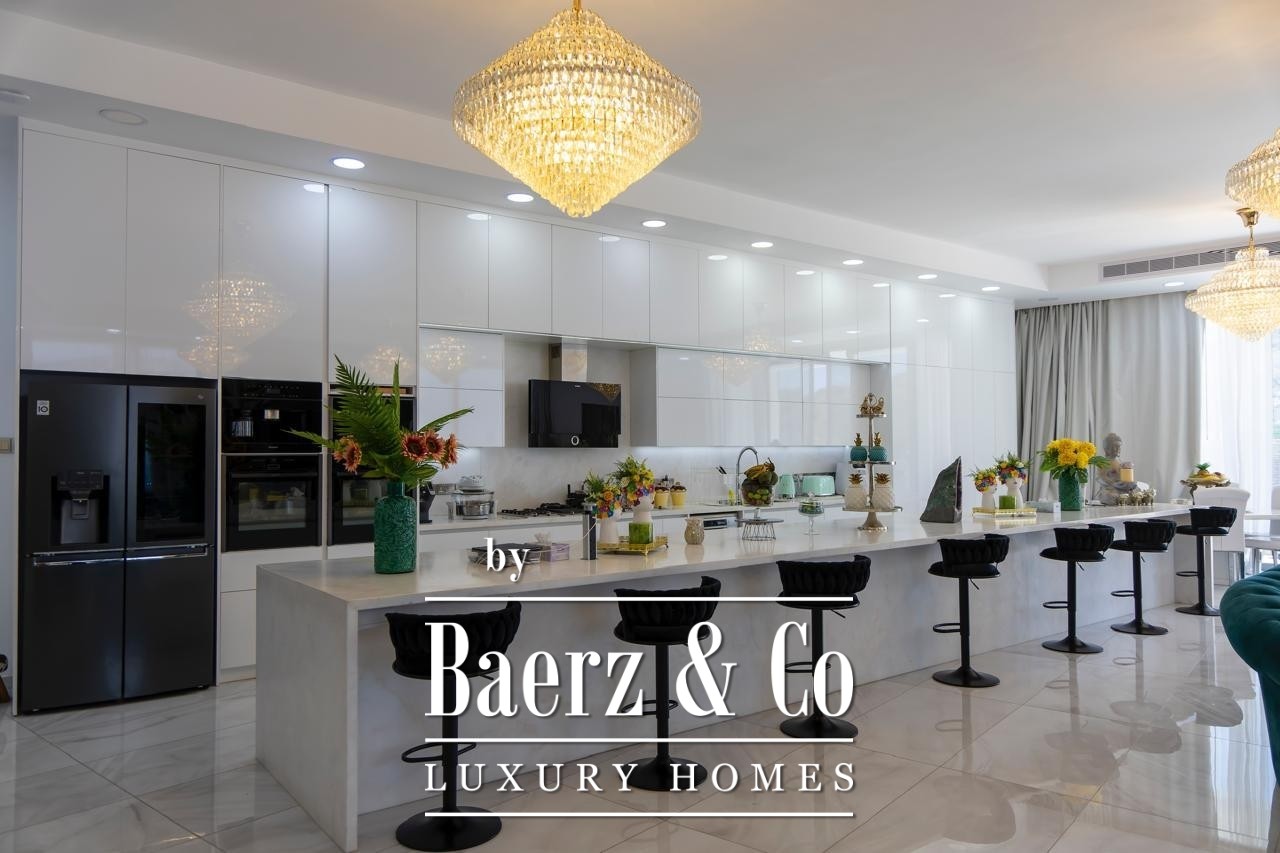 The designer kitchen, equipped with two ovens, both electric and gas stoves, a barbecue grill and advanced appliances, flows towards an outdoor covered kiosk and secondary kitchen, ideal for entertaining. Outdoors, the villa transitions into a private resort, anchored by a 53-meter saltwater pool with integrated jacuzzi and surrounded by landscaped gardens, mature fruit trees and a private mini football pitch.
