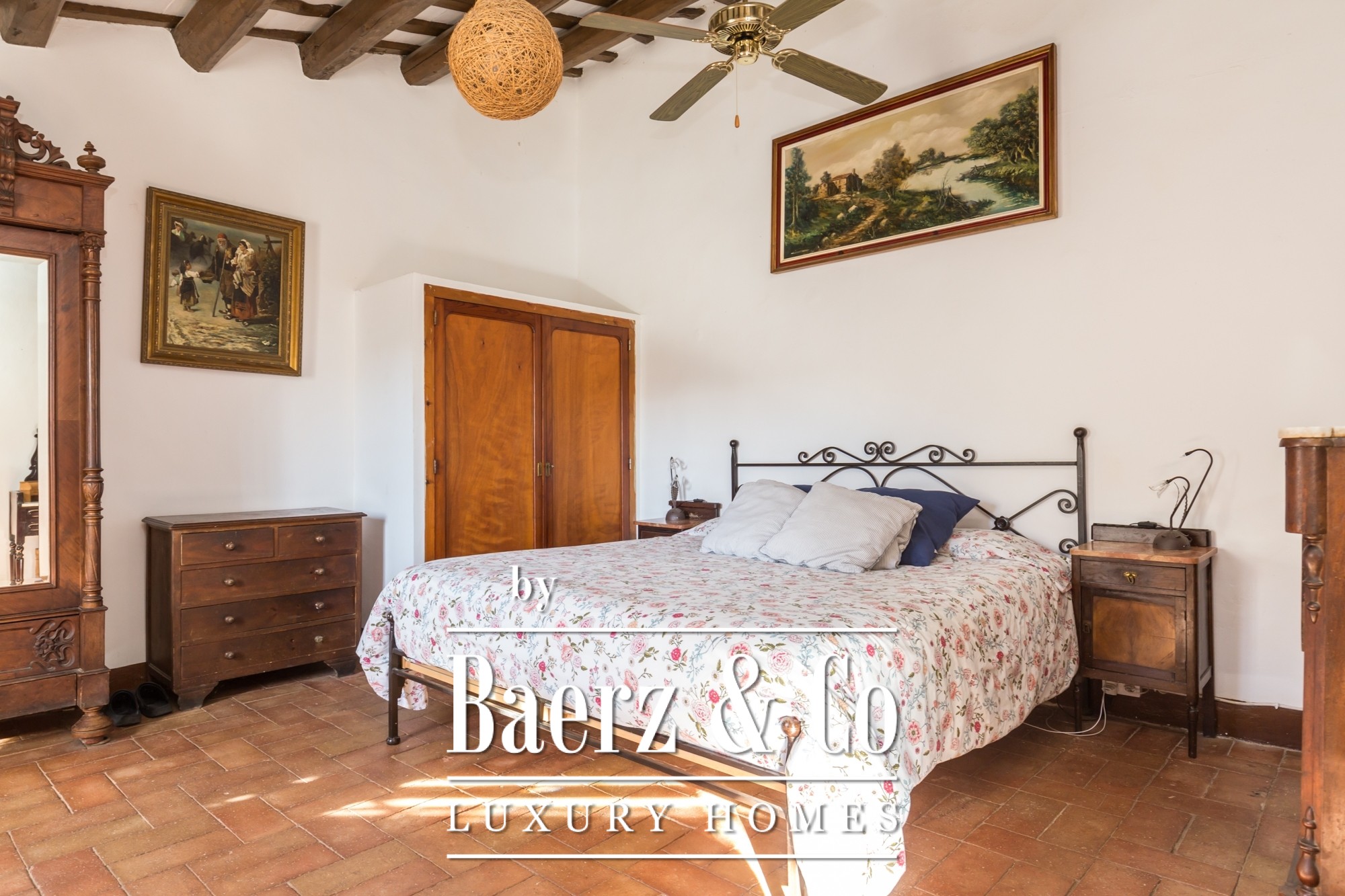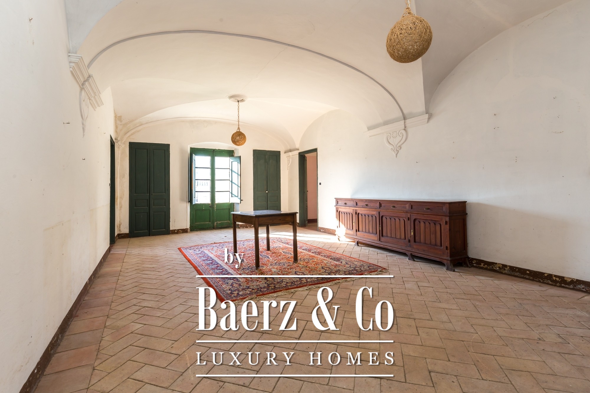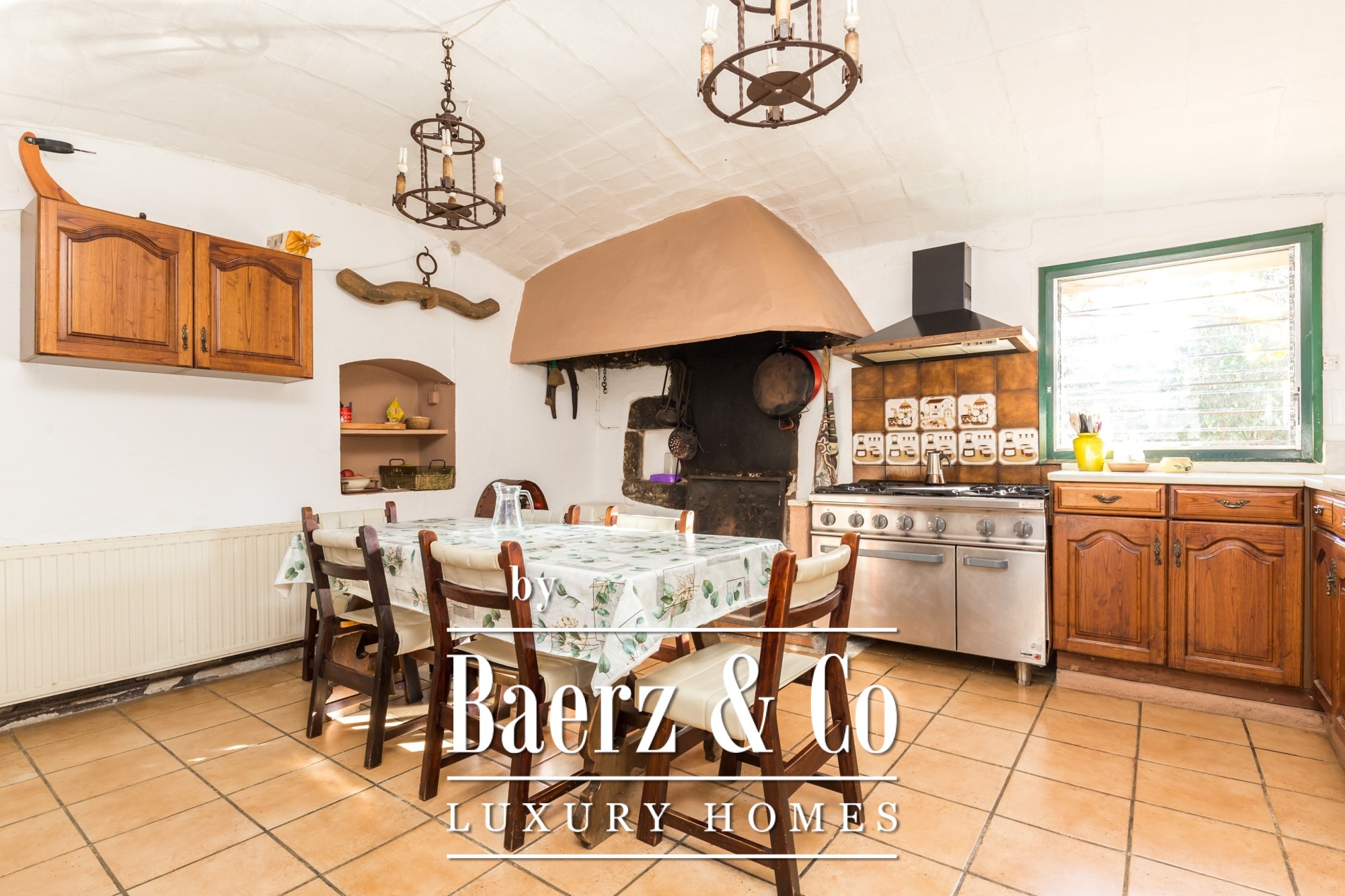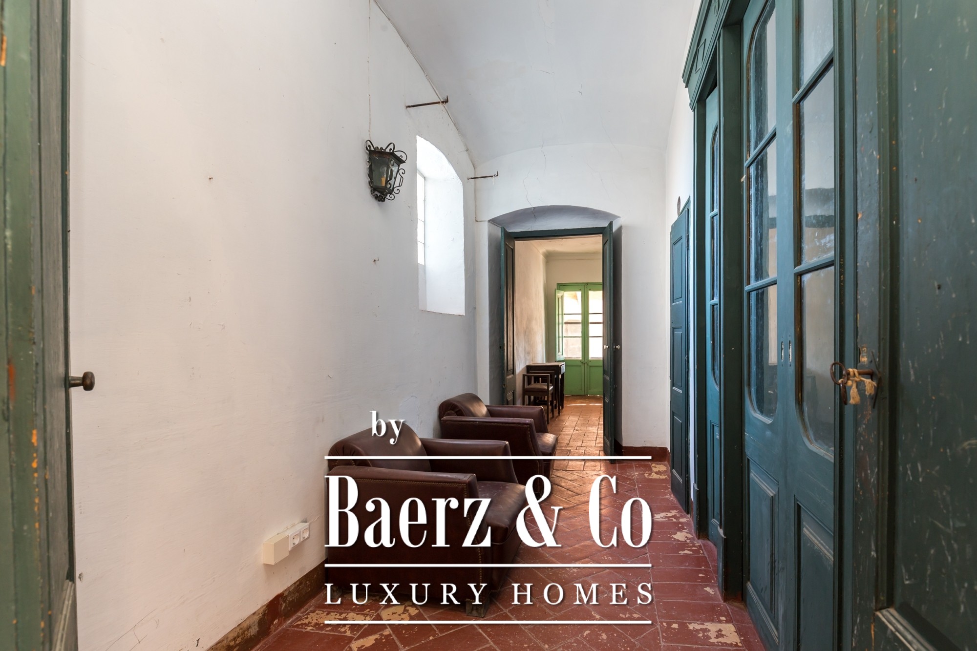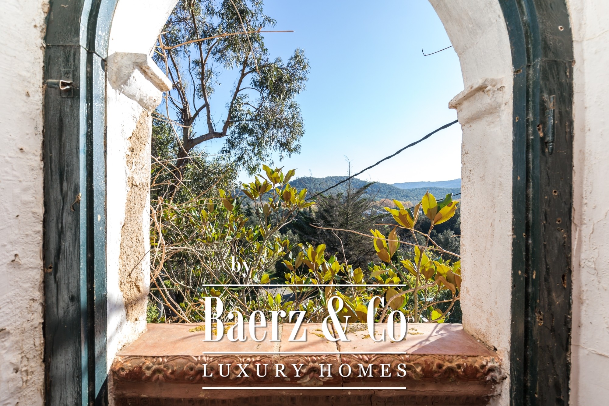The main residence features seven bedrooms and four bathrooms, with suites on the upper level offering private terraces and sweeping vistas. High ceilings, light-filled rooms, and original architectural details reflect its historical character. There are two dining and living rooms, a voluminous family kitchen, and an office-library connecting to a serene private garden. Generous storage and auxiliary buildings convey practical flexibility.