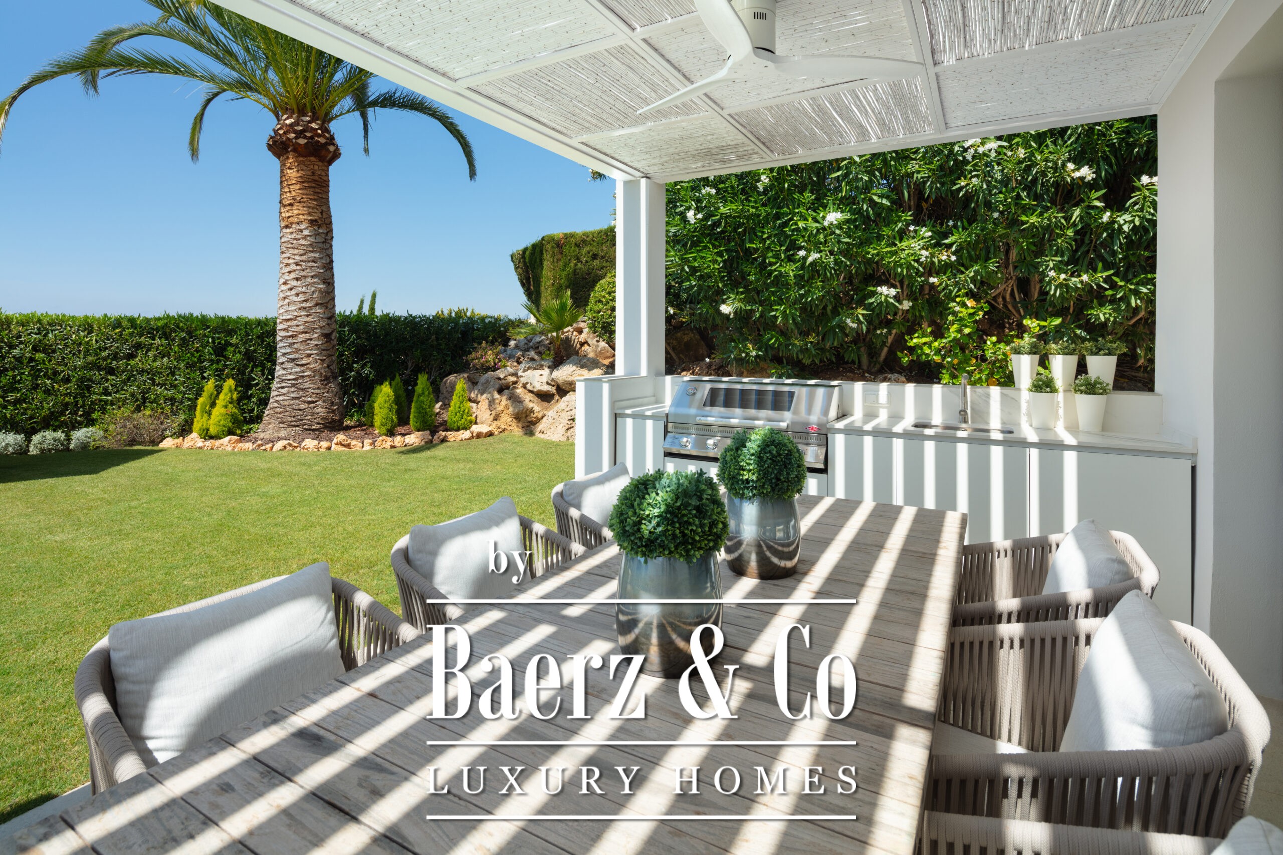 The position of the property offers complete privacy from all sides, but remains open to the light and sky all around. At the rear of the property tucked out of sight, you find a covered outdoor gym and training area for those who want a space to exercise from home. The main living area is connected to a covered outdoor terrace area, which includes an outdoor sitting areas plus an outdoor kitchen BBQ and dining area, which sits up to 8 people. Here you also find outdoor fans for the warmer summer days and built in external Bowers & Wilkins speakers, connected to the internal Sonos system. The pool as of last summer has had a new powerful heating system installed. Wrapped around the entire property you find a top spec security system, including cameras, motion censors, and perimeter lasers, as well as internal cameras and motion censors all linked to a security company. This is truly a stunning property offering an exceptional opportunity, which is lock up and go, low maintenance, all while being located close to amenities.