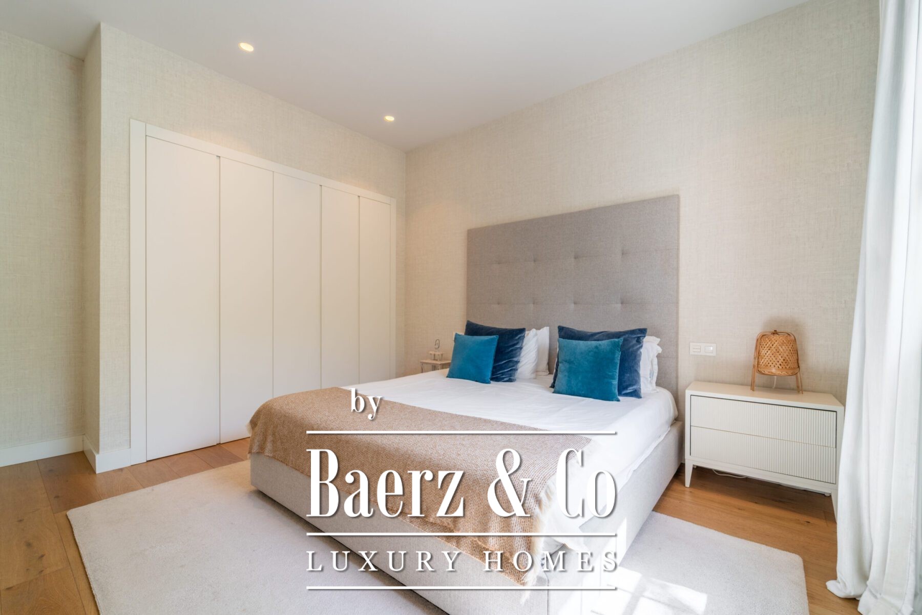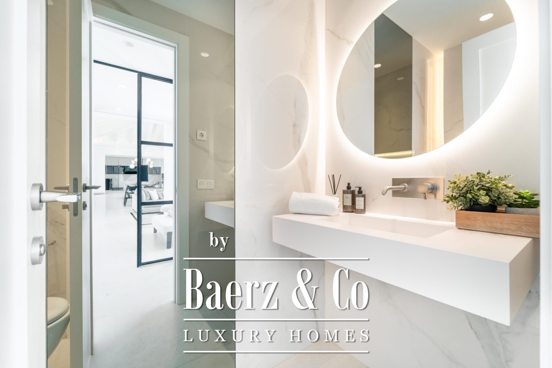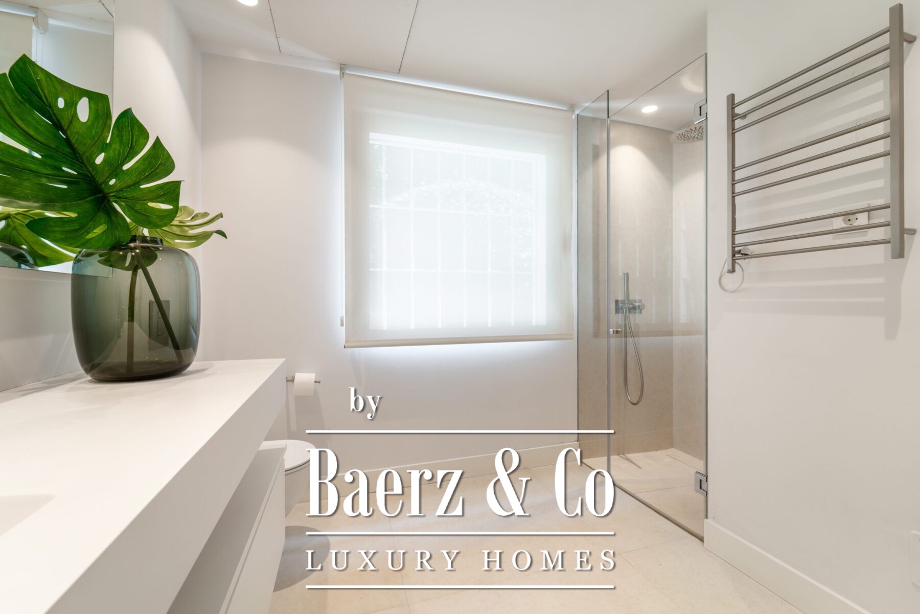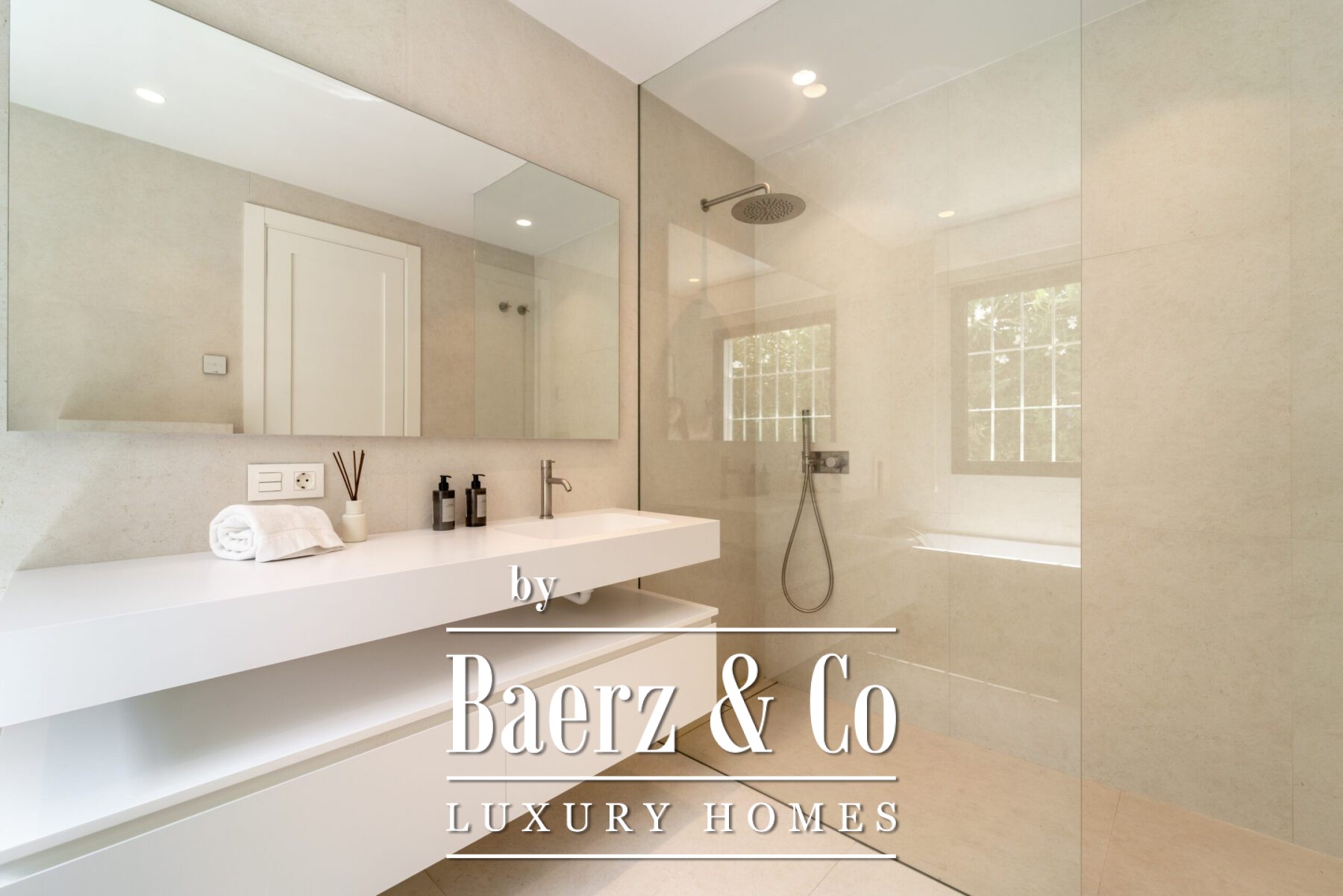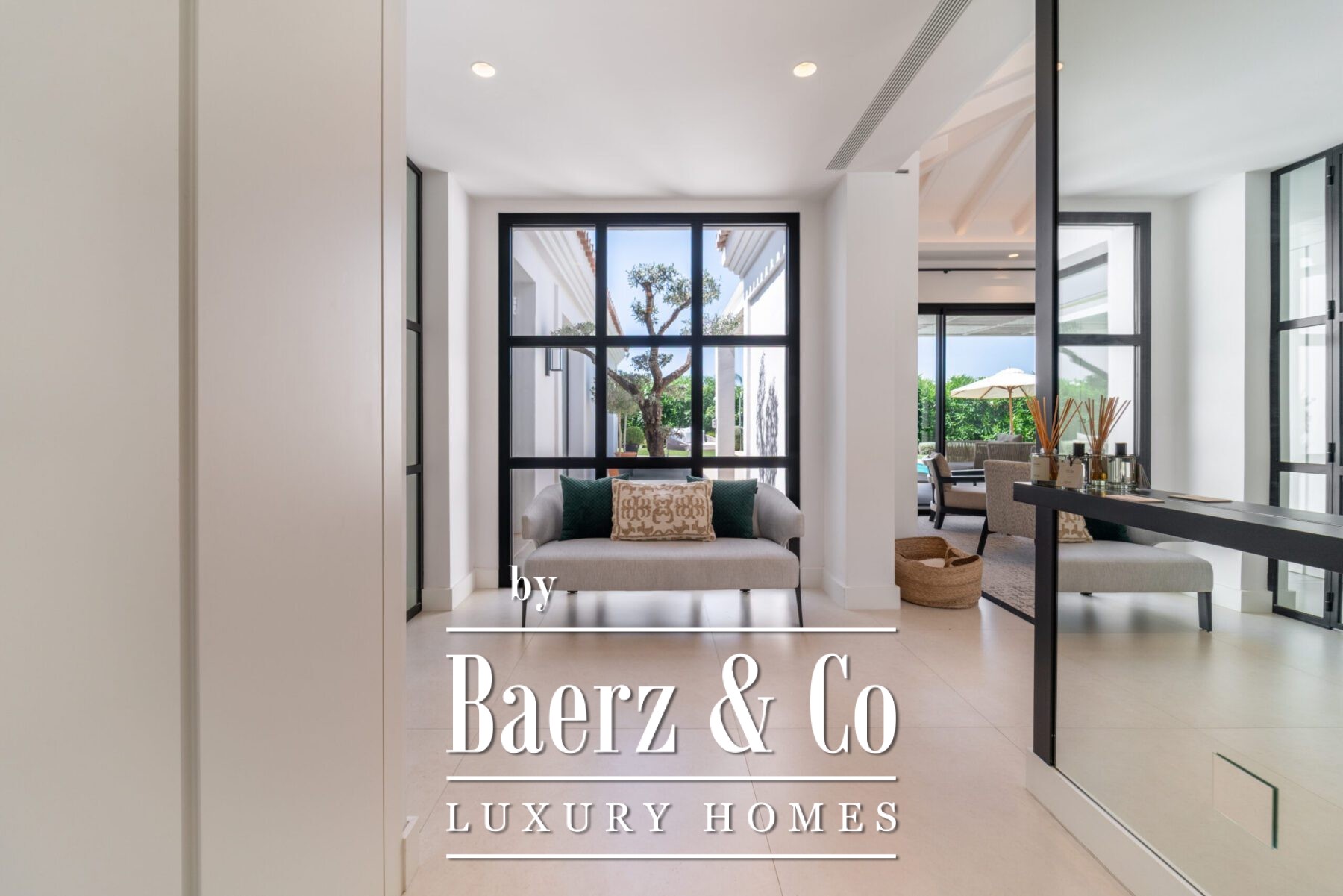 The villa welcomes you into a gorgeous courtyard, with the main feature being a large sculped olive tree, and landscaped entrance, with the back drop of large floor to ceiling colonial style black matte windows, allowing the outside to feel inside. Here at the entrance you find the closed Garage space for convenient parking, with then only 12 steps down into the property. As you enter the property you are greeted with a light and spacious hallway which leads you to a bright open plan living area with modern fireplace. The living room is connected to a spacious dining area which sits 8 guests and onto the modern sleek kitchen and breakfast bar, and off this area a large separate utility room . With a double height pitched ceiling in the main living space, the property feels inviting, homely and spacious. Internally the property has underfloor heating throughout, Airzone zonal A/C, and built in Sonos speaker systems. The property has been designed to create as much light and utilise its orientation as possible, and to create a real indoor-outdoor living experience. The villa has been perfectly distributed to offer large bedroom, wardrobe and en-suite bathroom space, in each of the rooms, tastefully done with the use of Casamance wallpaper and wooden flooring and modern sleek bathrooms. The master bedroom is especially well executed with its double height pitched ceilings and two double terrace doors, leading out into the garden and pool area which offers bright, green views.