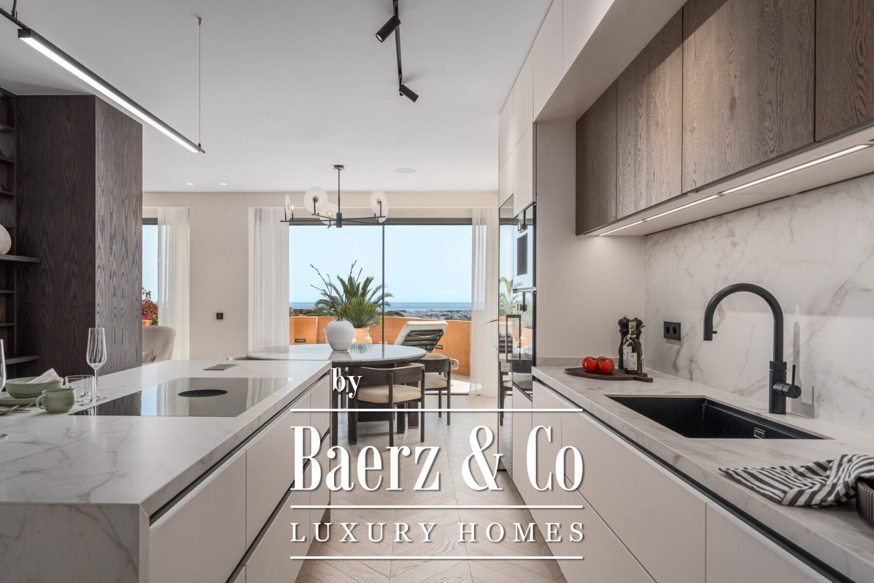 Apartment Marbella presents a rare vantage point above the prestigious streets of La Cerquilla, Nueva Andalucía. This fully renovated ground floor residence spans 215 m² and offers panoramic views of the Mediterranean Sea, the mountains, and famed golf courses, establishing a sense of harmony between sophisticated interior design and the surrounding landscape.