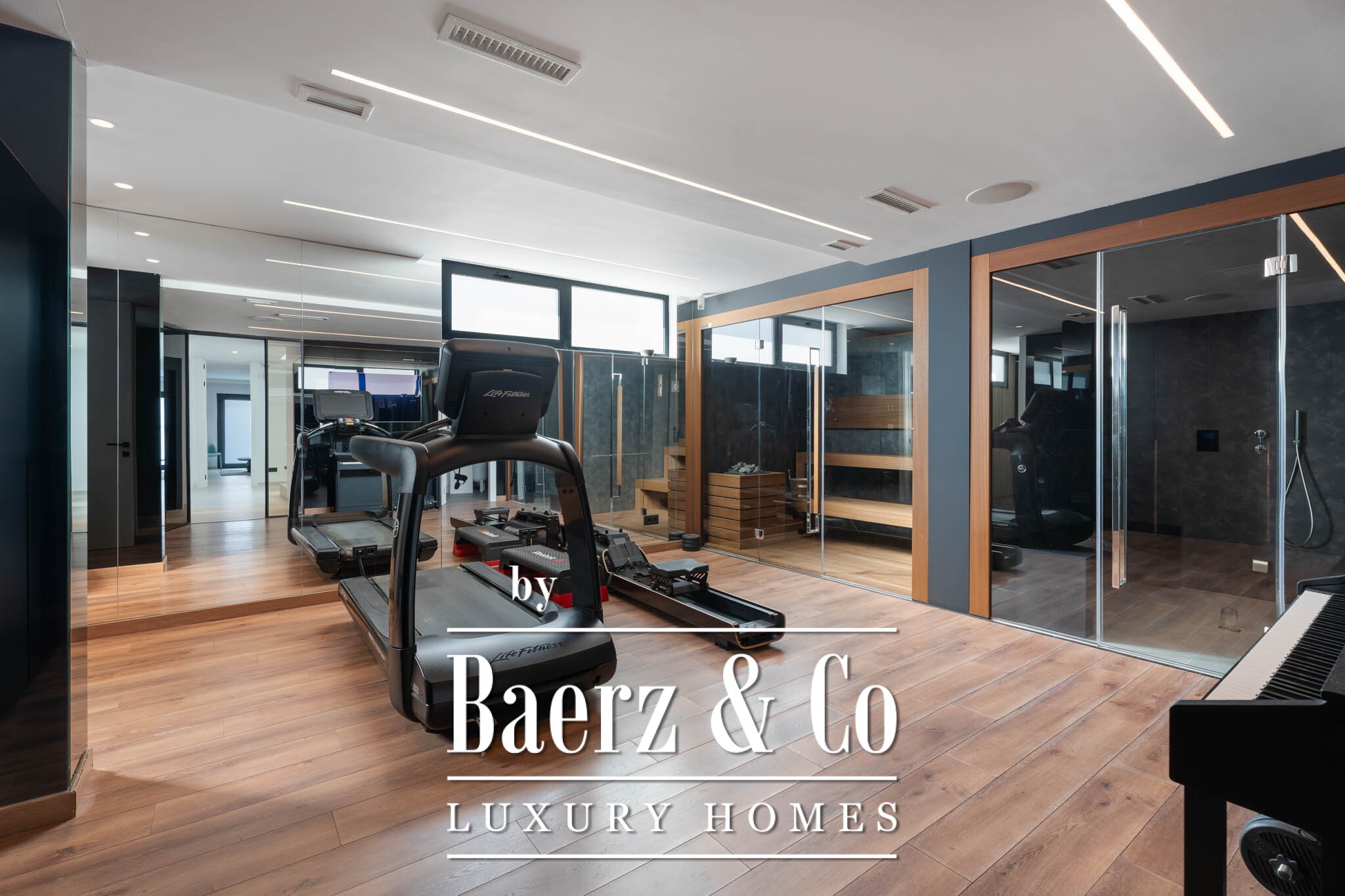 Six bedrooms, each with an en-suite bathroom, ensure comfort and seclusion. The principal suite enjoys unhindered sea views and access to its own terrace. Elevated above, a solarium with jacuzzi frames wide-reaching vistas from the golf course to the distant African shore. Entertainment and wellness areas reside on the lower floor, featuring a gym, sauna, cinema room and dedicated gathering spaces. A large garage with turning platforms enhances convenience.