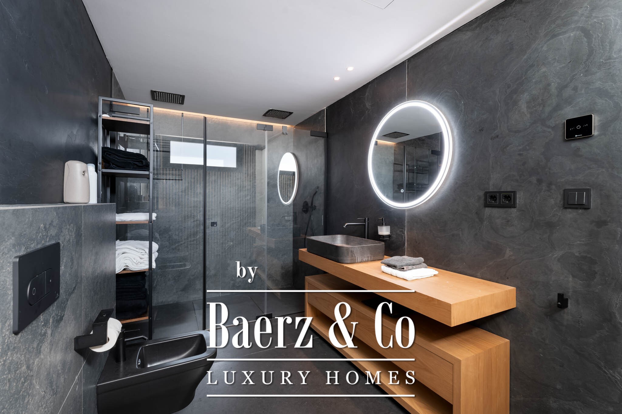 The design reveals an openness to light and space. Encompassing 794 m² on a 1,500 m² plot, the interiors are arranged across several levels and accessed by a lift. Expansive living areas extend seamlessly onto the terrace and garden, with large windows dissolving the boundary between inside and out. An infinity pool draws the eye toward the horizon, merging architecture and landscape.