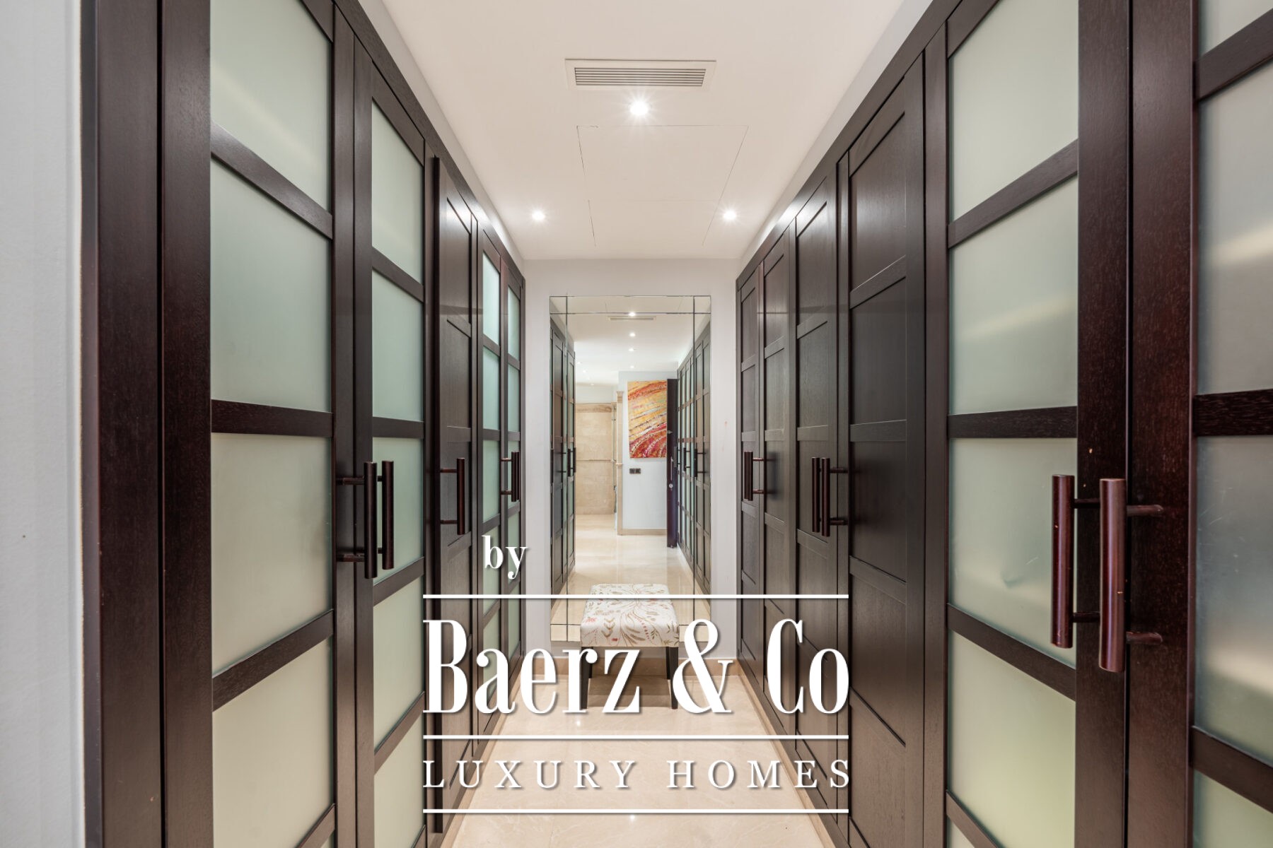 The apartment’s core comprises three bedrooms, each with en-suite bathroom. The primary suite combines a dedicated walk-in closet and a private terrace, offering breathtaking sea views. Two additional guest toilets provide further convenience for both residents and visitors.