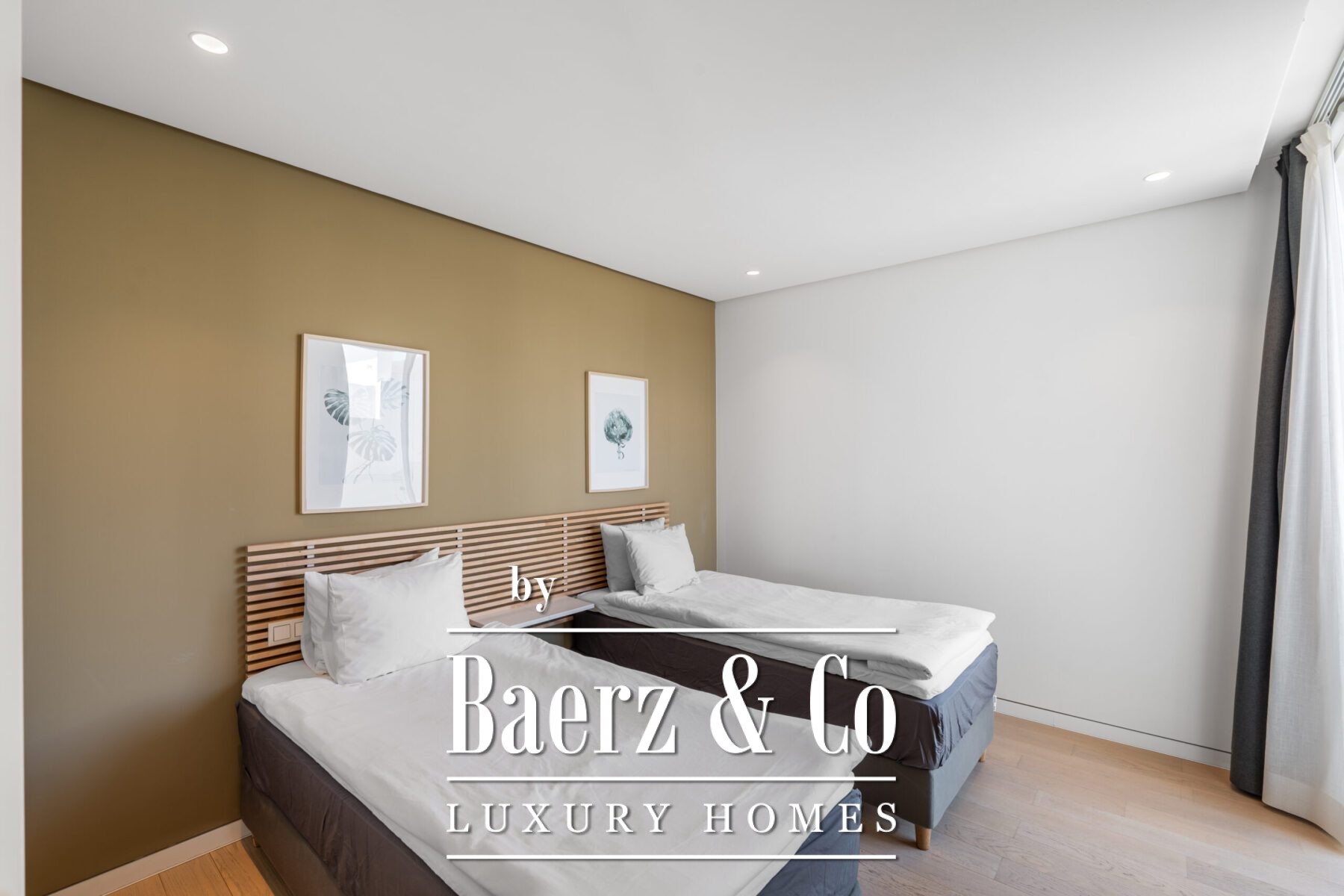 The open-plan interiors balance space and intimacy, anchored by a fully equipped kitchen and a living-dining area that opens directly to the expansive terrace. There are three bedrooms, each with its own en-suite bathroom, including a principal suite with walk-in wardrobe and terrace access. A guest toilet and a dedicated laundry with extra storage further elevate daily comfort. The penthouse is sold fully furnished, features air conditioning and underfloor heating, and includes a two-car garage and storage room.
