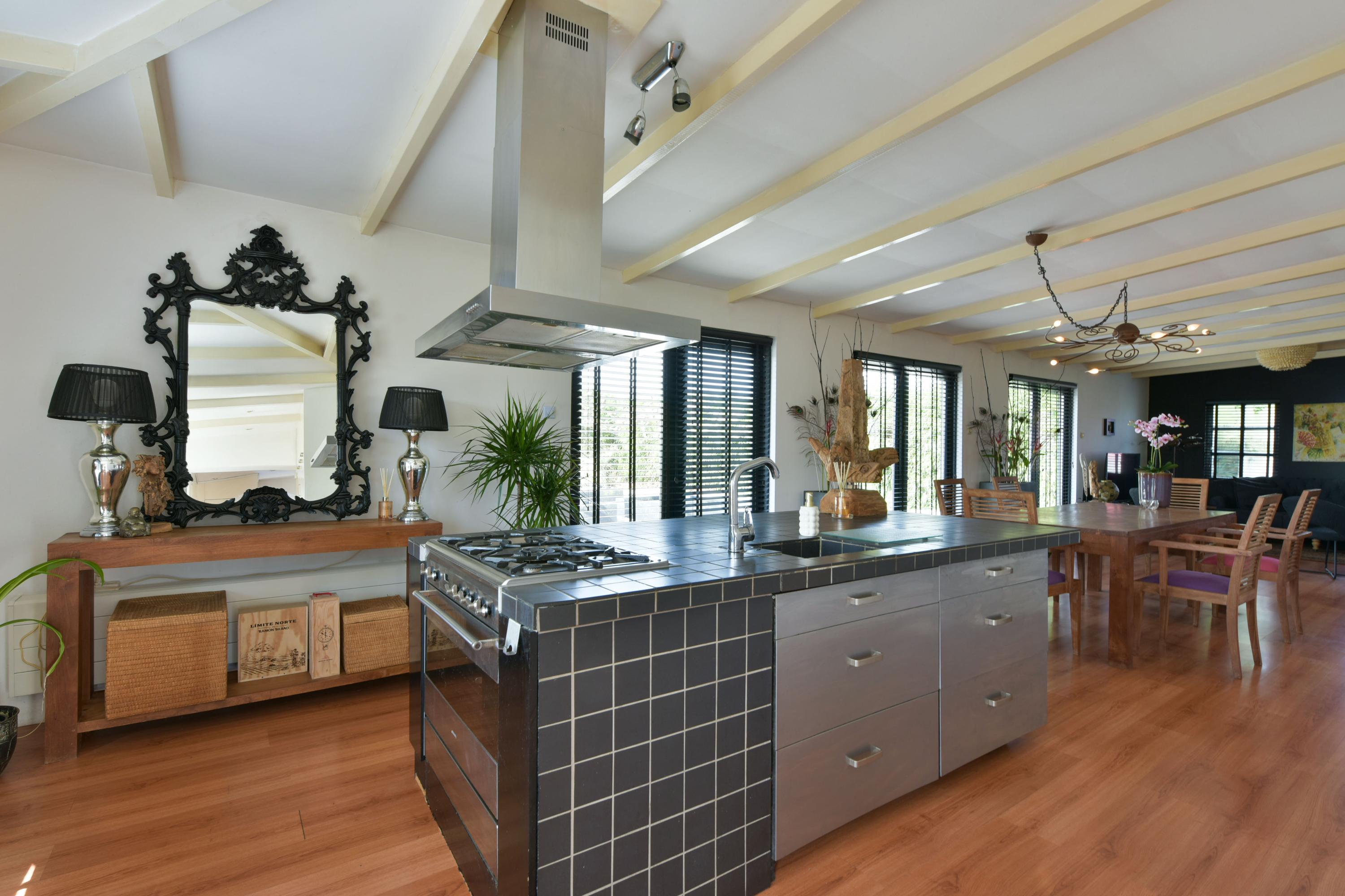 The open kitchen is spacious and fully equipped. The large cooking island with ample drawers offers plenty of workspace and storage, while the cabinet wall provides additional storage. The kitchen is fitted with a gas stove with extractor hood, a convection oven, refrigerator, and dishwasher. A practical detail: the washing machine, dryer, and central heating boiler are neatly concealed within various kitchen cabinets.
