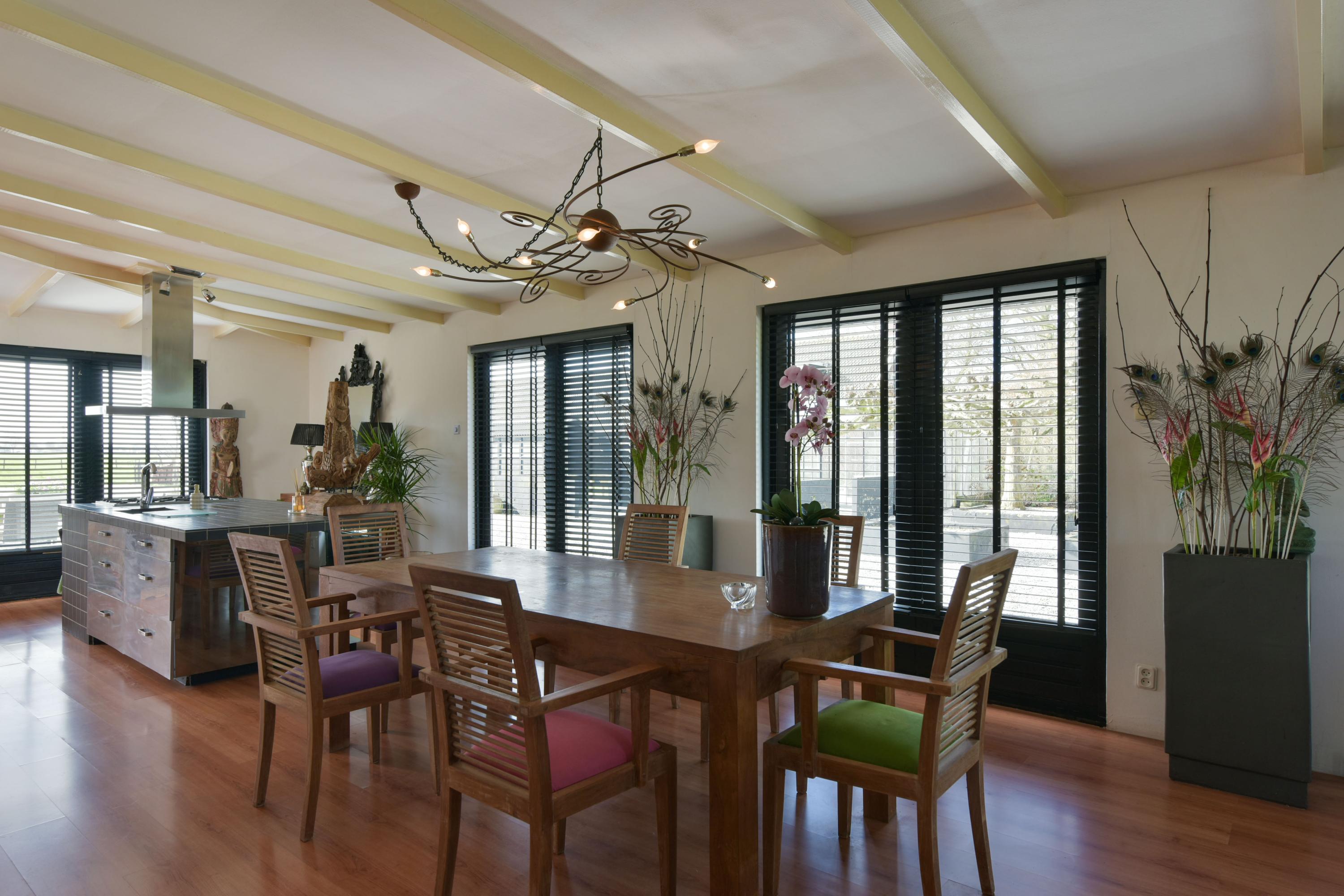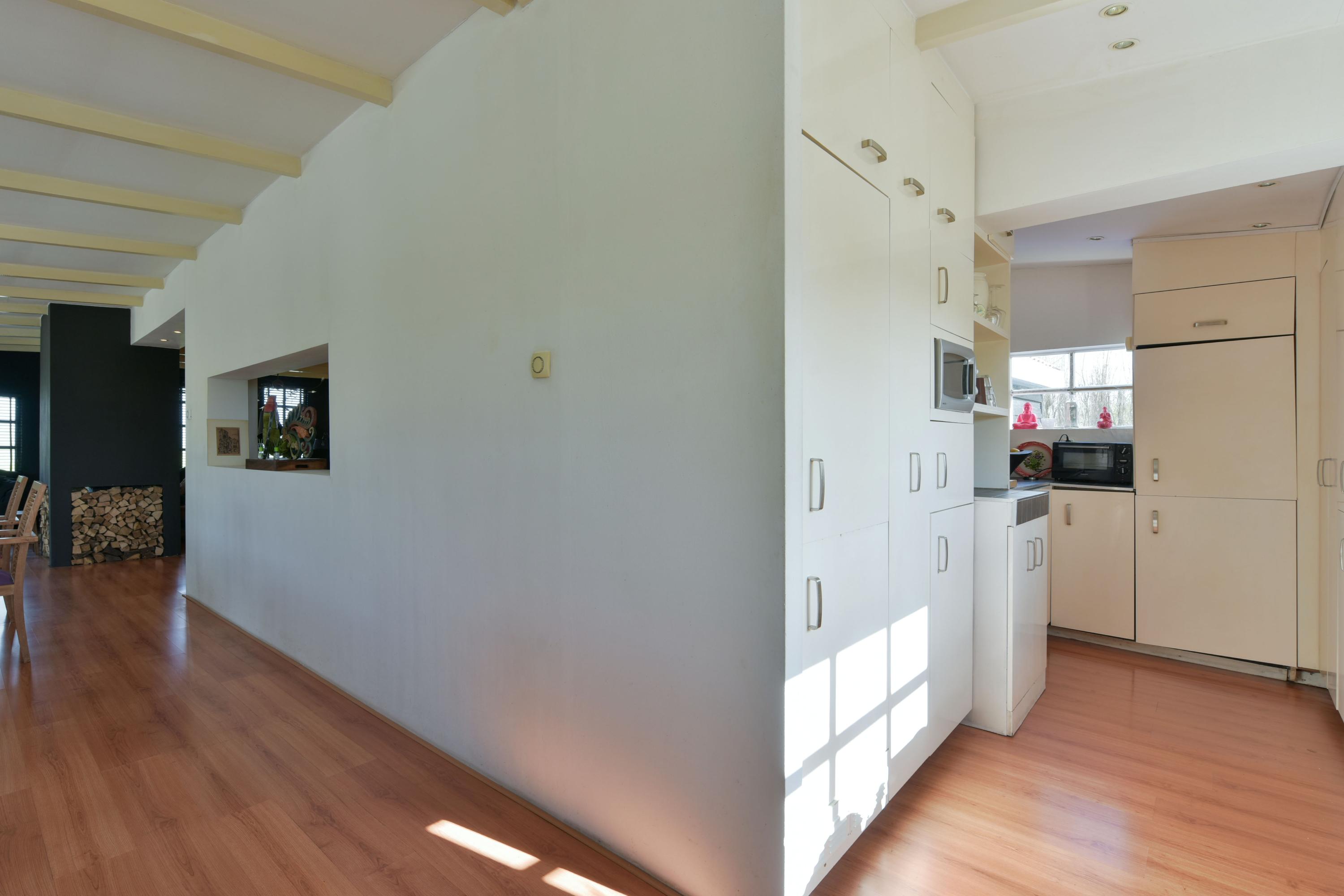 Upon entering the hallway, you will find a wardrobe closet, a toilet with washbasin, and access to the living room. As soon as you step into the very spacious U-shaped living room, you immediately notice the abundance of space and natural light this home has to offer. Thanks to the side extension, a generous living area has been created where multiple seating and living areas can easily be arranged.