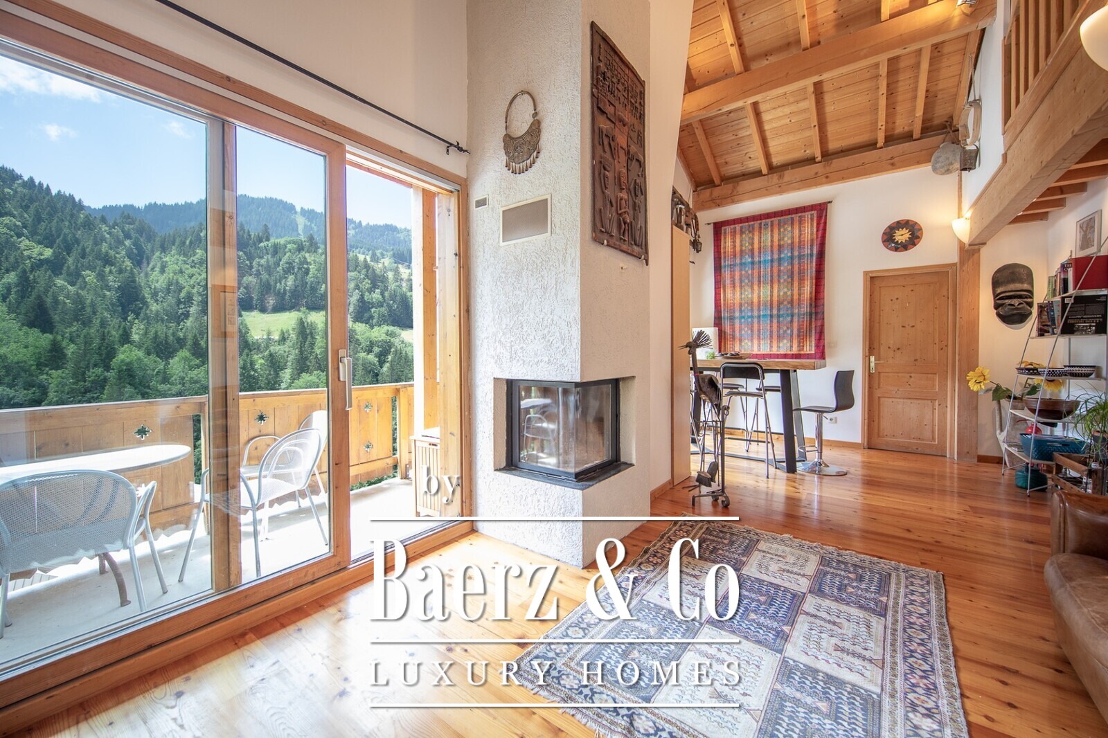 The main living area has a fireplace and large windows that allow plenty of natural light and excellent views of the surrounding forest and mountains and open out on to a sunny south west facing balcony. A mezzanine level above the lounge and kitchen serves as the dining area.
