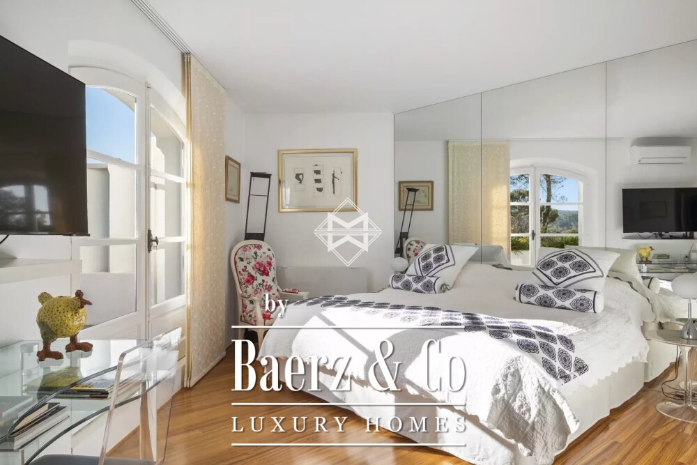 Life here extends seamlessly outdoors across a thoughtfully arranged 2,400 m² plot, which features a covered outdoor dining area and a recent pastel-hued swimming pool, organized for entertaining or tranquil retreat. Discreet amenities support daily comfort: air conditioning, internet, alarm system, and a closed garage with ample storage. A carport and irrigation system further refine the experience. This luxury villa for sale in Mougins is a statement in serenity and architectural rhythm, crafted for those who seek both discretion and a true sense of place.