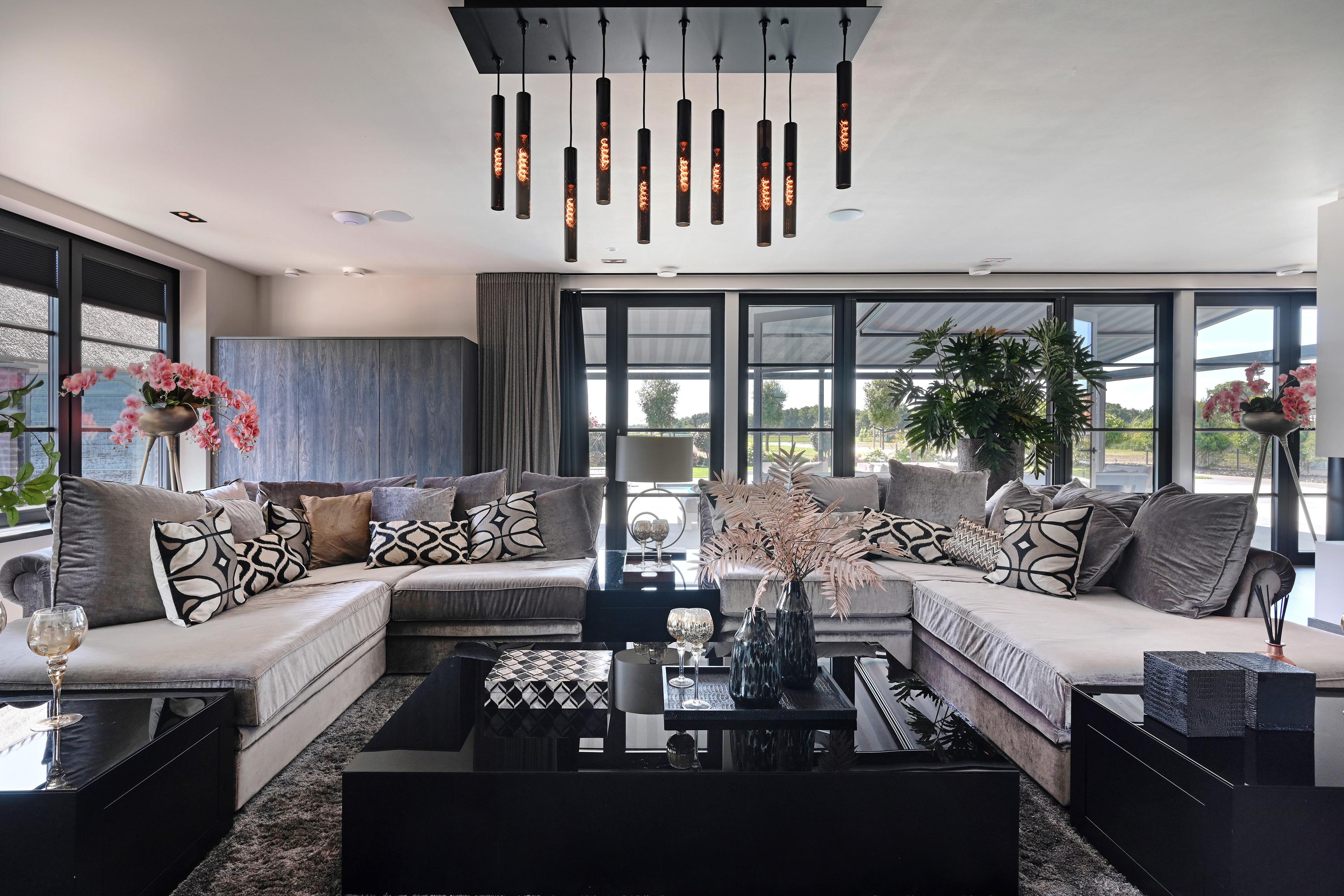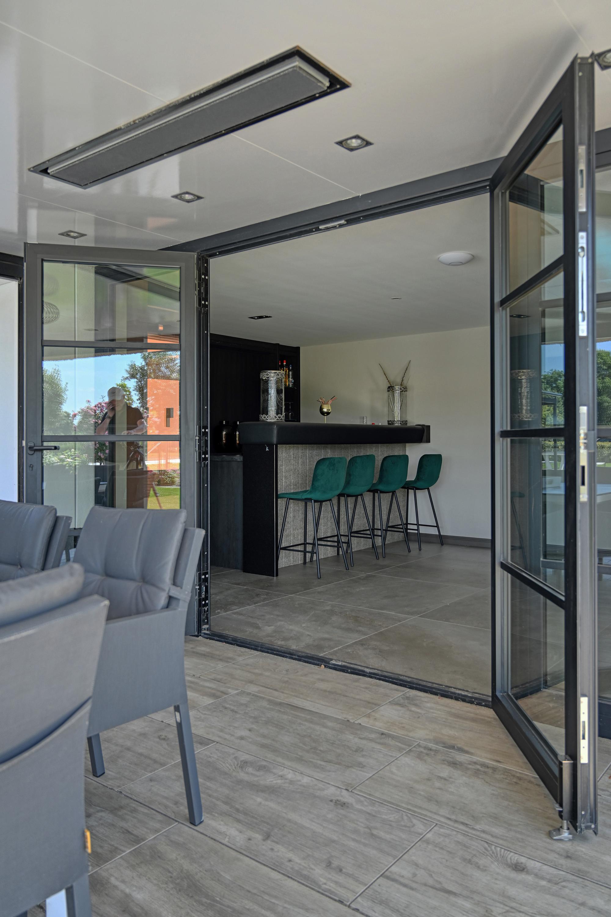 The spacious living room, featuring a room divider with two gas fireplaces, has a warm and inviting atmosphere and direct access to the garden.