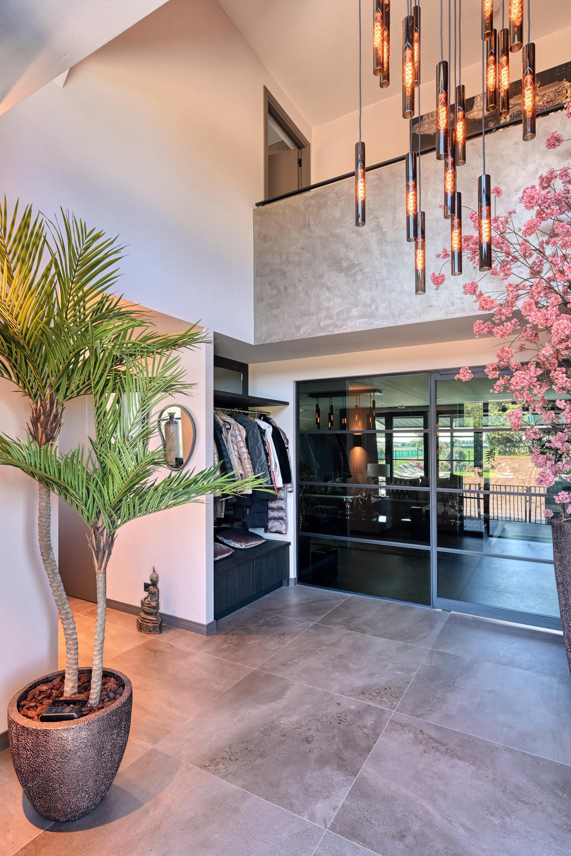 Upon entering, you’ll find a spacious entryway with a loft and a beautiful staircase; it immediately becomes clear that this villa was designed with a sense of space and elegance. Steel doors with smoked glass provide access to the living room.
