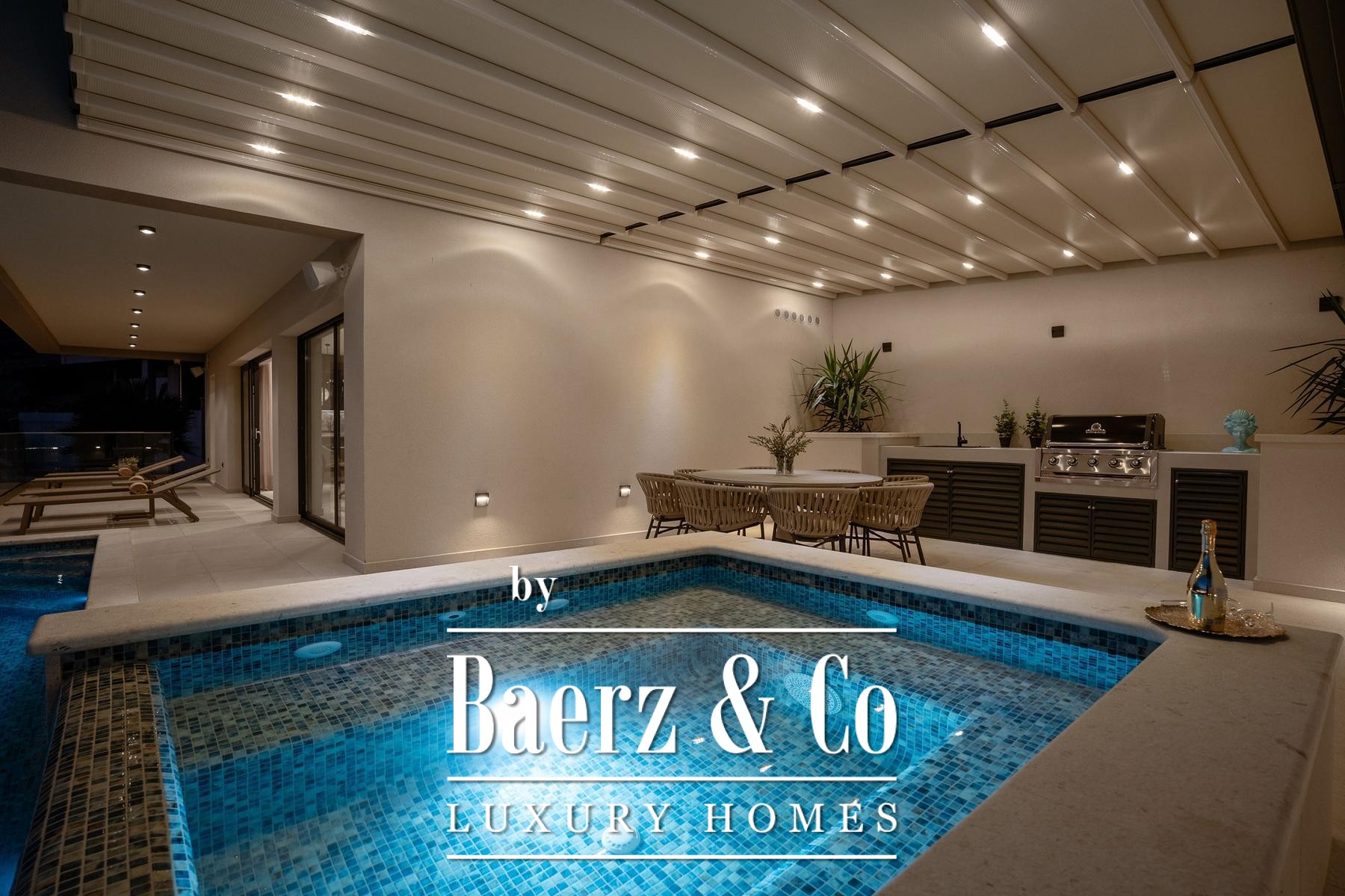 Throughout the villa, underfloor heating, inverter air conditioning, and advanced insulation deliver comfort and efficiency. High-quality stone, anthracite aluminium, and triple-glazed glass affirm a commitment to construction detail and sound privacy. The top floor hosts a secluded suite with a private terrace, jacuzzi, and movable pergola.