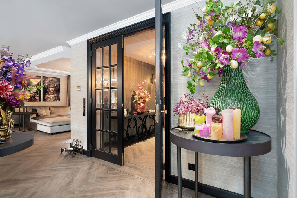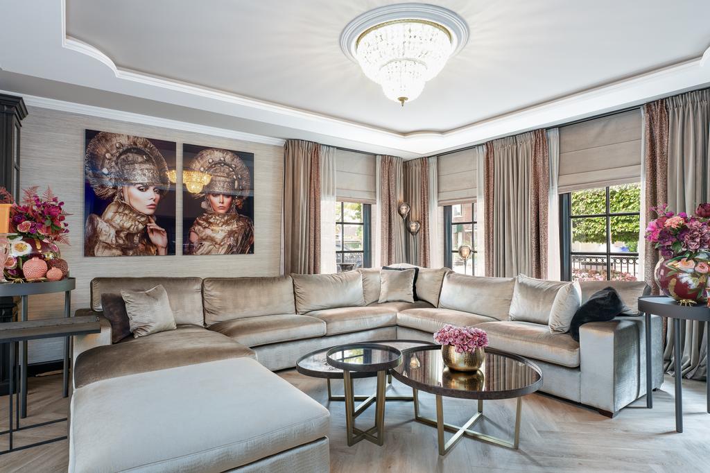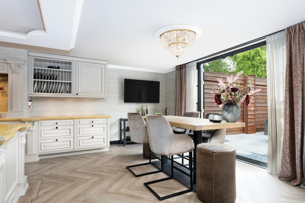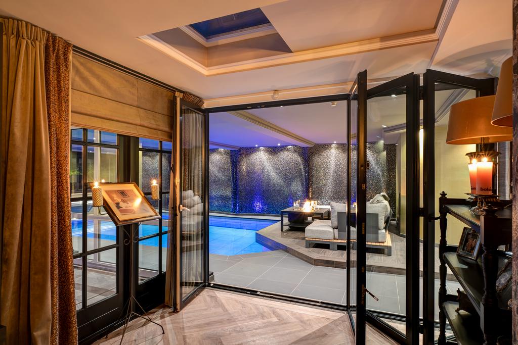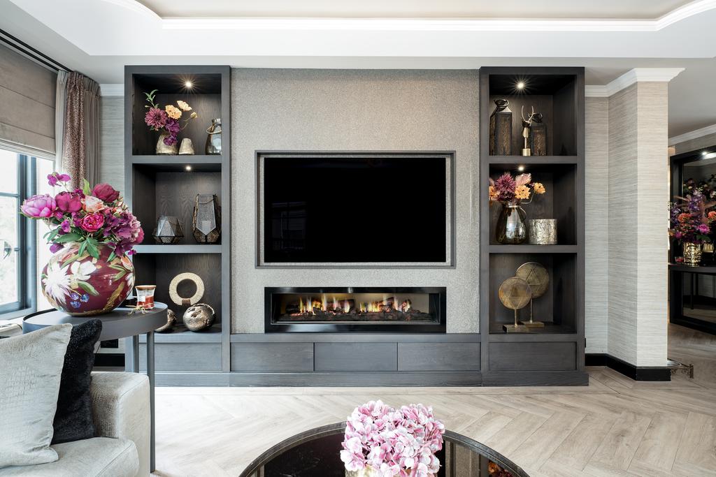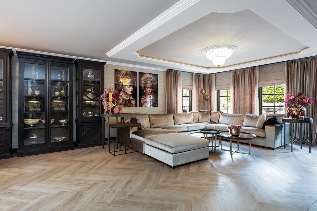 From the moment you step inside, it is clear that this is no ordinary home. The grandeur of the villa is accentuated by high-end finishes such as herringbone parquet floors, Italian marble bathrooms, luxurious window treatments, and handcrafted built-in wardrobes. The spacious living room features a stylish cinewall with a large flatscreen TV and an atmospheric fireplace (Anneke Dekkers).